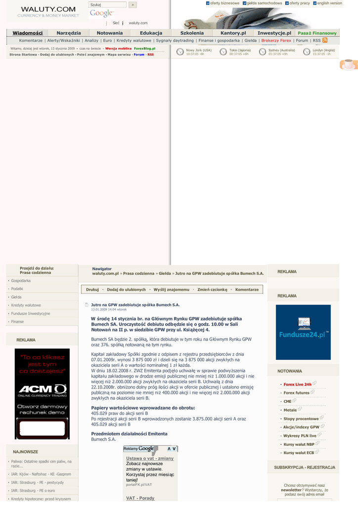 Szukaj oferty biznesowe » giełda samochodowa oferty pracy english version j Sieć n k l m n i waluty.com j k l m Wiadomości Narzędzia Notowania Edukacja Szkolenia Kantory.pl Inwestycje.pl Pasaż Finansowy Komentarze | Alerty/Wska źniki | Analizy | Euro | Kredyty walutowe | Sygnały daytrading | Finanse i gospodarka | Giełda | Brokerzy Forex | Forum | RSS Witamy, dzisiaj jest wtorek, 13 stycznia 2009 Strona Startowa Dodaj do ulubionych Przejdź do działu: Prasa codzienna czas na świecie Pole ć znajomym Wersja mobilna ForexBlog.pl Mapa serwisu Forum RSS Nowy Jork (USA) 10:37:05 -6h Tokio (Japonia) 00:37:05 +8h Nawigator waluty.com.pl » Prasa codzienna » Giełda » Jutro na GPW zadebiutuje sp ółka Bumech S.A. Sydney (Australia) 01:37:05 +9h Londyn (Anglia) 15:37:05 -1h REKLAMA Gospodarka Podatki Drukuj Dodaj do ulubionych Wy ślij znajomemu Zmień czcionkę Komentarze REKLAMA Giełda Jutro na GPW zadebiutuje sp ółka Bumech S.A. Kredyty walutowe 13.01.2009 14:04 wtorek Fundusze Inwestycyjne W środę 14 stycznia br. na Głównym Rynku GPW zadebiutuje spółka Bumech SA. Uroczystość debiutu odbędzie się o godz. 10.00 w Sali Notowań na II p. w siedzibie GPW przy ul. Książęcej 4. Finanse Bumech SA będzie 2. spółką, która debiutuje w tym roku na Głównym Rynku GPW oraz 376. spółką notowaną na tym rynku. REKLAMA Kapitał zakładowy Spółki zgodnie z odpisem z rejestru przedsiębiorców z dnia 07.01.2009r. wynosi 3 875 000 zł i dzieli się na 3 875 000 akcji zwykłych na okaziciela serii A o wartości nominalnej 1 zł każda. W dniu 18.02.2008 r. ZWZ Emitenta podjęło uchwałę w sprawie podwyższenia kapitału zakładowego w drodze emisji publicznej nie mniej niż 1.000.000 akcji i nie więcej niż 2.000.000 akcji zwykłych na okaziciela serii B. Uchwałą z dnia 22.10.2008r. obniżono dolny próg ilości akcji w ofercie publicznej i ustalono emisję publiczną na poziomie nie mniej niż 400.000 akcji i nie więcej niż 2.000.000 akcji zwykłych na okaziciela serii B. Papiery wartościowe wprowadzane do obrotu: 405.029 praw do akcji serii B Po rejestracji akcji serii B wprowadzonych zostanie 3.875.000 akcji serii A oraz 405.029 akcji serii B Przedmiotem działalności Emitenta Bumech S.A. IAR: Kijów - Naftohaz - KE -Gazprom IAR: Strasburg - PE - pestycydy Forex futures CME Metale Stopy procentowe Akcje/indexy GPW Wykresy PLN live Kursy walut ECB Ustawa o vat - zmiany Zobacz najnowsze zmiany w ustawie. Korzystaj przez miesiąc taniej! portalFK.pl/VAT IAR: Strasburg - PE o euro Kredyty hipoteczne: przed kryzysem było drożej Forex Live 24h Kursy walut NBP NAJNOWSZE Paliwa: Ostatnie spadki cen paliw, na razie... NOTOWANIA VAT - Porady Szukasz informacji o SUBSKRYPCJA - REJESTRACJA Chcesz otrzymywać nasz newsletter? Wystarczy, że podasz swój adres email Szukasz informacji o podatku VAT? Zamów bezpłatny numer - VAT porady było drożej Recepta na kryzys finansowy Jutro na GPW zadebiutuje spółka Bumech S.A. IAR: Berlin - pakiet antykryzysowy NAJPOPULARNIEJSZE Od stycznia obowiązują progi podatkowe: 18- i 32-procent Dodaj www.wskazowkiksiegowe.pl/Vat Zobacz newsletter waluty.com.pl to przedsiębiorstwo działające głównie w branży maszynowej. Emitent wyspecjalizował się w świadczeniu kompleksowych usług w zakresie serwisu, utrzymania ruchu, remontu maszyn i urządzeń górniczych, lecz odbiorcami produktów i usług emitenta są również firmy z branży energetycznej. Transformacja państwowych zakładów obsługujących branżę wydobywczą spowodowała powstanie niszy, która została zagospodarowana m.in. przez emitenta. SONDA Kurs złotówki jest: Prognozy BCC na 2009 r.: Spadek wzrostu gospodarczego i wzrost bezrobocia, zmniejszenie inflacji Kurs odniesienia: 13,6 zł Na giełdzie NY cena ropy spadła poniżej 34 dolarów za baryłkę GPW i Za wysoki j k l m n Monika Przyborska j Optymalny k l m n j Za niski k l m n Ewidencja Przychodów ujaszSew rsi Łatwe Prowadzenie Księgowo ści. WypróbN Już Teraz! W Chinach rozpoczęło się napełnianie wielkich zbiorników na ropę naftową www.iFirma.pl Sytuacja na rynku ubezpieczeń po III kwartałach 2008 roku Opinie: 0 Głosuj Wyniki [+] Dodaj swoją opinię do artyku łu MF: Niższe podatki w 2009 [»] Forum UE: Przedsiębiorcy mogą odliczać podatek VAT od paliwa do samochodów z kratką, oraz o odpowiedniej ładowności Zmiany w składach indeksów giełdowych Inne artyku ły z tego działu: Czy to już koniec bessy? 2009-01-13 12:19:58 Giełdy: Pesymizm nie opuszcza światowych parkietów REKLAMA Inne artyku ły: Środa, 14 stycznia - publikacje danych makro 2009-01-13 16:07:48 2009-01-13 11:17:31 Komentarz popołudniowy do rynku złotego GPW: Polowanie na odbicie 2009-01-13 15:45:54 2009-01-13 08:57:17 Tydzień na Rynkach Finansowych- giełda, waluty, fundusze inwestycyjne SZUKAJ Giełdy: Duża strata Alcoa otwiera sezon wyników Szukaj w dziale Giełda: 2009-01-13 08:48:57 Deficyt niższy od prognoz Giełdy: Alcoa spada, Wall Street spada 2009-01-13 15:24:01 szukane wyrażenie... 2009-01-12 17:27:09 Recepta na kryzys finansowy 2009-01-13 15:45:38 2009-01-13 14:06:38 Szukaj Napisz do nas © Waluty.com 2004, ISSN 1897-9505 Wszelkie prawa zastrzeżone, kopiowanie bez zezwolenia zabronione Wy łączenie odpowiedzialności Kontakt Reklama Dla Webmasterów Mapa Wydawcą portalu jest E-financial S.A. ul. Sycowska 44, 51-319 Wrocław, tel. (+48) 71 320 71 48 Zobacz tak że: aii.pl, fundusze24.pl, investing.pl, fxtraders.eu, kantory.pl , inwestycje.pl , nieruchomo ści , wynajem.pl Top Wiadomo ści » Wszystko o Euro , Banknoty i monety euro , Kurs euro, kursy euro , Analizy walut i surowc ów , Komentarze , Dzienne , Tygodniowe , Miesi ęczne, Specjalne , Aspekty prawne forex , Kursy walut , Sygnały daytrading , Dział dla Trader ów , Wiadomo ści finasowe i gospodarcze , Tygodnik Inwestora » Prasa codzienna » Gospodarka , Podatki , Giełda, Kredyty walutowe , Fundusze Inwestycyjne , Finanse ,