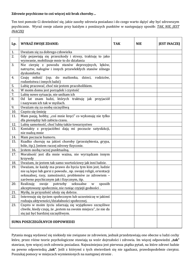 Zdrowie psychiczne to coś więcej niż brak choroby… Ten test pomoże Ci dowiedzieć się, jakie zasoby zdrowia posiadasz i do czego warto dążyć aby być zdrowszym psychicznie. Wyraź swoje zdanie przy każdym z poniższych punktów w następujący sposób: TAK, NIE, JEST INACZEJ Lp. WYRAŹ SWOJE ZDANIE: 1. 2. Uważam się za dobrego człowieka Gdy pojawiają się przeszkody i stresy, traktuję to jako wyzwanie, mobilizuje mnie to do działania Nie cierpię z powodu stanów depresyjnych, lęków, natręctw, nałogów i innych przewlekłych stanów silnego dyskomfortu Czuję miłość (np. do małżonka, dzieci, rodziców, rodzeństwa i innych ludzi) Lubię pracować, choć nie jestem pracoholikiem. W moim domu jest porządek i czystość Lubię nowe sytuacje, nie unikam ich Od lat znam ludzi, których traktuję jak przyjaciół i nazywam ich tak w myślach. Uważam się za osobę szczęśliwą Często się śmieję Mam pasję, hobby, „coś mnie kręci” co wykonuję nie tylko dla pieniędzy lub zabicia czasu. Lubię samotność, choć lubię także towarzystwo Kontakty z przyjaciółmi dają mi poczucie satysfakcji, nie nudzą mnie Mam poczucie humoru. Rzadko choruję na jakieś choroby (przeziębienia, grypa, bóle, itp.). Jestem raczej zdrowy fizycznie. Jestem osobą raczej punktualną. Moralność jest dla mnie ważna, nie wyrządzam innym krzywdy Uważam, że jestem tak samo wartościowy jak inni ludzie. Uważam, że każdy ma prawo do bycia tym kim jest, ludzie nie są lepsi lub gorsi z powodu , np. swojej religii, orientacji seksualnej, rasy, zamożności, problemów ze zdrowiem – zarówno psychicznym jak i fizycznym, itp. Realizuję swoje potrzeby seksualne w sposób akceptowany społecznie, nie raniąc czyjejś godności . Myślę, że przyszłość ułoży się dobrze. Interesuję się życiem społecznym lub uczestniczę w jakimś rodzaju aktywności/działalności społecznej. Często w moim życiu zdarzają się wyjątkowo szczęśliwe chwile, kiedy czuję, że „jestem na swoim miejscu”, że nie da się już być bardziej szczęśliwym. 3. 4. 5. 6. 7. 8. 9. 10. 11. 12. 13. 14. 15. 16. 17. 18. 19. 20. 21. 22. 23. TAK NIE JEST INACZEJ SUMA POSZCZEGÓLNYCH ODPOWIEDZI Pytania mogą wydawać się niekiedy nie związane ze zdrowiem, jednak przedstawiają one obecne u ludzi cechy które, przez różne teorie psychologiczne stawiają za wzór dojrzałości i zdrowia. Im więcej odpowiedzi „tak” stawiasz, tym więcej cech zdrowia posiadasz. Najważniejsza jest pierwsza piątka pytań, na które zdrowi ludzie na pewno odpowiedzą „tak”. Jeśli z którymś z tych stwierdzeń się nie zgadzasz, prawdopodobnie cierpisz. Poszukaj pomocy w miejscach wymienionych na następnej stronie . UWAGA! Warto dodać, że zdrowie psychiczne jest pewnym stanem, a nie cechą, ludzie w niektórych okresach swojego życia chorują, a potem zdrowieją. Nie da się być zdrowym raz na zawsze, o swoje zdrowie psychicznie (jak i fizyczne) musimy dbać. Oznacza to, że jeśli dzisiaj występują u nas problemy, to mogą one przeminąć za jakiś czas. Jednak jeśli trwa to długo, nie jest to tzw. naturalna reakcja na stres, np. żałoba, choroba w rodzinie, to udaj się o pomoc. Pamiętaj przy tym, że pomocy udzielają profesjonaliści; szukaj takiego który zdobędzie Twoje zaufanie. Jeśli tak nie jest porozmawia z nim o tym i zmień terapeutę. Specjalista prawdopodobnie też Ci to poradzi, bo każdy z nas jest inny i potrzebuje kogoś (czegoś) innego w swojej osobistej sytuacji. Do każdego z nas. Jeśli: Trudno wypełnić Ci swoje obowiązki Nie możesz zasnąć Boisz się wstać rano Budzisz się i nie możesz zasnąć Nie możesz się skoncentrować na pracy lub nauce Boisz się i nie rozumiesz dlaczego Ze wszystkimi się kłócisz Wydaje Ci się, że nikt Cię nie lubi Uważasz, że nic nie ma sensu Nic Ci się nie chce Łatwo sięgasz po używki i alkohol Chcesz sobie zrobić krzywdę Wydaje Ci się, że wszyscy się z Ciebie śmieją Nikt Cię nie rozumie Wszystko i wszyscy Cię denerwuje („wkurzają”) Nie podoba Ci się swoje ciało Często się gimnastykujesz i nie jesz Jesz i wymiotujesz Czujesz się przegrany/przegrana Zdarza się to coraz częściej, trwa powyżej 3-4 tygodni lub stało się coś strasznego dla Ciebie lub rodziny – KONIECZNIE: Zwróć się do dorosłej, bliskiej osoby, do której masz zaufanie, poproś o wysłuchanie. Razem zdecydujecie co robić. Jeśli to niemożliwe możesz skorzystać BEZPŁATNIE: z konsultacji udzielanych w Stowarzyszeniu POMOST, ul. Próchnika 7 (umawianie wizyt – tel. 42 632 08 66) z pomocy udzielanej w Centrum Interwencji Kryzysowej CAŁODOBOWO, ul. Niciarniana 41 – tel. 42 630 11 02 z Kryzysowego Telefonu Zaufania - nr 116 123 (pn-pt 14.00-22.00) z placówek wymienionych w informatorze dostępnym http://www.zdrowie.lodzkie.pl/polityka-zdrowotna /zdrowie-psychiczne/informator Jeśli jesteś uczniem możesz też skorzystać z pomocy psychologa / pedagoga szkolnego. na stronie: