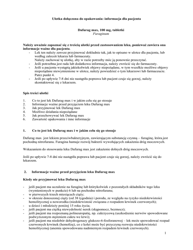 Ulotka dołączona do opakowania: informacja dla pacjenta Dafurag max, 100 mg, tabletki Furaginum Należy uważnie zapoznać się z treścią ulotki przed zastosowaniem leku, ponieważ zawiera ona informacje ważne dla pacjenta. - Lek ten należy zawsze przyjmować dokładnie tak, jak to opisano w ulotce dla pacjenta, lub według zaleceń lekarza lub farmaceuty. Należy zachować tę ulotkę, aby w razie potrzeby móc ją ponownie przeczytać. - Jeśli potrzebna jest rada lub dodatkowa informacja, należy zwrócić się do farmaceuty. - Jeśli u pacjenta wystąpią jakiekolwiek objawy niepożądane, w tym wszelkie możliwe objawy niepożądane niewymienione w ulotce, należy powiedzieć o tym lekarzowi lub farmaceucie. Patrz punkt 4. - Jeśli po upływie 7-8 dni nie nastąpiła poprawa lub pacjent czuje się gorzej, należy skontaktować się z lekarzem. Spis treści ulotki 1. 2. 3. 4. 5. 6. Co to jest lek Dafurag max i w jakim celu się go stosuje Informacje ważne przed przyjęciem leku Dafurag max Jak przyjmować lek Dafurag max Możliwe działania niepożądane Jak przechowywać lek Dafurag max Zawartość opakowania i inne informacje 1. Co to jest lek Dafurag max i w jakim celu się go stosuje Dafurag max jest lekiem przeciwbakteryjnym, zawierającym substancję czynną – furaginę, która.jest pochodną nitrofuranu. Furagina hamuje rozwój bakterii wywołujących zakażenia dróg moczowych. Wskazaniem do stosowania leku Dafurag max jest zakażenie dolnych dróg moczowych. Jeśli po upływie 7-8 dni nie nastąpiła poprawa lub pacjent czuje się gorzej, należy zwrócić się do lekarzem. 2. Informacje ważne przed przyjęciem leku Dafurag max Kiedy nie przyjmować leku Dafurag max - jeśli pacjent ma uczulenie na furaginę lub którykolwiek z pozostałych składników tego leku (wymienionych w punkcie) 6 lub na pochodne nitrofuranu; w pierwszych trzech miesiącach ciąży; w okresie donoszonej ciąży (od 38 tygodnia) i porodu, ze względu na ryzyko niedokrwistości hemolitycznej u noworodka (niedokrwistość związana z rozpadem krwinek czerwonych); u dzieci i młodzieży poniżej 15 roku życia; jeśli pacjent ma ciężką niewydolność nerek (skąpomocz, bezmocz); jeśli pacjent ma rozpoznaną polineuropatię, np. cukrzycową (uszkodzenie nerwów spowodowane podwyższonym stężeniem cukru we krwi); jeśli pacjent ma niedobór dehydrogenazy glukozo-6-fosforanowej – lek może spowodować rozpad czerwonych krwinek (hemolizę), co z kolei może być przyczyną rozwoju niedokrwistości hemolitycznej (anemia spowodowana nadmiernym rozpadem krwinek czerwonych). 1 Ostrzeżenia i środki ostrożności Przed rozpoczęciem przyjmowania leku Dafurag max, należy omówić to z lekarzem lub farmaceutą. - - - - Jeśli pacjent ma zaburzenia czynności nerek, wątroby, zaburzenia układu nerwowego, niedokrwistość, zaburzenia elektrolitowe, niedobór witamin z grupy B, niedobór kwasu foliowego lub choroby płuc; jeśli pacjent ma cukrzycę, gdyż furagina może spowodować uszkodzenie nerwów. U pacjentów leczonych pochodnymi nitrofuranu obserwowano uszkodzenia nerwów obwodowych. Zaburzenie to w ciężkich przypadkach może być nieodwracalne i zagrażać życiu pacjenta. Dlatego lek Dafurag max należy odstawić, jeśli wystąpią objawy ze strony układu nerwowego (mrowienie, drętwienie, uczucie przebiegających prądów); jeśli pacjent ma gorączkę dreszcze, kaszel, bóle w klatce piersiowej, duszność. Mogą to być objawy ostrych reakcji płucnych, które obserwuje się niekiedy u pacjentów leczonych pochodnymi nitrofuranu. W razie wystąpienia takich objawów, lek należy natychmiast odstawić. Objawy te najczęściej szybko lub bardzo szybko ustępują po odstawieniu leku. W przypadku reakcji przewlekłych nasilenie objawów i ich odwracalność po zaprzestaniu przyjmowania leku zależy od czasu kontynuacji leczenia po wystąpieniu pierwszych objawów niepożądanych. Sprawą kluczową jest jak najszybsze rozpoznanie działania niepożądanego i odstawienie leku. Upośledzenie czynności płuc może być nieodwracalne. Reakcje przewlekłe występowały u pacjentów przyjmujących furaginę dłużej niż 6 miesięcy. Przewlekłe reakcje płucne (w tym zwłóknienie płuc i rozsiane śródmiąższowe zapalenie płuc) mogą wystąpić zwłaszcza u pacjentów w podeszłym wieku; jeśli lek jest stosowany długotrwale – może być wówczas konieczne badanie krwi, w celu skontrolowania liczby białych krwinek oraz czynności nerek i wątroby. Wpływ na badania laboratoryjne Lek może powodować fałszywie dodatnie wyniki oznaczeń glukozy w moczu. Przed oddaniem próbki moczu do takiego badania, należy poinformować personel medyczny o przyjmowaniu lekuDafurag max. Dzieci i młodzież Leku Dafurag max nie należy stosować u dzieci i młodzieży poniżej 15 roku życia. Lek Dafurag max a inne leki Należy powiedzieć lekarzowi lub farmaceucie o wszystkich lekach przyjmowanych przez pacjenta obecnie lub ostatnio, a także o lekach, które pacjent planuje przyjmować. Należy zachować szczególną ostrożność podczas jednoczesnego stosowania niżej wymienionych leków: - pochodne chinolonu (np. kwas nalidyksowy – antybiotyk) – furagina może hamować ich działanie przeciwbakteryjne; - probenecyd i sulfinpirazon (leki stosowane w leczeniu dny moczanowej) – mogą osłabić działanie furaginy oraz zwiększyć jej toksyczność; - antybiotyki z grupy aminoglikozydów i tetracyklin – podawane razem z furaginą nasilają jej działanie przeciwbakteryjne; - chloramfenikol i rystomycyna (antybiotyki) – zwiększają toksyczne działanie furaginy; - leki zobojętniające sok żołądkowy, które zawierają trójkrzemian magnezu, ponieważ zmniejszają wchłanianie furaginy, co osłabia jej działanie przeciwbakteryjne; - atropina (lek rozkurczowy i środek rozszerzający źrenice) – może opóźniać wchłanianie furaginy, ale ogólna ilość wchłoniętej substancji nie