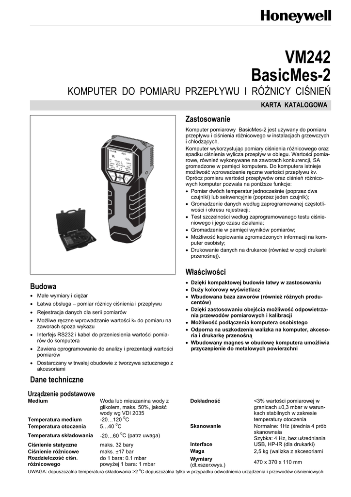 VM242 BasicMes-2 KOMPUTER DO POMIARU PRZEPŁYWU I RÓŻNICY CIŚNIEŃ KARTA KATALOGOWA Zastosowanie Komputer pomiarowy BasicMes-2 jest używany do pomiaru przepływu i ciśnienia różnicowego w instalacjach grzewczych i chłodzących. Komputer wykorzystując pomiary ciśnienia różnicowego oraz spadku ciśnienia wylicza przepływ w obiegu. Wartości pomiarowe, również wykonywane na zaworach konkurencji, SA gromadzone w pamięci komputera. Do komputera istnieje możliwość wprowadzenie ręczne wartości przepływu kv. Oprócz pomiaru wartości przepływów oraz ciśnień różnicowych komputer pozwala na poniższe funkcje: Pomiar dwóch temperatur jednocześnie (poprzez dwa czujniki) lub sekwencyjnie (poprzez jeden czujnik); Gromadzenie danych według zaprogramowanej częstotliwości i okresu rejestracji; Test szczelności według zaprogramowanego testu ciśnieniowego i jego czasu działania; Gromadzenie w pamięci wyników pomiarów; Możliwość kopiowania zgromadzonych informacji na komputer osobisty; Drukowanie danych na drukarce (również w opcji drukarki przenośnej). Właściwości Budowa Małe wymiary i ciężar Łatwa obsługa – pomiar różnicy ciśnienia i przepływu Rejestracja danych dla serii pomiarów Możliwe ręczne wprowadzanie wartości kv do pomiaru na zaworach spoza wykazu Interfejs RS232 i kabel do przeniesienia wartości pomiarów do komputera Zawiera oprogramowanie do analizy i prezentacji wartości pomiarów Dzięki kompaktowej budowie łatwy w zastosowaniu Duży kolorowy wyświetlacz Wbudowana baza zaworów (również różnych producentów) Dzięki zastosowaniu obejścia możliwość odpowietrzania przewodów pomiarowych i kalibracji Możliwość podłączenia komputera osobistego Odporna na uszkodzenia walizka na komputer, akcesoria i drukarkę przenośną Wbudowany magnes w obudowę komputera umożliwia przyczepienie do metalowych powierzchni Dostarczany w trwałej obudowie z tworzywa sztucznego z akcesoriami Dane techniczne Urządzenie podstawowe Medium Temperatura medium Temperatura otoczenia Woda lub mieszanina wody z glikolem, maks. 50%, jakość wody wg VDI 2035 0 -20…120 C 0 5…40 C Dokładność Skanowanie 0 Temperatura składowania -20…60 C (patrz uwaga) Ciśnienie statyczne Ciśnienie różnicowe Rozdzielczość ciśn. różnicowego maks. 32 bary maks. ±17 bar do 1 bara: 0.1 mbar powyżej 1 bara: 1 mbar Interface Waga Wymiary (dł.xszerxwys.) <3% wartości pomiarowej w granicach ±0,3 mbar w warunkach stabilnych w zakresie temperatury otoczenia Normalne: 1Hz (średnia 4 prób skanownaia Szybka: 4 Hz, bez uśredniania USB, HP-IR (dla drukarki) 2,5 kg (walizka z akcesoriami 470 x 370 x 110 mm 0 UWAGA: dopuszczalna temperatura składowania >2 C dopuszczalna tylko w przypadku odwodnienia urządzenia i przewodów ciśnieniowych 73 BASIC-MES-2 (VM242) Jednostki i wyświetlacz Jednostki ciśnienia mbar, bar, hPa, kPa mH2O, inH2O, psi Jednostki temperatur oC, oF Odczyt przepływu do 5 mbar: bez wyświetlenia 0…1000 l/h: rozdzielczość 1 l/h Zasilanie 4 akumulatorki typu AA, ładowane zasilaczem sieciowym dostarczonym z urządzeniem zwykle 70 mA przy jasności wyświetlacza 60% (fabrycznie) maks. 120 mA przy pełnej 100% jasności wyświetlacza 50 µA w czasie rzeczywistym przy wyłączeniu zasilania i w trybie logowania Typ zasilania Pobór mocy 1…100m3/h: rozdzielczość 0,01m3/h 100…1000m3/h: rozdzielczość 0,1m3/h 1000…10000m3/h: rozdzielcz. 1m3/h Wartości kV kV<1 odczyt co 0,001 1…99,99 odczyt co 0,01 Zakres dostawy 100…999,9 odczyt co 0,1 1000…10000 odczyt co 1 Współczynnik korek- 0,10…5,00kg/l z rozdzielczościa co cji gęstości 0,01 kg/l Pomiar temperatury wewnętrznej Zakres pomiarowy -20…60 oC Dokładność < ±1K Rozdzielczośc 0,1 oC Pomiar temperatury zewnętrznej Zakres pomiarowy -20…300 oC Dokładność o o ±2K w zakresie 0 C do 133 C; dla pozostałego zakresu 1,5% wartości mierzonej, zgodnie z EN50379-2 Rozdzielczośc Komputer pomiarowy BasicMes-2 z 4 akumulatorkami oraz sznurkiem ściągającym Zestaw przewodów pomiarowych z obejściem, zakończoTM nych łącznikami pomiarowymi typu SafeCon Ładowarkę baterii Przewód USB 2 adaptery Honeywell SafeConTM do adaptera Rectus 21 (dla połączenia BasicMes-2 z zaworami starego typu PT) 2 adaptery Rectus 21 z gwintem ¾” Walizka z pianką CD-ROM z oprogramowaniem użytkownika Instrukcja obsługi Oznaczenie katalogowe VM242A0101 o 0,1 C Komputer pomiarowy BasicMes-2 do pomiaru przepływu Akcesoria Części zamienne Drukarka przenośna do komputerów serii VM242 Drukarka przenośna VMA242A001 Komputer pomiarowy Tylko urządzenie, bez akcesoriów i baterii Zapasowe rolki papieru do drukarki VMA242A002 Adapter ze złączkami Rectus 21 Do współpracy z VM242, również z VM241 i innymi urządzeniami ze złączkami Rectus 21 VMA242A003 dla wszystkich VM242 Honeywell Sp. z o. o. ul. Domaniewska 41, 02-672 WARSZAWA Tel.: 22 606 09 00; Faks 22 606 09 83 www.honeywell.com.pl/automatyka_domow 2 Przewód USB VMS242A005 Ładowarka baterii VMS242A006 Przewody ciśnieniowe Kpl. przewodów ciśnieniowych Filtr zapasowy (2 szt.) TM Czujnik temperatury z zaciskami VMS242A001 VMS242A002 VMS242A003 Złączka SafeCon (dla niebieskiego) TM z Złączka SafeCon zaw. kulowym (dla czerwonego) VMS242A008 Złączka Rectus 21 z gw. wewn. ¾” z uszczelnieniem TM Złączka SafeCon z wtykiem Rectus 21 VMS242A004 VMS242A009 Adaptery VMA242A004 VA2500B001 VM242-k-pl01rMW0413
