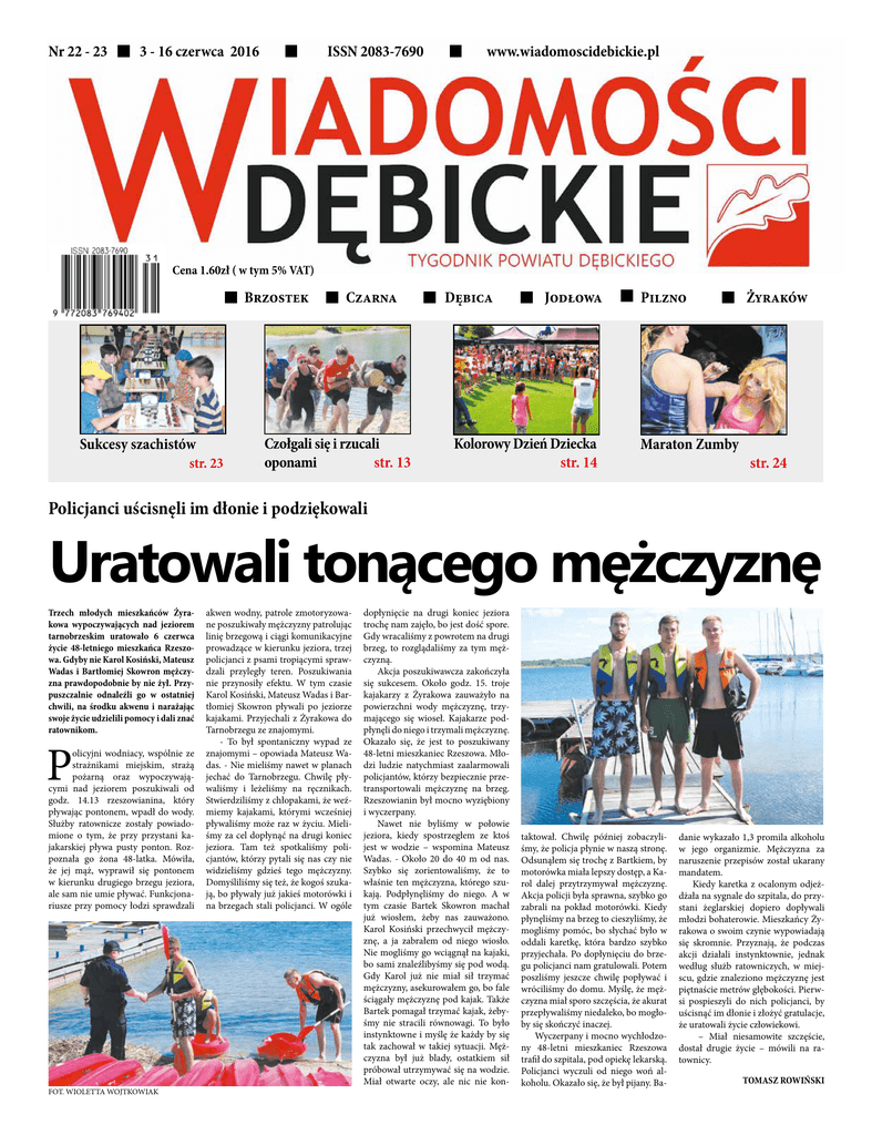 Nr 22 - 23 3 - 16 czerwca 2016 ISSN 2083-7690 www.wiadomoscidebickie.pl Cena 1.60zł ( w tym 5% VAT) Brzostek Sukcesy szachistów str. 23 Czarna Czołgali się i rzucali oponami str. 13 Dębica Jodłowa Kolorowy Dzień Dziecka str. 14 Pilzno Maraton Zumby Żyraków str. 24 Policjanci uścisnęli im dłonie i podziękowali Uratowali tonącego mężczyznę Trzech młodych mieszkańców Żyrakowa wypoczywających nad jeziorem tarnobrzeskim uratowało 6 czerwca życie 48-letniego mieszkańca Rzeszowa. Gdyby nie Karol Kosiński, Mateusz Wadas i Bartłomiej Skowron mężczyzna prawdopodobnie by nie żył. Przypuszczalnie odnaleźli go w ostatniej chwili, na środku akwenu i narażając swoje życie udzielili pomocy i dali znać ratownikom. P olicyjni wodniacy, wspólnie ze strażnikami miejskim, strażą pożarną oraz wypoczywającymi nad jeziorem poszukiwali od godz. 14.13 rzeszowianina, który pływając pontonem, wpadł do wody. Służby ratownicze zostały powiadomione o tym, że przy przystani kajakarskiej pływa pusty ponton. Rozpoznała go żona 48-latka. Mówiła, że jej mąż, wyprawił się pontonem w kierunku drugiego brzegu jeziora, ale sam nie umie pływać. Funkcjonariusze przy pomocy łodzi sprawdzali FOT. WIOLETTA WOJTKOWIAK akwen wodny, patrole zmotoryzowane poszukiwały mężczyzny patrolując linię brzegową i ciągi komunikacyjne prowadzące w kierunku jeziora, trzej policjanci z psami tropiącymi sprawdzali przyległy teren. Poszukiwania nie przynosiły efektu. W tym czasie Karol Kosiński, Mateusz Wadas i Bartłomiej Skowron pływali po jeziorze kajakami. Przyjechali z Żyrakowa do Tarnobrzegu ze znajomymi. - To był spontaniczny wypad ze znajomymi – opowiada Mateusz Wadas. - Nie mieliśmy nawet w planach jechać do Tarnobrzegu. Chwilę pływaliśmy i leżeliśmy na ręcznikach. Stwierdziliśmy z chłopakami, że weźmiemy kajakami, którymi wcześniej pływaliśmy może raz w życiu. Mieliśmy za cel dopłynąć na drugi koniec jeziora. Tam też spotkaliśmy policjantów, którzy pytali się nas czy nie widzieliśmy gdzieś tego mężczyzny. Domyśliliśmy się też, że kogoś szukają, bo pływały już jakieś motorówki i na brzegach stali policjanci. W ogóle dopłynięcie na drugi koniec jeziora trochę nam zajęło, bo jest dość spore. Gdy wracaliśmy z powrotem na drugi brzeg, to rozglądaliśmy za tym mężczyzną. Akcja poszukiwawcza zakończyła się sukcesem. Około godz. 15. troje kajakarzy z Żyrakowa zauważyło na powierzchni wody mężczyznę, trzymającego się wioseł. Kajakarze podpłynęli do niego i trzymali mężczyznę. Okazało się, że jest to poszukiwany 48-letni mieszkaniec Rzeszowa. Młodzi ludzie natychmiast zaalarmowali policjantów, którzy bezpiecznie przetransportowali mężczyznę na brzeg. Rzeszowianin był mocno wyziębiony i wyczerpany. Nawet nie byliśmy w połowie jeziora, kiedy spostrzegłem ze ktoś jest w wodzie – wspomina Mateusz Wadas. - Około 20 do 40 m od nas. Szybko się zorientowaliśmy, że to właśnie ten mężczyzna, którego szukają. Podpłynęliśmy do niego. A w tym czasie Bartek Skowron machał już wiosłem, żeby nas zauważono. Karol Kosiński przechwycił mężczyznę, a ja zabrałem od niego wiosło. Nie mogliśmy go wciągnął na kajaki, bo sami znaleźlibyśmy się pod wodą. Gdy Karol już nie miał sił trzymać mężczyzny, asekurowałem go, bo fale ściągały mężczyznę pod kajak. Także Bartek pomagał trzymać kajak, żebyśmy nie stracili równowagi. To było instynktowne i myślę że każdy by się tak zachował w takiej sytuacji. Mężczyzna był już blady, ostatkiem sił próbował utrzymywać się na wodzie. Miał otwarte oczy, ale nic nie kon- taktował. Chwilę później zobaczyliśmy, że policja płynie w naszą stronę. Odsunąłem się trochę z Bartkiem, by motorówka miała lepszy dostęp, a Karol dalej przytrzymywał mężczyznę. Akcja policji była sprawna, szybko go zabrali na pokład motorówki. Kiedy płynęliśmy na brzeg to cieszyliśmy, że mogliśmy pomóc, bo słychać było w oddali karetkę, która bardzo szybko przyjechała. Po dopłynięciu do brzegu policjanci nam gratulowali. Potem poszliśmy jeszcze chwilę popływać i wróciliśmy do domu. Myślę, że mężczyzna miał sporo szczęścia, że akurat przepływaliśmy niedaleko, bo mogłoby się skończyć inaczej. Wyczerpany i mocno wychłodzony 48-letni mieszkaniec Rzeszowa trafił do szpitala, pod opiekę lekarską. Policjanci wyczuli od niego woń alkoholu. Okazało się, że był pijany. Ba- danie wykazało 1,3 promila alkoholu w jego organizmie. Mężczyzna za naruszenie przepisów został ukarany mandatem. Kiedy karetka z ocalonym odjeżdżała na sygnale do szpitala, do przystani żeglarskiej dopiero dopływali młodzi bohaterowie. Mieszkańcy Żyrakowa o swoim czynie wypowiadają się skromnie. Przyznają, że podczas akcji działali instynktownie, jednak według służb ratowniczych, w miejscu, gdzie znaleziono mężczyznę jest piętnaście metrów głębokości. Pierwsi pospieszyli do nich policjanci, by uścisnąć im dłonie i złożyć gratulacje, że uratowali życie człowiekowi. – Miał niesamowite szczęście, dostał drugie życie – mówili na ratownicy. TOMASZ ROWIŃSKI D ruga strona 2 SŁOWO NACZELNEGO Show must go on Nie ma co ukrywać. Jan Borek, który niemal całe swoje zawodowe życie związał z kulturą, już dawno powinien objąć stanowisko dyrektora Miejskiego Ośrodka Kultury. Daleki jestem od oceniania pań, które sprawowały funkcję przed nim, nie o to chodzi. Po prostu Jan Borek jest odpowiednim człowiekiem na odpowiednim stanowisku. Ma olbrzymią wiedzę na temat muzyki, teatru i innych form sztuki. Bo chociaż wybrał na Dni Dębicy zespoły, które mogły podobać się wszystkim, to były to grupy prezentujące najwyższe standardy sztuki a nie chałturnicy ruszający tyłkiem i ustami w rytm muzyki z playbacku. I szkoda faktycznie, że tak mało osób zdecyd