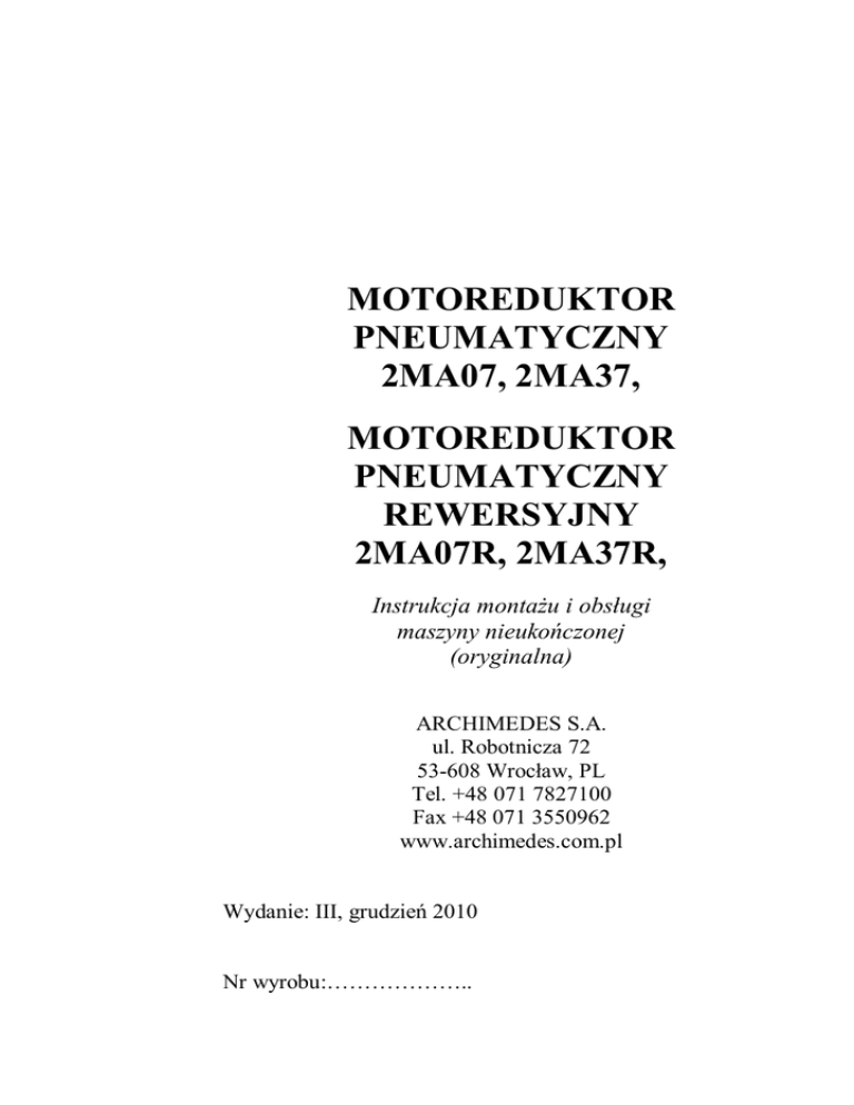 MOTOREDUKTOR PNEUMATYCZNY 2MA07, 2MA37, MOTOREDUKTOR PNEUMATYCZNY REWERSYJNY 2MA07R, 2MA37R, Instrukcja montażu i obsługi maszyny nieukończonej (oryginalna) ARCHIMEDES S.A. ul. Robotnicza 72 53-608 Wrocław, PL Tel. +48 071 7827100 Fax +48 071 3550962 www.archimedes.com.pl Wydanie: III, grudzień 2010 Nr wyrobu:……………….. 1. WSTĘP Niniejsza instrukcja powinna być starannie przechowywana i zawsze dostępna dla operatora, zakładowej służby BHP i innych osób związanych z obsługą motoreduktorów pneumatycznych. Informacje tu zawarte są istotne z punktu widzenia bezpieczeństwa pracy, właściwej eksploatacji, konserwacji i utylizacji wyrobu, a ponadto ułatwiają zamawianie części zamiennych. Użytkownik – przed zastosowaniem motoreduktora w wyrobie finalnym – powinien dokładnie zapoznać się z treścią niniejszego dokumentu i upewnić się, że informacje tu zawarte są dla niego zrozumiałe. W przypadku jakichkolwiek wątpliwości dotyczących wykorzystania naszych wyrobów, prosimy o kontakt ze sprzedawcą lub bezpośrednio z firmą Archimedes we Wrocławiu. Identyfikacja czasu produkcji wyrobu Wyroby pneumatyczne posiadają trwały, indywidualny numer fabryczny składający się z co najmniej pięciu cyfr. Dwie pierwsze cyfry odnoszą się do roku budowy wyrobu, a następne oznaczają kolejny egzemplarz wyrobu wyprodukowanego w danym roku. 2. CHARAKTERYSTYKA I PRZEZNACZENIE WYROBU Motoreduktory pneumatyczne to jednostki napędowe, zbudowane z silników obrotowych napędzanych sprężonym powietrzem i (w większości przypadków) z przekładni planetarnych redukujących obroty wrzeciona. Motoreduktory serii 2MA wyposażone są w silniki o mocy około 0,2 kW i różnią się miedzy sobą: momentem obrotowym i jednocześnie ilością obrotów wrzeciona, kierunkowością obrotów; motoreduktory oznaczone literą „R” to urządzenia dwukierunkowe, natomiast w pozostałych kierunek obrotów wrzeciona jest przeciwny do kierunku wskazówek zegara – patrząc na wyrób od strony wrzeciona. Motoreduktory pneumatyczne przeznaczone są do zabudowy w wyrobie finalnym i służą jak źródło napędu różnego rodzaju urządzeń mechanicznych. Mają zastosowanie głównie tam, gdzie nie może być wykorzystany napęd elektryczny i gdzie wymagana jest znaczna moc przy małych gabarytach źródła napędu. -1- 3. PARAMETRY TECHNICZNO - EKSPLOATACYJNE L.p. 1 2 3 4 5 6 7 8 9 10 11 12 13 Parametr Jedno Typ motoreduktora -stka miary 2MA07 2MA07R 2MA37 2MA37R 1/min 800 720 4000 3600 1/min 400 360 2000 1800 kW 0,3 0,24 0,3 0,24 Obroty biegu luzem Obroty mocy max Moc max Moment max Nm (zatrzymania) Moment startu Nm (obciążenie) Zużycie powietrza m3/h Średnica końcówki mm wrzeciona Masa kg Gniazdo końcówki powietrznej Średnica otworu w mm końcówce powietrznej Średnica wewn / zewn. mm przewodu powietrznego Ciśnienie zasilania max MPa Poziom ciśnienia dB/A/ akustycznego 15 12 3 2,4 12 10,5 2,4 2,1 33 33 33 33 0,9 0,9 10h9 1,1 1,1 G1/4 6 9 / 16 0,63 <85 -2- 4. BEZPIECZEŃSTWO Przed zastosowaniem motoreduktora w wyrobie finalnym należy dokładnie zapoznać się z przepisami obowiązującymi w zakresie bezpieczeństwa maszyn oraz z treścią niniejszej instrukcji obsługi. Elementy ruchome motoreduktora (wrzeciono, sprzęgło) powinny być zabudowane osłoną. Nie wolno zwiększać ciśnienia powietrza roboczego powyżej 0,63 MPa. Zadbać o to, by w miejscu pracy był łatwy dostęp do urządzeń odcinających dopływ powietrza. Nie stosować uszkodzonych węży powietrznych. Wąż taki może być przyczyną wypadku. Stosować węże obliczone na ciśnienie robocze wynoszące co najmniej 0,63 MPa. Unikać nadmiernego smarowania narzędzia, ponieważ olej wydostający się z narzędzia w postaci mgły jest szkodliwy dla środowiska naturalnego i dla operatora. W przypadku przedostania się smaru lub oleju do oczu, należy bezwzględnie skorzystać z pomocy medycznej. Po zakończeniu pracy zamknąć zawór sieciowy sprężonego powietrza. Uszkodzone urządzenie należy wycofać z użytkowania i ostrzegawczo oznaczyć. Motoreduktor, przed przeprowadzeniem konserwacji czy naprawy, należy odłączyć od sieci sprężonego powietrza. Motoreduktor nie posiada powłoki izolacyjnej. Zetknięcie się narzędzia ze źródłem energii elektrycznej grozi porażeniem operatora. Nieprzestrzeganie ww. wymagań dotyczących bezpieczeństwa pracy może doprowadzić do wypadku, obrażeń ciała lub utraty zdrowia. Producent nie odpowiada za skutki powstałe w wyniku wykorzystania wyrobu w sposób niezgodny z jego przeznaczeniem. Uwaga: Hałas emitowany przez motoreduktory serii 2MA (patrz pkt 3) jest niższy od wartości dopuszczalnych – w odniesieniu do 8-godzinnego dobowego wymiaru czasu pracy – określonych w Rozporządzeniu Ministra Pracy i Polityki Społecznej z dnia 29.11.2002r. – Dziennik Ustaw Nr 161. W warunkach konkretnego zastosowania motoreduktora wartości tych -3- parametrów mogą się zmieniać, co należy uwzględnić przy ocenie wyrobu finalnego. 5. PRZYGOTOWANIE DO PRACY Motoreduktor powinien być zasilany z sieci sprężonego powietrza o ciśnieniu nominalnym 0,63 MPa, wyposażonej w blok przygotowania powietrza – złożony z filtra, regulatora ciśnienia oraz smarownicy. Powietrze robocze powinno być zawsze czyste i pozbawione wilgoci; Powinno odpowiadać 4 klasie czystości wg PN-ISO8573-1. Zaleca się, by instalacja sprężonego powietrza wyposażona była w odwadniacz. Instalację powietrzną należy regularnie odwadniać. Końcówki powietrzne należy pewnie połączyć z przewodem sprężonego powietrza i koniecznie zabezpieczyć opaskami zaciskowymi. Należy unikać przewodów dłuższych niż 5 m, gdyż spadek ciśnienia w przewodzie powoduje obniżenie mocy urządzenia. W przypadku konieczności użycia dłuższych przewodów stosować najpierw przewód o większej średnicy, a następnie ok. 3 m przewód o średnicy nominalnej, tj. 13 mm. Dla za