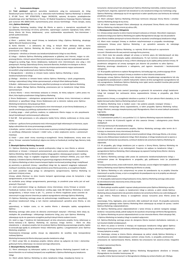 1. Postanowienia Wstępne 1.1 Treść poniższych ogólnych warunków świadczenia usług ma zastosowanie do Usług Świadczonych przez Trakido Sp. z o.o. Sp. k. właściciela marki handlowej "Optimus Marketing" ul. Łokietka 5, 87-100 Toruń, NIP 8792673976, Regon 341582156, wpisanej do rejestru przedsiębiorców prowadzonego przez Sąd Rejonowy w Toruniu, VII Wydział Gospodarczy Krajowego Rejestru Sadowego pod numerem KRS 0000511459, reprezentowaną przez Janusza Kamińskiego - Prezes Zarządu, zwaną dalej „Optimus Marketing” korzystanie z dostarczonych lub udostępnionych Optimus Marketing materiałów, znaków towarowych lub graficznych, sloganów, zapewnień lub oświadczeń w celu świadczenia Usługi oraz marketingu usług Optimus Marketing i zobowiązuje się ich nie ograniczać w żaden sposób przez czas konieczny do realizacji przedmiotu umowy. 3.3. Klient udostępni Optimus Marketing informacje techniczne dotyczące Strony Klienta i umożliwi Optimus Marketing dostęp do tej strony. 3.4. W trakcie trwania kampanii Klient zobowiązuje się utrzymywać Stronę Klienta oraz informować 1.2 Optimus Marketing świadczy Usługi dla Klienta w oparciu o zewnętrzne wyszukiwarki lub wyszukiwarkę internetową i ich strony partnerskie, zapewniające uzyskanie największej liczby odsłon: Strony Klienta lub Strony dedykowanej - przez użytkowników wyszukiwarki; fora internetowe i portale społecznościowe. 1.3 Definicje: a) Klient – podmiot, który zawarł Umowę na świadczenie Usług z Optimus Marketing, akceptując Ogólne Warunki Świadczenia Usług. b) Konto klienckie – w odniesieniu do Usług, w których Klient deklaruje Budżet, konto prowadzone przez Optimus Marketing dla Klienta, na którym Klient gromadzi środki pieniężne przeznaczone na Usługi. c) Kampania – określony w Umowie czas świadczenia/wykonania Usługi na rzecz Klienta. d) Usługa – działania Optimus Marketing podejmowane w globalnej sieci Internet, mające na celu promocję Klienta, z których opisem Klient przed zawarciem Umowy się zapoznał i zaakceptował warunki. Usługami są: Landing Page; Strona dedykowana; budowanie stron internetowych; oraz usług z nimi powiązanych; Hosting; Optymalizacja Strony; tworzenie Banerów; Analityka inne dostępne w ofercie. e) Ogólne Warunki świadczenia Usług – rozumie się niniejsze postanowienia mające zastosowanie do wszelkich usług świadczonych przez Optimus Marketing. f) Wynagrodzenie – określona w Umowie kwota należna Optimus Marketing z tytułu świadczenia/wykonania Usługi. g) Obsługa - określona w Umowie kwota należna Optimus Marketing z tytułu przygotowania, hostingu i optymalizacji Usług, linków sponsorowanych, w których Klient deklaruje Budżet. h) Budżet – deklarowana w Umowie kwota, jaką Klient przekazuje na rachunek Optimus Marketing, Optimus Marketing o każdej zmianie jej adresu URL. 4. Obowiązywanie Umowy, Odstąpienie 4.1. Umowa zostaje zawarta na okres trwania kampanii wskazany w Umowie. Warunkiem rozpoczęcia świadczenia Usługi przez Optimus Marketing jest zapłata Wynagrodzenia lub jego raty lub posiadanie przez Klienta środków pieniężnych na koncie klienckim w wysokości umożliwiającej świadczenie Usługi. 4.2. Klient może rozwiązać Umowę ze skutkiem natychmiastowym w przypadku nienależytego wykonywania Umowy przez Optimus Marketing i po uprzednim wezwaniu do należytego wykonania Umowy i wyznaczenia Optimus Marketing, co najmniej 30-dni roboczych na zaprzestanie naruszeń. Oświadczenie dla swej ważności wymaga formy pisemnej. 4.2.1. Klient może bez powodu odstąpić od umowy w terminie pięciu dni kalendarzowych od daty zawarcia Umowy, bez obowiązku zapłaty odszkodowania. Po tym terminie oświadczenie jest bezskuteczne (umowa pozostaje w mocy), a Klient zobowiązuje się do zapłaty pełnej wartości Umowy. W przedmiocie odstąpienia od umowy wymagane jest złożenie lub przesłanie na adres Optimus Marketing pisemnego oświadczenia o odstąpieniu, pod rygorem nieważności i bezskuteczności odstąpienia. 4.3. W przypadku opóźnienia w zapłacie Wynagrodzenia, lub każdej jego raty, przekraczającego 30 dni Optimus Marketing może rozwiązać Umowę ze skutkiem na dzień złożenia oświadczenia. Rozwiązując umowę Optimus Marketing może obciążyć kwotą niezapłaconego wynagrodzenia lub raty wynagrodzenia powiększonych o odsetki maksymalne należne od dnia wymagalności wynagrodzenia lub raty wynagrodzenia. Dodatkowo Optimus Marketing może żądać zwrotu wszelkich kosztów jakie poniósł w związku z realizacją niniejszej umowy. która po odjęciu Obsługi Optimus Marketing, przeznaczana jest na świadczenie Usługi linków sponsorowanych. i) Strona Klienta – strona internetowa wskazana w Umowie, do której wyłączne i pełne prawa ma Klient, która będzie przedmiotem Usługi Optimus Marketing. j) Strona Dedykowana – udostępniane oprogramowanie do budowy strony internetowej w zakresie określonym w specyfikacji Usługi, Strona Dedykowana jest w domenie nadanej przez Optimus Marketing lub domenie, którą dysponuje Klient. k) Hosting – Usługa polegająca na utrzymywaniu stron internetowych, w tym Strony Dedykowanej, w sposób umożliwiający jej publikację użytkownikom sieci Internet. l) Landing peage – utwór graficzny osadzony na subdomenie Klienta mający na celu pozyskiwanie danych kontaktowych zainteresowanych odbiorców. ł) Kod QR - Kod generowany w celu połączenia każdej formy reklamy outdorowej ze stroną www klienta. m) Banner – graficzna forma przekazania treści informacyjnych bądź reklamowych w Internecie, często będąca odnośnikiem do strony promowanego produktu. n) Analityka - pomiar i analiza ruchu na stronie www za pomocą instalacji Google Analytics pozwalające na weryfikację efektywności kampanii i źródeł ruchu, a także zwiększenie zwrotu z poniesionych inwestycji. o) Utwór – przez utwór strony rozumieją w szczególnośc