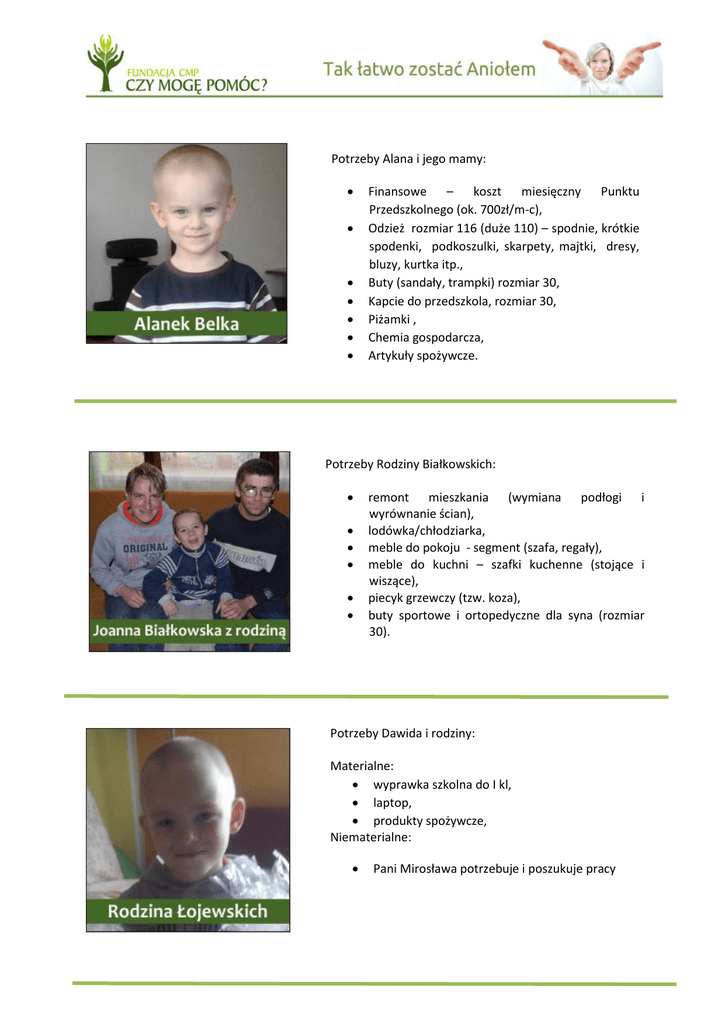 Potrzeby Alana i jego mamy: Finansowe – koszt miesięczny Punktu Przedszkolnego (ok. 700zł/m-c), Odzież rozmiar 116 (duże 110) – spodnie, krótkie spodenki, podkoszulki, skarpety, majtki, dresy, bluzy, kurtka itp., Buty (sandały, trampki) rozmiar 30, Kapcie do przedszkola, rozmiar 30, Piżamki , Chemia gospodarcza, Artykuły spożywcze. Potrzeby Rodziny Białkowskich: remont mieszkania (wymiana podłogi i wyrównanie ścian), lodówka/chłodziarka, meble do pokoju - segment (szafa, regały), meble do kuchni – szafki kuchenne (stojące i wiszące), piecyk grzewczy (tzw. koza), buty sportowe i ortopedyczne dla syna (rozmiar 30). Potrzeby Dawida i rodziny: Materialne: wyprawka szkolna do I kl, laptop, produkty spożywcze, Niematerialne: Pani Mirosława potrzebuje i poszukuje pracy Potrzeby Natalii Turnus rehabilitacyjny z asystentem (lipiec –sierpień 2014, ponieważ planowany jest remont łazienki , w wyniku czego będzie czasowy problem z korzystaniem z toalety i bieżącą wodą), Szyna transportowa do quada (będzie wykorzystywana do elektrycznego wózka inwalidzkiego Natalii). Potrzeby Piotrusia: Mleko Bebiko 3, Obiadki (słoiki), kaszki, deserki, Pieluchy rozmiar 4 (Piotruś wazy 12 kg), Chemia gospodarcza, Wózek spacerówka, Fotelik samochodowy. Potrzeby Rodziny Walczak: Finansowe: 2800zł (zaległy czynsz wynajmowanego mieszkania), Rzeczowe: chemia gospodarcza, buty letnie dla dzieci (sandały, sportowe): Martynka rozmiar 34/35, Kamil rozmiar 34, artykuły spożywcze. Potrzeby Mikołaja: Pieluchy Pampers rozmiar 6 (350zł/m-c), Rehabilitacja (800zł/m-c), Obuwie ortopedyczne 2szt/3 m-ce (400zł), Leki (100zł/m-c), Platforma wibracyjna (13.500zł). Potrzeby Rodziny Pacuszka: Marcin (5 lat): Bluzki, bluzy z długim rękawem – rozmiar 116 , Paulinka (6 lat): Buty rozmiar 29. Potrzeby Jasia: Turnus rehabilitacyjny nad morzem, Kurtka „wiatrówka” rozmiar 128, Pieluchy typu „pampers” do 25 kg. Potrzeby Antosia Marczuka: 1. Turnusy rehabilitacyjne w okresie wakacji (czerwiec – sierpień 2014r.) - 1200zł, 2. Terapie do grudnia 2014r: Sensoryczna – 1120zł, Logopedyczna – 840zł, Zajęcia z pedagogiem specjalnym – 480zł, Terapia mowy metodą Tomatisa – 1600zł, Zajęciowa – 480zł Potrzeby rodziny: chemia gospodarcza, żywność , materiały budowlane do remontu łazienki (farba, cement), potrzeby finansowe – pomoc w opłaceniu rachunków (Internet - 50 zł, odpady komunalne 45 zł, woda – ok. 90 zł/1,5 m-ca). Iza: (161 cm wzrostu, 65 kg masy ciała),ubrania rozmiar 40/L, buty rozmiar 40 (sportowe i sandały),kurtka letnia, bluzki sportowe, T-shirty, wizyta u okulisty oraz zakup nowych szkieł. Kacper: (wzrost 180 cm, masa ciała 100kg) rozpinane bluzy sportowe rozmiar XL, T-shirty, spodnie. Potrzeby rodziny: Żywność i środki czystości, Jasmina (3,5 roku): - ubranka rozmiar 116 cm, - buty rozmiar 27, - wyprawka przedszkolna (2 koce, pościel) Julia (8 lat): - ubrania rozmiar 134, - buty rozmiar 32, - wyprawka szkolna (plecak, kapcie, książki oraz przybory szkolne) Pani Ewelina (26lat): - ubrania rozmiar 170/XXL, - buty rozmiar 41.