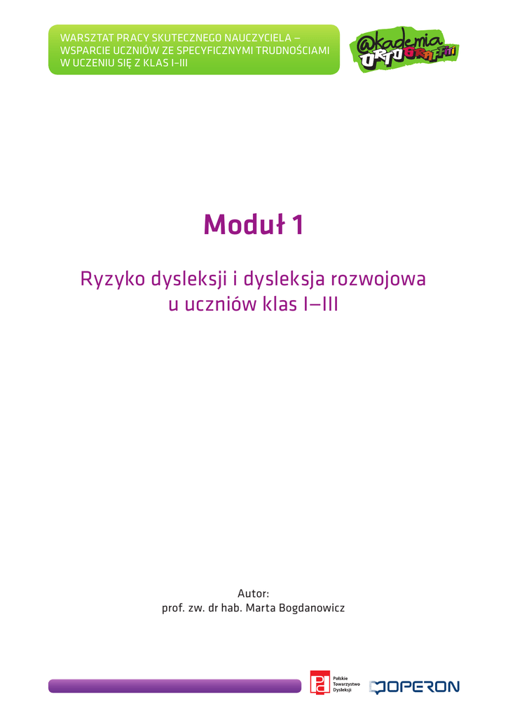 Warsztat pracy skutecznego nauczyciela — wsparcie uczniów ze specyficznymi trudnościami w uczeniu się z klas I–III Moduł 1 Ryzyko dysleksji i dysleksja rozwojowa u uczniów klas I—III Autor: prof. zw. dr hab. Marta Bogdanowicz Warsztat pracy skutecznego nauczyciela — wsparcie uczniów ze specyficznymi trudnościami w uczeniu się z klas I–III Ryzyko dysleksji i dysleksja rozwojowa u uczniów klas I—III 1. Terminologia Często posługujemy się terminem dysleksja rozwojowa, ale nie zawsze prawidłowo. Dysleksja to nie to samo, co słaby poziom czytania i pisania. Nie każde dziecko, które źle czyta, to uczeń z dysleksją. Trudności w czytaniu i pisaniu mają różne przyczyny, pomimo że przejawiają się podobnymi symptomami. Mogą być skutkiem obniżenia poziomu inteligencji (inteligencja poniżej przeciętnej), zaniedbania dydaktycznego (często zmieniała się nauczycielka, dziecko opuszczało dużo lekcji z powodu choroby) czy środowiskowego (dziecko nie rozumie znaczenia wielu słów, stąd też nie rozumie przeczytanego tekstu, nie ćwiczy czytania i pisania, które to czynności dzięki treningowi automatyzują się). Trudności w czytaniu mają też dzieci z wadami wzroku (bolą je oczy, głowa, męczy je czytanie), z zaburzeniami ruchów gałek ocznych (widzą podwójnie, nieostro), z wadami słuchu (potrzebują głośniejszego wypowiadania poleceń, nie zawsze dobrze odróżniają podobnie brzmiące wyrazy). Specyficznych trudności w czytaniu i pisaniu: dysleksji, dysortografii i dysgrafii nie rozpoznajemy, gdy zaburzenia w uczeniu się spowodowane są wyłącznie trudnościami opisanymi powyżej lub wynikają tylko z powodu słabej koncentracji uwagi, jak w przypadku dzieci nadpobudliwych ruchowo. Opisane zaburzenia mogą współwystępować z dysleksją, dysortografią i dysgrafią. Natomiast nigdy nie diagnozujemy ich w przypadku, kiedy kłopoty w nauce czytania i pisania są symptomami schorzenia neurologicznego (padaczki, urazu mózgu) lub obniżenia sprawności intelektualnej (inteligencja niższa niż przeciętna, upośledzenie umysłowe). Jak widać, dysleksję rozwojową łatwo jest pomylić z trudnościami w czytaniu i pisaniu, spowodowanymi innymi przyczynami. Termin ten stosujemy dla oznaczenia nieoczekiwanych trudności w uczeniu się czytania i pisania u uczniów zdolnych wskutek zaburzeń rozwoju niektórych funkcji poznawczych, ruchowych i ich współdziałania, gdy trudności tych nie tłumaczy inteligencja poniżej normy lub choroba neurologiczna. W trakcie badania diagnostycznego specjaliści, szczególnie współpracujący ze sobą psycholog i pedagog, muszą rozstrzygnąć, czy trudności w uczeniu się czytania i pisania to dysleksja, czy też wynik wyłącznie wad zmysłu lub zaniedbania środowiskowego i braku ćwiczeń. Należy tu podkreślić, że uczeń z dysleksją może mieć również wady zmysłu oraz być zaniedbany środowiskowo. Te przyczyny nie wykluczają rozpoznania dysleksji, co niestety jest często przyczyną nieporozumień w praktyce szkolnej, a nawet poradnianej. Dla odróżnienia trudności uwarunkowanych dysleksją od podobnych, lecz będących rezultatem innych przyczyn, określa się je terminem specyficzne trudności w czytaniu i pisaniu. W Polsce zaczęto się interesować tym zjawiskiem w okresie międzywojennym, w tym czasie i nawet do lat 50. używano terminu legastenia. Jest on nadal stosowany w krajach niemieckojęzycznych. W literaturze światowej najczęściej używa się terminu dysleksja. 2 Moduł 1. Ryzyko dysleksji i dysleksja rozwojowa u uczniów klas I–III Warsztat pracy skutecznego nauczyciela — wsparcie uczniów ze specyficznymi trudnościami w uczeniu się z klas I–III SPRAWDŹ SIĘ Pytanie 1. Jakie mogą być przyczyny trudności w czytaniu i pisaniu? Pytanie 2. Jakie przyczyny wykluczają rozpoznanie dysleksji? W 1959 roku dr A. Drath, psychiatra dziecięcy, opublikowała artykuł Dysleksja w „Szkole Specjalnej” i od tego czasu termin ten zaczął być powszechnie używany w Polsce. W tym też okresie zaczęto udzielać pomocy dzieciom ze specyficznymi trudnościami w czytaniu i pisaniu. Określano tę pomoc mianem reedukacja, co jest niepoprawnym terminem, bowiem pochodzi od „reedukować”, czyli uczyć ponownie. W przypadku dysleksji dzieci nigdy wcześniej nie potrafiły czytać ani pisać, od początku uczą się tego z trudem. Aktualnie używamy terminu terapia pedagogiczna. Wskazuje on, że pomoc udzielana uczniowi w celu pokonania jego trudności w czytaniu i pisaniu, ma charakter oddziaływań pedagogicznych. Nauczyciel przygotowany do udzielania pomocy w tych przypadkach, potocznie nazywany „nauczycielem terapeutą”, to nauczyciel specjalista terapii pedagogicznej. Taką specjalność zawodową można uzyskać na studiach podyplomowych na wyższej uczelni (350 godzin, 3 semestry) lub kursach kwalifikacyjnych (270 godzin). W zespole specyficznych trudności w czytaniu i pisaniu o różnej etiologii wyróżnia się takie formy trudności jak: dysleksja — specyficzne trudności w uczeniu się czytania, którym często towarzyszą trudności w opanowaniu poprawnej pisowni, dysortografia — specyficzne trudności w opanowaniu poprawnej pisowni (w tym błędy ortograficzne), które współwystępują z trudnościami w czytaniu lub występują samodzielnie, dysgrafia — specyficzne trudności w opanowaniu właściwego poziomu graficznego pisma, trudność w pisemnej komunikacji — specyficzne trudności wypowiadania się za pomocą pisma, np. tworzenia tekstu wypracowania. We wcześniejszych publikacjach autorka (Bogdanowicz 1969) zaproponowała ten system terminologii, używając pojęcia dysleksja rozwojowa dla określenia wszystkich tych form trudności i mając na uwadze odmienne ich symptomy. To nazewnictwo, funkcjonujące do chwili obecnej w praktyce psychopedagogicznej, uwzględniało tylko symptomy, lecz nie odnosiło się do przyczyn poszczególnych form zab