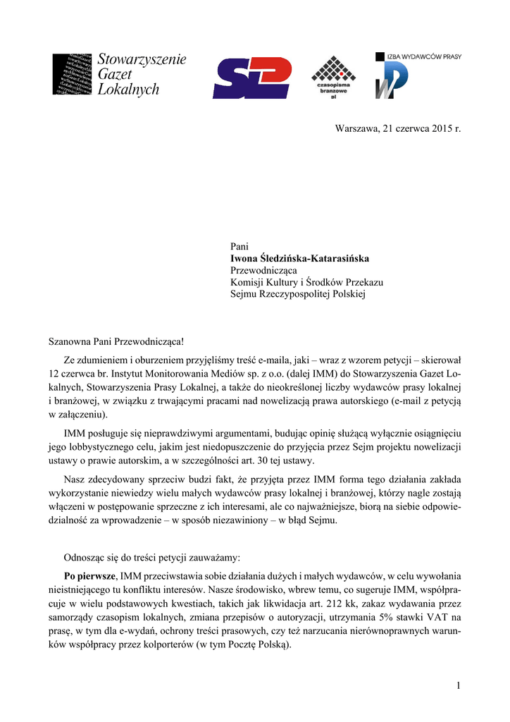Warszawa, 21 czerwca 2015 r. Pani Iwona Śledzińska-Katarasińska Przewodnicząca Komisji Kultury i Środków Przekazu Sejmu Rzeczypospolitej Polskiej Szanowna Pani Przewodnicząca! Ze zdumieniem i oburzeniem przyjęliśmy treść e-maila, jaki – wraz z wzorem petycji – skierował 12 czerwca br. Instytut Monitorowania Mediów sp. z o.o. (dalej IMM) do Stowarzyszenia Gazet Lokalnych, Stowarzyszenia Prasy Lokalnej, a także do nieokreślonej liczby wydawców prasy lokalnej i branżowej, w związku z trwającymi pracami nad nowelizacją prawa autorskiego (e-mail z petycją w załączeniu). IMM posługuje się nieprawdziwymi argumentami, budując opinię służącą wyłącznie osiągnięciu jego lobbystycznego celu, jakim jest niedopuszczenie do przyjęcia przez Sejm projektu nowelizacji ustawy o prawie autorskim, a w szczególności art. 30 tej ustawy. Nasz zdecydowany sprzeciw budzi fakt, że przyjęta przez IMM forma tego działania zakłada wykorzystanie niewiedzy wielu małych wydawców prasy lokalnej i branżowej, którzy nagle zostają włączeni w postępowanie sprzeczne z ich interesami, ale co najważniejsze, biorą na siebie odpowiedzialność za wprowadzenie – w sposób niezawiniony – w błąd Sejmu. Odnosząc się do treści petycji zauważamy: Po pierwsze, IMM przeciwstawia sobie działania dużych i małych wydawców, w celu wywołania nieistniejącego tu konfliktu interesów. Nasze środowisko, wbrew temu, co sugeruje IMM, współpracuje w wielu podstawowych kwestiach, takich jak likwidacja art. 212 kk, zakaz wydawania przez samorządy czasopism lokalnych, zmiana przepisów o autoryzacji, utrzymania 5% stawki VAT na prasę, w tym dla e-wydań, ochrony treści prasowych, czy też narzucania nierównoprawnych warunków współpracy przez kolporterów (w tym Pocztę Polską). 1 Po drugie, art. 30 prawa autorskiego odnosi się do dozwolonego użytku publicznego, który może być realizowany w sposób analogowy, tj. artykuł prasowy może być kopiowany z papieru na papier, która to forma wykorzystywania występuje w coraz mniejszym i niewiele znaczącym zakresie. Po trzecie, usługa monitoringu prasy, która wiąże się m.in. z dostarczaniem użytkownikom tzw. „wycinków prasowych” w formie cyfrowej, nie pozostaje bez wpływu na przychody wydawców z prenumeraty, która w coraz większym stopniu ograniczana jest przez urzędy, przedsiębiorców i inne podmioty. Po czwarte, nieprawdziwa jest ocena spadku czytelnictwa. Postępująca zmiana sposobu konsumpcji mediów, w tym prasy, stopniowe przechodzenie od prasy drukowanej do wydań cyfrowych i prasy w internecie, przy wykorzystaniu różnorodnych nośników treści, powoduje łączny wzrost czytelnictwa prasy drukowanej i cyfrowej, przy spadku tej pierwszej, ale wzroście czytelnictwa tej drugiej. Po piąte, nie jest prawdą, że opłaty reprograficzne nie są transferowane do uprawnionych. Na rynku organizacji zbiorowego zarządu, związanych z ochroną praw autorskich w zakresie realizacji art. 30 pa, działają dwie organizacje: Stowarzyszenie KOPIPOL, reprezentujące autorów dzieł naukowych i technicznych, oraz Stowarzyszenie Wydawców REPROPOL, reprezentujące wydawców prasy. KOPIPOL na podstawie art. 30 ust. 2 prawa autorskiego inkasuje dla autorów tzw. opłatę reprograficzną od IMM w zryczałtowanej kwocie rocznej ok. 40 tys. zł, którą przekazuje autorom. REPROPOL, wyłącznie na podstawie zawartych dobrowolnych umów licencyjnych z 50 wydawcami, w tym 18 prasy lokalnej i branżowej, udziela firmom monitorującym media licencji niewyłącznych na zwielokrotnianie w formie cyfrowej i rozpowszechnianie publikacji prasowych do celu monitoringu prasy. Na podstawie umów licencyjnych zawartych z sześcioma firmami monitoringu mediów (Newton Media, GLOB, Panmedia, Newspoint, e-Prasa.com, Pharma) REPROPOL w roku 2014 wypłacił 50 wydawcom wynagrodzenia licencyjne w wysokości 215 tys. zł. Po szóste, nieprawdą jest, że REPROIPOL odmawia podpisania umowy z IMM. W październiku 2010 r. REPROPOL zaproponował IMM podpisanie umowy licencyjnej na cyfrowe zwielokrotnianie i rozpowszechnianie utworów prasowych dla celów monitoringu prasy. Umowa ta była przedmiotem podejmowanych kilkakrotnie wstępnych uzgodnień z IMM; ostatnia taka propozycja była skierowana do IMM w połowie roku 2014. IMM systematycznie odmawia podpisania umowy, wykorzystując różnorodne procedury prawne. Po siódme, nieprawdą jest, że REPROPOL nie wystąpił do Komisji Prawa Autorskiego przy MKiDN o tabele wynagrodzeń. W maju 2013 r. KPA zatwierdziła stawki dla REPROPOL-u z tytułu licencjonowania korzystania z publikacji periodycznych oraz mających samodzielne znaczenie utworów składających się na zawartość publikacji periodycznych, w związku z usługami monitoringu prasy. Tabele te weszły w życie w styczniu 2014 r. Po ósme, nieprawdą jest, że REPROPOL skupia się wyłącznie na walce z firmami monitoringu mediów. REPROPOL wykonując swe obowiązki statutowe, postawił do wypłaty i wypłacił za lata 2007–2013 kwotę 7,4 mln zł tzw. opłat reprograficznych, zainkasowanych na podst. art. 20 i 20’ prawa autorskiego od SAiW „Copyright Polska”. Kwoty te przekazano wydawcom blisko 8,7 tys. tytułów prasowych (wykaz dostępny na stronie internetowej www.swrepropol.pl). 2 REPROPOL dochodzi roszczeń w imieniu reprezentowanych przez niego wydawców, z którymi podpisał umowy licencyjne. W przypadku IMM roszczenie to dotyczy kwoty ok. 900 tys. zł rocznie. Po dziewiąte, nieprawdą jest, że wynagrodzenia licencyjne po ich pozyskaniu, nie dotrą do małych wydawców. REPROPOL w 2014 r. wypłacił tzw. małym wydawcom tytułów takich, jak: Panorama Leszczyńska, Co Tydzień Jaworzno, Co Tydzień Mysłowice, Pałuki, Pałucka Wkładka Magazynowa, Pałuki i Ziemia Mogileńska, Tygodnik Siedlecki, Dziennik Pomorza, Gazeta Kociewska, Gazeta Malborska, Gazeta Tczewska, Głos Kaszub, Kurier Kwidzyński, Tygodnik Po