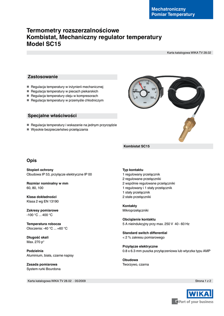 Mechatroniczny Pomiar Temperatury Termometry rozszerzalnościowe Kombistat, Mechaniczny regulator temperatury Model SC15 Karta katalogowa WIKA TV 28.02 Zastosowanie Regulacja temperatury w inżynierii mechanicznej Regulacja temperatury w piecach piekarskich Regulacja temperatury oleju w kompresorach Regulacja temperatury w przemyśle chłodniczym Specjalne właściwości Regulacja temperatury i wskazanie na jednym przyrządzie Wysokie bezpieczeństwo przełączania Kombistat SC15 Opis Stopień ochrony Obudowa IP 53, przyłącze elektryczne IP 00 Rozmiar nominalny w mm 60, 80, 100 Klasa dokładności Klasa 2 wg EN 13190 Zakresy pomiarowe -100 °C ... 400 °C Temperatura robocza Otoczenia: -40 °C ... +60 °C Długość skali Max. 270 p° Podzielnia Aluminium, biała, czarne napisy Zasada pomiarowa System rurki Bourdona Karta katalogowa WIKA TV 28.02 ∙ 05/2009 Typ kontaktu 1 regulowany przełącznik 2 regulowane przełączniki 2 wspólnie regulowane przełączniki 1 regulowany i 1 stały przełącznik 1 stały przełącznik 2 stałe przełączniki Kontakty Mikroprzełączniki Obciążenie kontaktu 5 A nieindukcyjny przy max. 250 V 40 - 60 Hz Standard switch differential < 2 % zakresu pomiarowego Przyłącze elektryczne 0.8 x 6.3 mm puszka przyłączeniowa lub wtyczka typu AMP Obudowa Tworzywo, czarna Strona 1 z 2 Wypełnienie systemu Xylol, olej silikonowy, sylterm lub azot Długość kapilary Max. 10 m Wymiary w mm SC1560 z 1 kontaktem 11366967 Wersja standardowa Opcje Obudowa ze stali Wersja w obudowie kwadratowej (45 x 45 mm, 72 x 72 mm, 96 x 96 mm) Pierścień panelowy Nasadka ochronna IP 51 lub IP 54 Obciążenie kontaktu 10 A nieindukcyjnego przy max. 250 V 40 - 60 Hz Inne przyłącza procesowe Symbole potwierdzające UL, CSA Obudowa ze stali z 3 lub 4 stałymi kontaktami (model = SC00 ... F3/F4) Skale °F, °C / °F SC1560 z 2 kontaktami SC1580 SC1510 11367041 Kapilara Pancerz z tworzywa -40 °C ... +120 °C Pleciony pancerz z miedzi -40 °C ... +350 °C Stal nierdzewna -100 °C ... +400 °C Wyjście kapilary Tylne ekscentryczne (LB) 11367016 Typ montazu Montaż panelowy z obejmą (NS 100 w obudowie stalowej z pierścieniem panelowyn) Forma budowy złącza Gładki czujnik (bez gwintu), SF94 Stop miedzi Długość czujnika = zmienna Średnica czujnika Ø d = 6, 8, 8.5, 10 Nakrętka zewnętrzna ze stożkiem uszczelniającym, SF91 / SV20 Stop miedzi, G ½ B, G ⅜ B, M14 x 1.5 Długość czujnika = zmienna Średnica czujnika Ø d = 6, 8, 8.5, 10 Informacje potrzebne do zamówienia Model / Rozmiar nominaly / Zakres pomiarowy / Typ kontaktu / Punkty przełaczające / Kapilara / Długość kapilary / Forma budowy złącza / Opcje Specyfikacje i wymiary podane w niniejszej karcie przedstawiają stan konstrukcyjny aktualny w momencie wydruku. Istnieje możliwość wprowadzenia modyfikacji i zmian w specyfikacji materiałowej. Strona 2 z 2 Karta katalogowa WIKA TV 28.02 ∙ 05/2009 WIKA Polska spółka z ograniczoną odpowiedzialnością sp. k. Ul. Łęgska 29/35, 87-800 Włocławek Tel.: (+48) 54 23 01 100 Fax: (+48) 54 23 01 101 E-mail: [email protected] www.wikapolska.pl 05/2009 PL based on 05/2009 GB Nakrętka zewnętrzna z mocowaniem SF91 / SV19 M14 x 1.5, G ⅜ B, G ½ B, G ¾ B Stop miedzi Długość czujnika = zmienna Średnica czujnika Ø d = 6, 8, 8.5, 10
