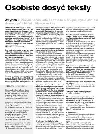 Osobiste dosyć teksty Zmywak z Muzyki Końca Lata opowiada o drugiej płycie „2:1 dla dziewczyn” i Mińsku Mazowieckim PAWEŁ DUNIN–WĄSOWICZ: W Dzidzi śpiewasz, że będziesz miał siłę psa, w Chłopakach zapowiadasz, „jak duży czarny kot przebiegnę przez zaspane miasto”, w Ona nie chce jeszcze spać zwracasz się „co mi powiesz, kocie mój?”, a w W środę wieczorem stwierdzasz „na małe jeszcze nie czas”. To są teksty tylko z nowej płyty 2:1 dla dziewczyn, a tych psów i kotów jest u ciebie więcej i w innych piosenkach. Czy masz coś współnego z zootechniką? ZMYWAK: Z zootechniką? Nie... To są teksty tylko z nowej płyty, a tych psów i kotów jest u ciebie więcej i w innych piosenkach, na poprzedniej Jedno wesele, dwa pogrzeby koty występowały w 3 piosenkach a w czwartej lew – także kot... – Siła psa została użyta w kontekście wytrwałości w czekaniu. Porzucony pies potrafi czekać na właściciela w jednym miejscu wiele dni i nie chowa w sercu urazy. Psy i koty są fajne, bliskie i jakoś tak często mi się kojarzą z różnymi sytuacjami. Kot to tajemnica noc, niepokój, a pies to raczej konkret. Ale ostatnio jak mi się kot narzuca w jakiejś nowej piosence, to go eliminuję, bo już ich jest za dużo. Jest taka XIX–wieczna utopia amerykańskiego pisarza Edwarda Bellamy Rok 2000. Jej bohaterowie zadają sobie pytanie, czy w idealnym społeczeństwie, w którym wszyscy są MKL To co widziałem Bieszczadzki spleen i płonące drzewa Wisła w Toruniu i sztutowska mewa Wschodzące słońce tuż nad stodołą Przekwitłe panie jesienią na molo I woda i słońce i drzewa i las I wszystko to co wypełnia mój czas Bo wszystko to co widziałem bez ciebie Nie liczy się nieważne jest bo bez ciebie I woda i słońce i las Nie liczy się nieważne jest bo nie ma nas Ścianka, Izrael, Kobiety w Jazzgocie Kawałek Kulki, bandy na squacie Brygada Kryzys, Emiter, Pudelsi Mordy, Świetliki i Starzy Singersi Pustki, The Users i Ewa Braun i wszystkie piosenki, co z kapelą gram Bo wszystko to co słyszałem bez ciebie Nie liczy się nieważne jest bo bez ciebie Te płyty, kasety, koncertów czas Nie liczy się nieważne jest bo nie ma nas 22 lampa szczęśliwi może istnieć dobra literatura, która zawsze wyrastała z konfliktów, nieszczęść, sprzeczności. Mam wrażenie, że wszystkie twoje piosenki są optymistyczne, jak sobie z tym radzisz? Tylko Na cienkim jest pesymistyczna. – No, nie zgodzę się bo i w Dzidzi, i w To co widziałem jest smutno. Obie napisane jako odreagowanie na przykre wydarzenia. Ja widzę większość naszych piosenek jako mieszaninę smutku i radości. reggae’ową kapelę Reggres Faja, zespół istniał może rok. Wkręciłem się w lokalne towarzystwo muzyczne, poznałem fajnych ludzi. Wy sobie świadomie przyklejacie etykietkę zespołu z małego miasta, to widać w teledysku Żabi chociażby. Pociąg podmiejski, ptaki nad miasteczkiem.... – ...gołębie. W pewnym sensie tak. Jest to o tyle niesztuczne, że my po prostu mieszkamy w takich małych miejscowościach. Ja i Piotrek jesteśmy z Mińska, Darek z Zielonki, a MaW To, co widziałem wymieniasz wśród zoba- karon jest z Mrozów, to jest jeszcze mniejsza czonych zespołów Świetliki i w Dzidzi wystę- miejscowość, jak wysiadasz z pociągu od razu puje taki pijany podmiot liryczny. możesz dostać w zęby. – Chodzi ci, że nawiązałem do Świetlików Przyzwyczailiśmy się do leniwego rytmu życia w sensie pociągu, że stoi na peronie jak w Roz- tych miasteczek. I choć próby gramy w Warpierdoliłaś mi wakacje [oficjalny tytuł Miłość na szawie i różne inne rzeczy nas do niej ciągną marne z EP Wieprze – przyp. PDW]?. Tak jak to zawsze miło wraca się na naszą spokojną większość tych piosenek ta była pisana jako re- prowincje, gdzie się wszystkich zna, gdzie kąty akcja na konkretną sytuację. Czekałem w nocy znajome. w Warszawie na pociąg do Mińska i tęskniłem do pewnej dziewczyny z którą nie ułożyło I jak rozumiem, wszystko odbiło się w piosię... Są to osobiste dosyć teksty. Nie powiesence Na cienkim, gdzie przyjezdny z małego działbym, że to jest aż tak szczęśliwa płyta. miasta kupuje kebaba pod bramą UniwersyChociaż nie jest dołerska. Nie jestem osobą, tetu Warszawskiego nie mogąc doczekać się która będzie się cięła czy wieszała, raczej mnie niepamiętającej już o nim dziewczyny... taki smutek ogarnia, jak to Hrabal napisał – Tak. To jest historia ukazująca lęk chłopa– pogodna melancholia. Wiesz, że w swojej ków przed wyjazdem ich dziewczyn na studia. porażce i zagubieniu starasz się znaleźć jakieś To się po prostu często kończy rozstaniem. piękno i mądrość, że w takich chwilach można spróbować stać się lepszym człowiekiem. W Mińsku Mazowieckiem, jak rozumiem, nie ma kebeba? Kapel, które wyliczasz w To co widziałem nie – Teraz już jest, ale raczej słaby [śmiech]. Mięso słychać jednak w muzyce twojego zespołu. jakieś takie... nie wiem, z czego robione, i chyCzemu nie Malarze i Żołnierze albo Chłiopcy ba lepiej nie wiedzieć. z Placu Broni? Tylko w Ona nie chce jeszcze spać przywołujesz Takie ładne oczy CzerwoJest wybór między cienkim a grubym? nych Gitar. To dość rzadka dziś fascynacja. – Nie, jest tylko gruby. Skąd jednak wzięła się ta rozbieżność pomiędzy wyliczanką a brzmieniem własnym? Mam wrażenie, że twoje piosenki są ponad– Te kapele nie do końca są wymieniane jako czasowe. Wyjąwszy taki rekwizyt jak kebab inspiracje. To są zespoły które lubię, na któi zespoły wyliczane w To, co widziałem, to rych koncertach byłem. Na pierwszym roku one mogłyby powstać 40 lat temu i być śpiestudiów zacząłem chodzić na warszawskie wane np. przez Czerwone Gitary. koncerty i było to dla mnie dużym przeży– One generalnie są o miłości... Ale nie ciem, że widzę na własne oczy ludzi, których – w Chłopakach