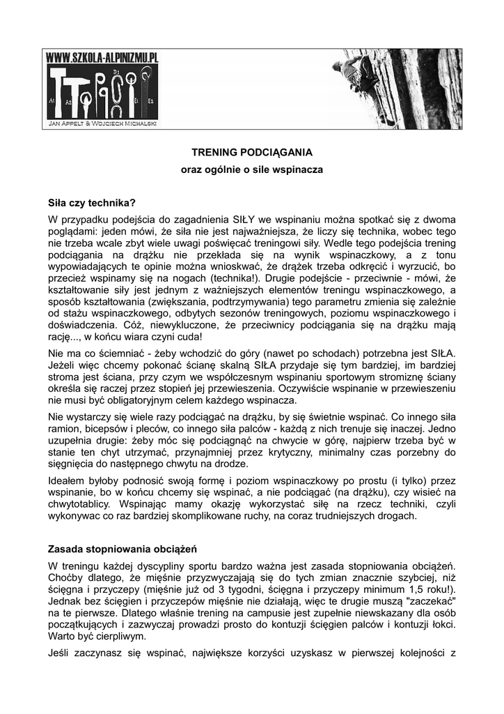 TRENING PODCIĄGANIA oraz ogólnie o sile wspinacza Siła czy technika? W przypadku podejścia do zagadnienia SIŁY we wspinaniu można spotkać się z dwoma poglądami: jeden mówi, że siła nie jest najważniejsza, że liczy się technika, wobec tego nie trzeba wcale zbyt wiele uwagi poświęcać treningowi siły. Wedle tego podejścia trening podciągania na drążku nie przekłada się na wynik wspinaczkowy, a z tonu wypowiadających te opinie można wnioskwać, że drążek trzeba odkręcić i wyrzucić, bo przecież wspinamy się na nogach (technika!). Drugie podejście - przeciwnie - mówi, że kształtowanie siły jest jednym z ważniejszych elementów treningu wspinaczkowego, a sposób kształtowania (zwiększania, podtrzymywania) tego parametru zmienia się zależnie od stażu wspinaczkowego, odbytych sezonów treningowych, poziomu wspinaczkowego i doświadczenia. Cóż, niewykluczone, że przeciwnicy podciągania się na drążku mają rację..., w końcu wiara czyni cuda! Nie ma co ściemniać - żeby wchodzić do góry (nawet po schodach) potrzebna jest SIŁA. Jeżeli więc chcemy pokonać ścianę skalną SIŁA przydaje się tym bardziej, im bardziej stroma jest ściana, przy czym we współczesnym wspinaniu sportowym stromiznę ściany określa się raczej przez stopień jej przewieszenia. Oczywiście wspinanie w przewieszeniu nie musi być obligatoryjnym celem każdego wspinacza. Nie wystarczy się wiele razy podciągać na drążku, by się świetnie wspinać. Co innego siła ramion, bicepsów i pleców, co innego siła palców - każdą z nich trenuje się inaczej. Jedno uzupełnia drugie: żeby móc się podciągnąć na chwycie w górę, najpierw trzeba być w stanie ten chyt utrzymać, przynajmniej przez krytyczny, minimalny czas porzebny do sięgnięcia do następnego chwytu na drodze. Ideałem byłoby podnosić swoją formę i poziom wspinaczkowy po prostu (i tylko) przez wspinanie, bo w końcu chcemy się wspinać, a nie podciągać (na drążku), czy wisieć na chwytotablicy. Wspinając mamy okazję wykorzystać siłę na rzecz techniki, czyli wykonywac co raz bardziej skomplikowane ruchy, na coraz trudniejszych drogach. Zasada stopniowania obciążeń W treningu każdej dyscypliny sportu bardzo ważna jest zasada stopniowania obciążeń. Choćby dlatego, że mięśnie przyzwyczajają się do tych zmian znacznie szybciej, niż ścięgna i przyczepy (mięśnie już od 3 tygodni, ścięgna i przyczepy minimum 1,5 roku!). Jednak bez ścięgien i przyczepów mięśnie nie działają, więc te drugie muszą "zaczekać" na te pierwsze. Dlatego właśnie trening na campusie jest zupełnie niewskazany dla osób początkujących i zazwyczaj prowadzi prosto do kontuzji ścięgien palców i kontuzji łokci. Warto być cierpliwym. Jeśli zaczynasz się wspinać, największe korzyści uzyskasz w pierwszej kolejności z samego wspinania, które sprawi, że: 1. będziesz stopniowo wzmacniać palce, poznając różne rodzaje chwytów i sposoby korzystania z nich (sposoy chwytania), 2. ćwiczysz kompetencję ruchową, czyli technikę - jeśli starasz się wspinać na różnych drogach. Po drugie ważny jest treningu ogólnorozwojowy (siłowo-wytrzymałościowy), który: 1. sprzyja utrzymaniu równowagi mięśniowej (o ile ćwiczymy mięśnie antagonistyczne), co w znacznej mierze chroni przed kontuzjami 2. przygotuje nas do coraz większych obciążeń (np. trudnego boulderingu). Jeśli zaczynamy się wspinać, podciąganie na drążku można potraktować jako element treningu ogólnorozwojowego. Od czego zacząć? Od porządnej rozgrzewki. Najlepiej wykonać minimum 20 minutową rozgrzewkę całego ciała z naciskiem na ramiona i plecy (dużo wymachów, krążeń, półobrotów pleców, serie pompek, lekkie rozciąganie). TECHNIKA PODCIĄGANIA 1. Najbardziej efektywny sposób dla wspinaczy to podciąganie nachwytem. 2. Ręce na drążku ułóż na szerokość barków. 3. Zawisając na drążku (i gdy przechodzisz z podciągnięcia do wyprostu) utrzymuj mięśnie ramion w napięciu - nie zawisaj "na stawach"! 4. W czasie podciągania trzymaj łokcie blisko tułowia. 5. Unikaj gwałtowengo opuszczania tułowia. 6. Zwracaj uwagę, by podciągać się równo obiema rękami - praworęczni zazwyczaj "ciągną" mocniej prawą ręką. Tempo podciągania - może być dodatkowym bodźcem w podciąganiu się (stopniowanie). Na początku lepiej, jeśli utrzymujesz dość wolne tempo i przede wszystkim równe zarówno w fazie podciągnięcia i opuszczania. SPOSOBY PODCIĄGANIA Piramida – może być rosnąca, malejąca lub rosnąco-malejąca. W piramidzie szczególne znaczenie ma pilnowanie czasow odpoczynkowych, czyli przerw pomiedzy seriami podciągnięć. Staramy się pilnować równych przerw (2 do 3 minut). Podciąganie w seriach – polega na podciaganiu się w równych seriach, z rownymi czasami odpoczynkowymi między każdą serią. Oba powyższe sposoby treningu podciągania kłądą akcent jest na wytrzymałość siłową, co ogranicza nabieranie zbędnej masy mięśniowej. Cel: • wykonanie piramidy 1-10-1, lub wykonanie 10 serii po 10 podciągnięć, • odpoczynki pomiedzy seriami: 2-3 minuty. W obu przypadkach wychodzi 100 podciągnięć w ograniczonym czasie (około 1h). Jeśli ćwiczysz metodą piramidy: • Rób tak wysoką piramidę jak zdołasz np. 1-5-1. W przypadku niskiej piramidy, staraj się ją zrobić 2 razy. Możesz odpocząć 10 minut (nie dłużej, żeby mięśnie nie wystygły). • Co tydzień, staraj się zwiększyć serię ze szczytu piramidy o 1-2 podciągnięcia (tym samym wyjdzie też więcej serii). • Staraj się żeby piramida była równa – lepsza niska piramida (wykonana 2 razy), niż wysoka z dużym skokiem w dół, w kolejnych seriach. Jeśli ćwiczysz podciąganie w seriach: • podciągaj się w każdej serii maksymalną liczbę razy ile dasz radę (nie ważne ile to będzie!); odpoczywaj 2-3 minuty; postaraj się wykonać minimum 10 serii 
