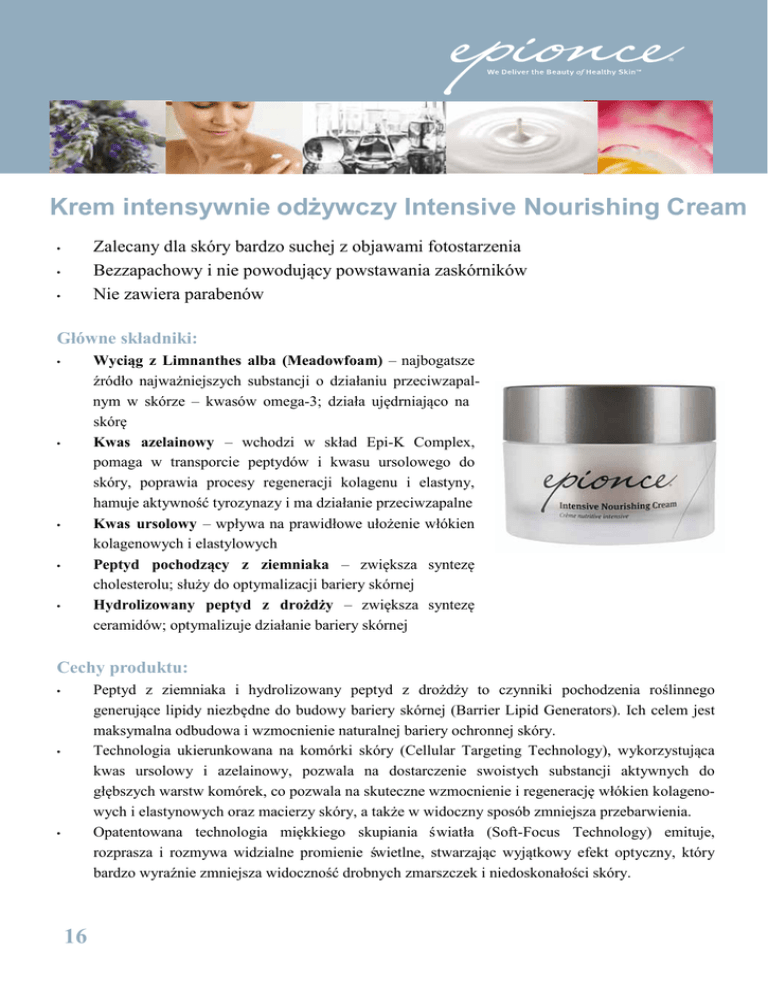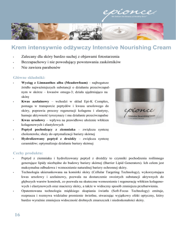 Krem intensywnie odżywczy Intensive Nourishing Cream Zalecany dla skóry bardzo suchej z objawami fotostarzenia Bezzapachowy i nie powodujący powstawania zaskórników Nie zawiera parabenów • • • Główne składniki: Wyciąg z Limnanthes alba (Meadowfoam) – najbogatsze źródło najważniejszych substancji o działaniu przeciwzapalnym w skórze – kwasów omega-3; działa ujędrniająco na skórę Kwas azelainowy – wchodzi w skład Epi-K Complex, pomaga w transporcie peptydów i kwasu ursolowego do skóry, poprawia procesy regeneracji kolagenu i elastyny, hamuje aktywność tyrozynazy i ma działanie przeciwzapalne Kwas ursolowy – wpływa na prawidłowe ułożenie włókien kolagenowych i elastylowych Peptyd pochodzący z ziemniaka – zwiększa syntezę cholesterolu; służy do optymalizacji bariery skórnej Hydrolizowany peptyd z drożdży – zwiększa syntezę ceramidów; optymalizuje działanie bariery skórnej • • • • • Cechy produktu: Peptyd z ziemniaka i hydrolizowany peptyd z drożdży to czynniki pochodzenia roślinnego generujące lipidy niezbędne do budowy bariery skórnej (Barrier Lipid Generators). Ich celem jest maksymalna odbudowa i wzmocnienie naturalnej bariery ochronnej skóry. Technologia ukierunkowana na komórki skóry (Cellular Targeting Technology), wykorzystująca kwas ursolowy i azelainowy, pozwala na dostarczenie swoistych substancji aktywnych do głębszych warstw komórek, co pozwala na skuteczne wzmocnienie i regenerację włókien kolagenowych i elastynowych oraz macierzy skóry, a także w widoczny sposób zmniejsza przebarwienia. Opatentowana technologia miękkiego skupiania ś wiatła (Soft-Focus Technology) emituje, rozprasza i rozmywa widzialne promienie świetlne, stwarzając wyjątkowy efekt optyczny, który bardzo wyraźnie zmniejsza widoczność drobnych zmarszczek i niedoskonałości skóry. • • • 16 Korzyści ze stosowania produktu: Krem intensywnie odżywczy Epionce Intensive Nourishing Cream jako jedyny produkt z linii Epionce zawiera składniki peptydowe. • Kwas ursolowy, znajdujący się także w składzie tego produktu, jest niezwykle trudnym składnikiem pod względem utrzymania stabilności w postaci, która skutecznie dociera do skóry. Unikatowy system transportu Epionce pozwala na dostarczenie kwasu ursolowego do odpowiednich warstw skóry, gdzie może on wywierać działanie lecznicze i wspomagać naturalne właściwości naprawcze skóry. • Krem intensywnie odżywczy zawiera również składniki o właściwościach zmniejszających nadmierną pigmentację. • Ten wyjątkowo bogaty krem o właściwościach emolientu może być stosowany jako kuracja pielęgnacyjna na noc, nadaje się także do stosowania na skórę szyi i dekoltu. Dowód: badania kliniczne Krem intensywnie odżywczy (INC) vs. Prevage MD (1% idebenon; PMD), badanie trwające 12 tygodni Redukcja płytkich zmarszczek Po 6 tygodniach, poprawa o 26,1% po INC (p<0,005) vs. 9,4% po PMD Po 12 tygodniach, poprawa o 31,3% po INC (p<0,005) vs. 9,9% po PMD Zmniejszenie szorstkości skóry przy dotyku Po 12 tygodniach, poprawa o 60,6% po INC (p<0,001) vs. 45,9% po PMD Siatkowate przebarwienia Po 6 tygodniach, poprawa o 12,2% po INC (p<0,010) vs. 6,2% po PMD U 27% osób badanych stosujących PMD wystąpiło kontaktowe zapalenie skóry o nasileniu od łagodnego do ciężkiego, przy czym jedna osoba wycofała się z badania z uwagi na uogólnienie się objawów wypryskowych. U żadnej z osób stosujących INC nie wystąpiły objawy niepożądane. Aby uzyskać więcej informacji prosimy odwiedzić stronę www.epionce.pl. www.epionce.pl 17 Porady Specjalisty Epionce Klientka: W młodości spędzałam dużo czasu na słońcu, a teraz, w wieku pięćdziesięciu lat, wyraźnie widzę oznaki uszkodzenia skóry przez promienie słoneczne. Na mojej twarzy pojawiły się plamy posłoneczne, a skóra jest zwiotczała z dużą liczbą drobnych zmarszczek. Specjalista Epionce: Stosowanie Kremu intensywnie odżywczego może naprawdę pomóc w naprawieniu części uszkodzeń, do których doszło w młodości. Kwas azelainowy hamuje aktywność tyrozynazy, która jest odpowiedzialna za powstawanie plam posłonecznych na skórze. Kwas ursolowy przyczynia się do przywrócenia prawidłowego ułożenia włókien kolagenowych i elastylowych w skórze, co pomaga w jej wzmocnieniu. Wyciąg z rośliny Limnanthes alba (Meadowfoam) ma także silne działanie ujędrniające skórę. W kremie zastosowana jest również technologia miękkiego skupiania światła (Soft-Focus Technology), która rozprasza światło, zmniejszając widoczność drobnych zmarszczek. Klientka: Mam bardzo suchą skórę twarzy, zwłaszcza w zimie. Czy jest jaki inny produkt Epionce, poza odnawiającym kremem do twarzy Renewal Facial Cream, który zapewni mi jeszcze lepsze nawilżenie? Specjalista Epionce: Krem intensywnie odżywczy jest silnym emolientem i znakomicie nadaje się do bardzo suchej skóry. Zawiera on także peptyd z ziemniaka i hydrolizowany peptyd z drożdży czyli składniki, które stanowią dodatkowe czynniki naprawcze dla bariery skórnej. Peptydy te znajdują się tylko w Kremie intensywnie odżywczym. Niektórzy wolą stosować ten gęsty, odżywczy krem tylko na noc, ale można go również nakładać dwa razy dziennie. Klientka: Czy możecie polecić mi dobry krem, który mogę stosować na starzejącą się skórę szyi i dekoltu? Specjalista Epionce: Krem intensywnie odżywczy to znakomity produkt do stosowania na szyję i dekolt! Posiada on intensywnie nawilżające właściwości, a w jego składzie znajduje się najbardziej zaawansowany technologicznie zestaw aktywnych kompleksów, zawierających swoiste składniki o działaniu regenerującym. Krem ten nie tylko zapewnia znakomite nawilżenie, ale pomaga w ujędrnieniu skóry, zmniejsza widoczność przebarwień oraz redukuje drobne zmarszczki i inne uszkodzenia. Klientka: Mam tłustą skórę z objawami fotostarzenia. 