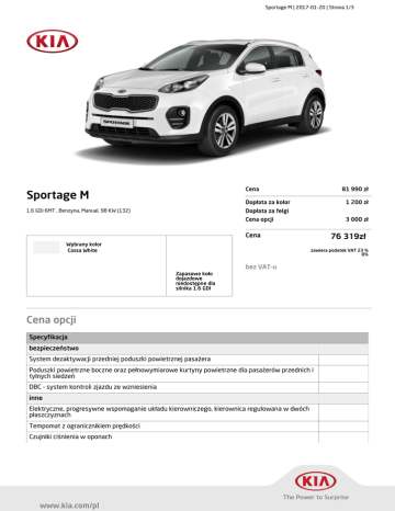 Sportage M | 2017-01-20 | Strona 1/3 Cena Sportage M 81 990 zł Dopłata za kolor 1.6 GDi 6MT , Benzyna, Manual, 98 KW (132) 1 200 zł Dopłata za felgi Cena opcji 3 000 zł 76 319zł Cena Wybrany kolor Cassa White zawiera podatek VAT 23 % 0% bez VAT-u Zapasowe koło dojazdowe niedostępne dla silnika 1.6 GDI Cena opcji Specyfikacja bezpieczeństwo System dezaktywacji przedniej poduszki powietrznej pasażera Poduszki powietrzne boczne oraz pełnowymiarowe kurtyny powietrzne dla pasażerów przednich i tylnych siedzeń DBC - system kontroli zjazdu ze wzniesienia inne Elektryczne, progresywne wspomaganie układu kierowniczego, kierownica regulowana w dwóch płaszczyznach Tempomat z ogranicznikiem prędkości Czujniki ciśnienia w oponach www.kia.com/pl Sportage M | 2017-01-20 | Strona 2/3 Specyfikacja multimedia Radioodtwarzacz CD, MP3 z RDS typu 2 DIN, złącza typu USB, AUX, zestaw 6 głośników Wielofunkcyjna kierownica: sterowanie systemem audio, Bluetooth z zestawem głośnomówiącym nadwozie 17" felgi aluminiowe z oponami 225/60/R17 Zapasowe koło dojazdowe niedostępne dla silnika 1.6 GDI Przednie reflektory typu projekcyjnego z funkcją oświetlania drogi do domu Światła do jazdy dziennej wykonane w technologii LED z czujnikiem zmierzchu Spoiler dachowy Światła przeciwmgielne Lusterka zewnętrzne w kolorze nadwozia Elektrycznie regulowane lusterka zewnętrzne Elektrycznie składane lusterka zewnętrzne z funkcją kierunkowskazów w technologii LED Wlot powietrza do silnika lakierowany w kolorze czarnym na wysoki połysk Relingi dachowe w kolorze srebrnym Klamki zewnętrzne lakierowane w kolorze nadwozia siedzenia Regulacja wysokości i napinacze pasów bezpieczeństwa dla foteli przednich Pasy bezpieczeństwa z czujnikiem obecności pasażerów (przód i tył) Manualna regulacja wysokości fotela kierowcy Podłokietnik tylnej kanapy Kieszenie w oparciach foteli przednich udogodnienia Pakiet Komfortowy Autoalarm obwodowy, immobilizer Klimatyzacja manualna z nawiewami na tylne siedzenia wnętrze Lampki do czytania w podsufitce dla pasażerów przednich i tylnych siedzeń Funkcja podświetlania lusterek w osłonach przeciwsłonecznych Podświetlanie przestrzeni bagażowej Szyby przednie oraz tylne sterowane elektrycznie Wykończenie wewnętrznych klamek drzwi w kolorze srebrnym Konsola centralna wykończona w kolorze srebrnym Skórzane wykończenie kierownicy, drążka zmiany biegów Zestaw zegarów z wyświetlaczem Mono TFT 3.5" dla komputera pokładowego Gniazdo zasilania 12V w konsoli centralnej oraz bagażniku www.kia.com/pl 3 000 zł Sportage M | 2017-01-20 | Strona 3/3 WAŻNE! Niniejszy dokument nie stanowi oferty w rozumieniu art. 66 § 1 Kodeksu Cywilnego (KC) oraz innych właściwych przepisów prawa. Stanowi jedynie zaproszenie w rozumieniu art. 71 KC do zawarcia umowy kupna-sprzedaży. Kia Motors Polska Sp. z o.o. oświadcza, że dane zawarte w cenniku są aktualne na dzień sporządzenia zaproszenia. Kia Motors Polska Sp. z o.o. zastrzega sobie prawo dokonywania bez uprzedzenia zmian informacji zawartych w cennikach, w tym dotyczących danych technicznych, wyposażenia, cen, specyfikacji pojazdów. W odniesieniu do konsumentów niniejsze zaproszenie nie stanowi wykonania obowiązków informacyjnych, o których mowa w ustawie z 30-05-2014 r. o prawach konsumenta, nie stanowi też oświadczeń sprzedawcy lub producenta, o których mowa w powołanym akcie prawnym. Wymagane przez obowiązujące przepisy prawa informacje, stanowiące jednocześnie Ogólne Warunki Umowne udzielane konsumentom są zawarte w dokumencie: INFORMACJA DLA KLIENTA udostępnianego na stronie www.kia.com.pl <http://www.kia.com.pl> oraz w siedzibie Autoryzowanego Dealera KIA. Z dokumentem tym należy zapoznać się przed podjęciem decyzji o zawarciu umowy zakupu samochodu. Otrzymanie i zapoznanie się z treścią INFORMACJI DLA KLIENTA potwierdzane jest przez Klienta czytelnym podpisem na przeznaczonej dla Sprzedawcy kopii tego dokumentu. Jednakże dopiero podpisana przez klienta INFORMACJA DLA KLIENTA wraz z podpisanym przez Sprzedawcę i Klienta Formularzem Zamówienia określającego m.in. ustalone przez strony cechy nabywanego samochodu, termin dostawy, -cenę stanowić będą umowę wiążącą Strony. www.kia.com/pl