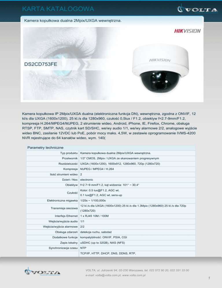 KARTA KATALOGOWA Kamera kopułkowa dualna 2Mpix/UXGA wewnętrzna. DS2CD753FE Kamera kopułkowa IP 2Mpix/UXGA dualna (elektroniczna funkcja DN), wewnętrzna, zgodna z ONVIF, 12 kl/s dla UXGA (1600x1200), 25 kl./s dla 1280x960, czułość 0,5lux / F1.2, obiektyw f=2.7-9mm/F1.2, kompresja H.264/MPEG4/MJPEG, 2 strumienie wideo, Android, iPhone, IE, Firefox, Chrome, obsługa RTSP, FTP, SMTP, NAS, czytnik kart SD/SHC, we/wy audio 1/1, we/wy alarmowe 2/2, analogowe wyjście wideo BNC, zasilanie 12VDC lub PoE, pobór mocy maks. 4,5W, w zestawie oprogramowanie IVMS-4200 NVR rejestrujące do 64 kanałów wideo, wym. 140( Parametry techniczne Typ produktu Kamera kopułkowa dualna 2Mpix/UXGA wewnętrzna. Przetwornik 1/3" CMOS, 2Mpix / UXGA ze skanowaniem progresywnym Rozdzielczość UXGA (1600x1200), 1600x912, 1280x960, 720p (1280x720) Kompresja MJPEG / MPEG4 / H.264 Ilość strumieni wideo 2 Dzień / Noc electronic Obiektyw f=2.7~9 mm/F1.2, kąt widzenia: 101° ~ 30.4° Czułość Kolor: 0.5 [email protected], AGC wł, 0.1 [email protected], AGC wł, sens-up Elektroniczna migawka 1/25s ~ 1/100,000s Transmisja sieciowa 12 kl./s dla UXGA (1600x1200) 25 kl./s dla 1.3Mpix (1280x960) 25 kl./s dla 720p (1280x720) Interfejs Ethernet 1 x RJ45 10M / 100M Wejścia/wyjścia audio 1/1 Wejścia/wyjścia alarmowe 2/2 Obsługa zdarzeń detekcja ruchu, sabotaż Dodatkowe funkcje kompatybilność: ONVIF, PSIA, CGI Zapis lokalny uSDHC (up to 32GB), NAS (NFS) Synchronizacja czasu NTP TCP/IP, HTTP, DHCP, DNS, DDNS, RTP, Wspierane protokoły RTSP, PPPoE, SMTP, NTP, SNMP, HTTPS, FTP, 802.1x, QoS VOLTA, ul. Jutrzenki 94, 02-230 Warszawa, tel. 022 572 90 20, 022 331 33 00 e-mail: [email protected], www.volta.com.pl 1 -10 Wymiary 140( Zasilanie 12 VDC Temperatura pracy VOLTA, ul. Jutrzenki 94, 02-230 Warszawa, tel. 022 572 90 20, 022 331 33 00 e-mail: [email protected], www.volta.com.pl 2