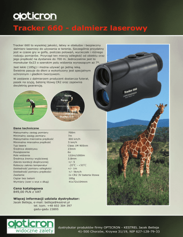 Tracker 660 - dalmierz laserowy Tracker 660 to wysokiej jakości, łatwy w obsłudze i bezpieczny dalmierz laserowy do używania w terenie. Szczególnie przydatny jest w czasie gry w golfa, podczas polowań, wycieczek i różnego rodzaju pomiarów. Przyrząd ten mierzy odległość od obiektu oraz jego prędkość na dystansie do 700 m. Jednocześnie jest to monokular 6x23 o szerokim polu widzenia wynoszącym aż 7º. Jest lekki (185g) i można używać go jedną reką. Świetnie pasuje do dłoni a wykończony jest specjalnym ochronnym i gładkim tworzywem. W zestawie z dalmierzem producent dostarcza futerał, pasek na szyję, baterię litową CR2 oraz zapewnia dwuletnią gwarancję. Ready Range 110 m Quality >>>> Dane techniczne Maksymalny zasięg pomiaru Minimalny zasięg pomiaru Maksymalna mierzalna prędkość Minimalna mierzalna prędkość Typ lasera Średnica obiektywu Powiększenie Pole widzenia Średnica źrenicy wyjściowej Zakres korekcji dioptrycznej Roboczy zakres temperatur Dokładność pomiaru odległości Dokładność pomiaru prędkości Zasilanie Ciężar bez baterii Wymiary (szer x wys x dług) 700m 7m 300 km/h 5 km/h Class 1M 905nm 23mm 6x 122m/1000m 3.8mm +/- 5 -20˚C - +50˚C +/- 1m +/- 5km/h 1x CR2 3V bateria litowa 185g 41x72x104mm Cena katalogowa 849,00 PLN z VAT Więcej informacji udziela dystrybutor: Jacek Betleja, e-mail: [email protected] tel. kom. +48 602 304 397 gadu-gadu 23895 dystrybutor produktów firmy OPTICRON - KESTREL Jacek Betleja 41-500 Chorzów, Krzywa 31/19, NIP 627-128-79-33