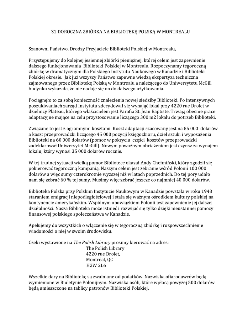 31 DOROCZNA ZBIÓRKA NA BIBLIOTEKĘ POLSKĄ W MONTREALU Szanowni Państwo, Drodzy Przyjaciele Biblioteki Polskiej w Montrealu, Przystępujemy do kolejnej jesiennej zbiórki pieniężnej, której celem jest zapewnienie dalszego funkcjonowania Biblioteki Polskiej w Montrealu. Rozpoczynamy tegoroczną zbiórkę w dramatycznym dla Polskiego Instytutu Naukowego w Kanadzie i Biblioteki Polskiej okresie. Jak już wszyscy Państwo zapewne wiedzą ekspertyza techniczna zajmowanego przez Bibliotekę Polską w Montrealu a należącego do Uniwersytetu McGill budynku wykazała, że nie nadaje się on do dalszego użytkowania. Pociągnęło to za sobą konieczność znalezienia nowej siedziby Biblioteki. Po intensywnych poszukiwaniach zarząd Instytutu zdecydował się wynająć lokal przy 4220 rue Drolet w dzielnicy Plateau, którego właścicielem jest Parafia St. Jean Baptiste. Trwają obecnie prace adaptacyjne mające na celu przystosowanie liczącego 300 m2 lokalu do potrzeb Biblioteki. Związane to jest z ogromnymi kosztami. Koszt adaptacji szacowany jest na 85 000 dolarów a koszt przeprowadzki liczącego 45 000 pozycji księgozbioru, dzieł sztuki i wyposażenia Biblioteki na 60 000 dolarów (pomoc w pokryciu części kosztów przeprowadzki zadeklarował Uniwersytet McGill). Nowym poważnym obciążeniem jest czynsz za wynajem lokalu, który wynosi 35 000 dolarów rocznie. W tej trudnej sytuacji wielką pomoc Bibliotece okazał Andy Chełmiński, który zgodził się pokierować tegoroczną kampanią. Naszym celem jest zebranie wśród Polonii 100 000 dolarów a więc sumy czterokrotnie wyższej niż w latach poprzednich. Do tej pory udało nam się zebrać 60 % tej sumy. Musimy więc zebrać jeszcze co najmniej 40 000 dolarów. Biblioteka Polska przy Polskim Instytucie Naukowym w Kanadzie powstała w roku 1943 staraniem emigracji niepodległościowej i stała się ważnym ośrodkiem kultury polskiej na kontynencie amerykańskim. Wspólnym obowiązkiem Polonii jest zapewnienie jej dalszej działalności. Nasza Biblioteka może istnieć i rozwijać się tylko dzięki nieustannej pomocy finansowej polskiego społeczeństwa w Kanadzie. Apelujemy do wszystkich o włączenie się w tegoroczną zbiórkę i rozpowszechnienie wiadomości o niej w swoim środowisku. Czeki wystawione na The Polish Library prosimy kierować na adres: The Polish Library 4220 rue Drolet, Montréal, QC H2W 2L6 Wszelkie dary na Bibliotekę są zwalniane od podatków. Nazwiska ofiarodawców będą wymienione w Biuletynie Polonijnym. Nazwiska osób, które wpłacą powyżej 500 dolarów będą umieszczone na tablicy patronów Biblioteki Polskiej. Mamy nadzieję, że wspólnym wysiłkiem uda nam się zapewnić przyszłość naszej Biblioteki. Serdecznie wszystkich zapraszamy do korzystania z jej zbiorów. Prof. Hanna M. Pappius Stanisław Latek Stefan Władysiuk