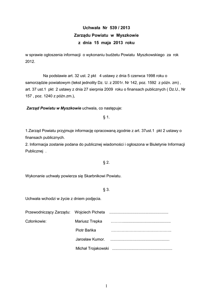 Uchwała Nr 539 / 2013 Zarządu Powiatu w Myszkowie z dnia 15 maja 2013 roku w sprawie ogłoszenia informacji o wykonaniu budżetu Powiatu Myszkowskiego za rok 2012. Na podstawie art. 32 ust. 2 pkt 4 ustawy z dnia 5 czerwca 1998 roku o samorządzie powiatowym (tekst jednolity Dz. U. z 2001r. Nr 142, poz. 1592 z późn. zm) , art. 37 ust.1 pkt 2 ustawy z dnia 27 sierpnia 2009 roku o finansach publicznych ( Dz.U., Nr 157 , poz. 1240 z późn.zm.), Zarząd Powiatu w Myszkowie uchwala, co następuje: § 1. 1.Zarząd Powiatu przyjmuje informację opracowaną zgodnie z art. 37ust.1 pkt 2 ustawy o finansach publicznych. 2. Informacja zostanie podana do publicznej wiadomości i ogłoszona w Biuletynie Informacji Publicznej . § 2. Wykonanie uchwały powierza się Skarbnikowi Powiatu. § 3. Uchwała wchodzi w życie z dniem podjęcia. Przewodniczący Zarządu: Wojciech Picheta Członkowie: Mariusz Trepka ………............................................ Piotr Bańka ………………………………………. Jarosław Kumor. ...................................................... ...................................................... Michał Trojakowski ....................................................... 1 Informacja z wykonania budżetu Powiatu Myszkowskiego za 2012 rok wraz z wykazem osób prawnych i fizycznych , którym udzielono pomocy publicznej. A) Wykonanie budżetu Powiatu Myszkowskiego za 2012 rok . Rada Powiatu Uchwałą Nr XXI/137/2011 z dnia 22 grudnia 2011 roku uchwaliła prognozowane dochody na rok 2012 w wysokości 50.973.886 zł , w tym: - dochody bieżące: 45.680.796 zł - dochody majątkowe: 5.293.090 zł i w wyniku dokonanych zmian w ciągu 2012 roku, plan budżetu Powiatu Myszkowskiego po stronie dochodów zamknął się kwotą z tego: dochody bieżące 63.693.919,00 zł, 51.439.008 zł dochody majątkowe 12.254.911 zł Dochody ogółem zostały zrealizowane w wysokości 64.436.405,75 zł co stanowi 101,17 % w stosunku do planu z tego: dochody bieżące 52.035.291,75 zł dochody majątkowe 12.401.114,00 zł co stanowi 101,16 % co stanowi 101,19 % Zmiany w budżecie nastąpiły poprzez zwiększenie planowanych dochodów o kwotę 12.720.033,00 zł. Planowane wydatki ustalono w wysokości 55.349.884 zł. Na przestrzeni całego 2012 roku dokonywano zmian w planie wydatków i na koniec grudnia plan wydatków zamknął się kwotą 65.802.974 zł Z tego: wydatki bieżące 50.845.411 zł wydatki majątkowe 14.957.533 zł Faktycznie zrealizowane wydatki w całym budżecie Powiatu to kwota 63.515.441,87 zł, co stanowi 96,52 % ogółu planowanych wydatków. Z poniesionych wydatków w 2012 roku z kwoty 63.515.441,87 zł przeznaczono na : wydatki bieżące , 49.482.947,37 zł wydatki majątkowe 14.032.494,50 zł PLAN PRZYCHODÓW PO DOKONANYCH ZMIANACH – 12.233.057 zł PLAN ROZCHODÓW – 10.124.002 zł ־ WYKONANIE PRZYCHODÓW –12.653.209,92 zł, tj. 103,43 % planu, ־ WYKONIE ROZCHODÓW - 10.124.002,00 zł, tj. 100,0 % planu. 2 Wynik budżetu osiągnięty w 2012 roku jest dodatni i wynosi (+) 920.963,88 zł. B) Kwota wykorzystanych środków pochodzących z budżetu Unii Europejskiej oraz niepodlegające zwrotowi środki z pomocy udzielanej przez państwa członkowskie Europejskiego Porozumienia o wolnym Handlu (EFTA) w 2012 roku przedstawia się następująco: 1. Dotacja celowa w ramach programów finansowanych z udziałem środków europejskich oraz środków , o których mowa w art.5 ust.1 pkt 3 oraz ust.3 pkt 5 i 6 ustawy, lub płatności w ramach budżetu środków europejskich „ Kompleksowa termomodernizacja budynków Zespołu Szkół Nr 1 im. E. Kwiatkowskiego oraz Liceum Ogólnokształcącego im. mjr. H. Sucharskiego w Myszkowie wraz z budową odnawialnych źródeł energii”. Dochody majątkowe Plan 1.900.000 zł , wykonanie 2.023.461,66 zł tj.106.50 % 2. Dotacje celowe w ramach programów finansowanych z udziałem środków europejskich oraz środków , o których mowa w art.5 ust.1 pkt 3 oraz ust.3 pkt 5 i 6 ustawy, lub płatności w ramach budżetu środków europejskich „ Mam zawód mam pracę w regionie” realizowany przez Starostwo Powiatowe w Myszkowie. Dochody bieżące Plan 168.976 zł, wykonanie 55.311,03 zł tj. 32,73% Zwrot niewykorzystanych środków to kwota 105.311,97 zł 3. Dotacje celowe w ramach programów finansowanych z udziałem środków europejskich oraz środków , o których mowa w art.5 ust.1 pkt 3 oraz ust.3 pkt 5 i 6 ustawy, lub płatności w ramach budżetu środków europejskich projekt pt. „Biznes otwarty dla wszystkich „ realizowany przez Starostwo Powiatowe w Myszkowie. Dochody bieżące Plan 2.578.997 zł, wykonanie 2.351.659,27 zł tj. 91,19 % Zwrot niewykorzystanych środków to kwota 58.417,34 zł 4. Dotacje celowe w ramach programów finansowanych z udziałem środków europejskich oraz środków , o których mowa w art.5 ust.1 pkt 3 oraz ust.3 pkt 5 i 6 ustawy, lub płatności w ramach budżetu środków europejskich projekt „Wskażmy młodym drogę „ realizowany przez z Powiatowy Urząd Pracy w Myszkowie 3 współfinansowany ze środków Europejskiego Funduszu Społecznego w ramach Programu Operacyjnego Kapitał Ludzki. Dochody bieżące 914.367 zł Plan wykonanie 898.101,48 zł tj. 98,22 % 5. Dotacje celowe w ramach programów finansowanych z udziałem środków europejskich oraz środków , o których mowa w art.5 ust.1 pkt 3 oraz ust.3 pkt 5 i 6 ustawy, lub płatności w ramach budżetu środków europejskich projekt pt. „ Na Pytanie: Praktyka? Odpowiadam: Tak” , realizowany przez Powiatowy Urząd Pracy w Myszkowie współfinansowany ze środków Europejskiego Funduszu Społecznego w ramach Programu Operacyjnego Kapitał Ludzki. Dochody bieżące Plan 282.475 zł, wykonanie 59.362,44 zł tj. 21,01 % 6. Dotacje celowe w ramach programów finansowanych z udziałem środków europejskich oraz środków , o których mowa w art.5 ust.1 pkt 3 oraz ust.3 pkt 5 i 6 ustawy, lub płatności w ramach budżetu śr