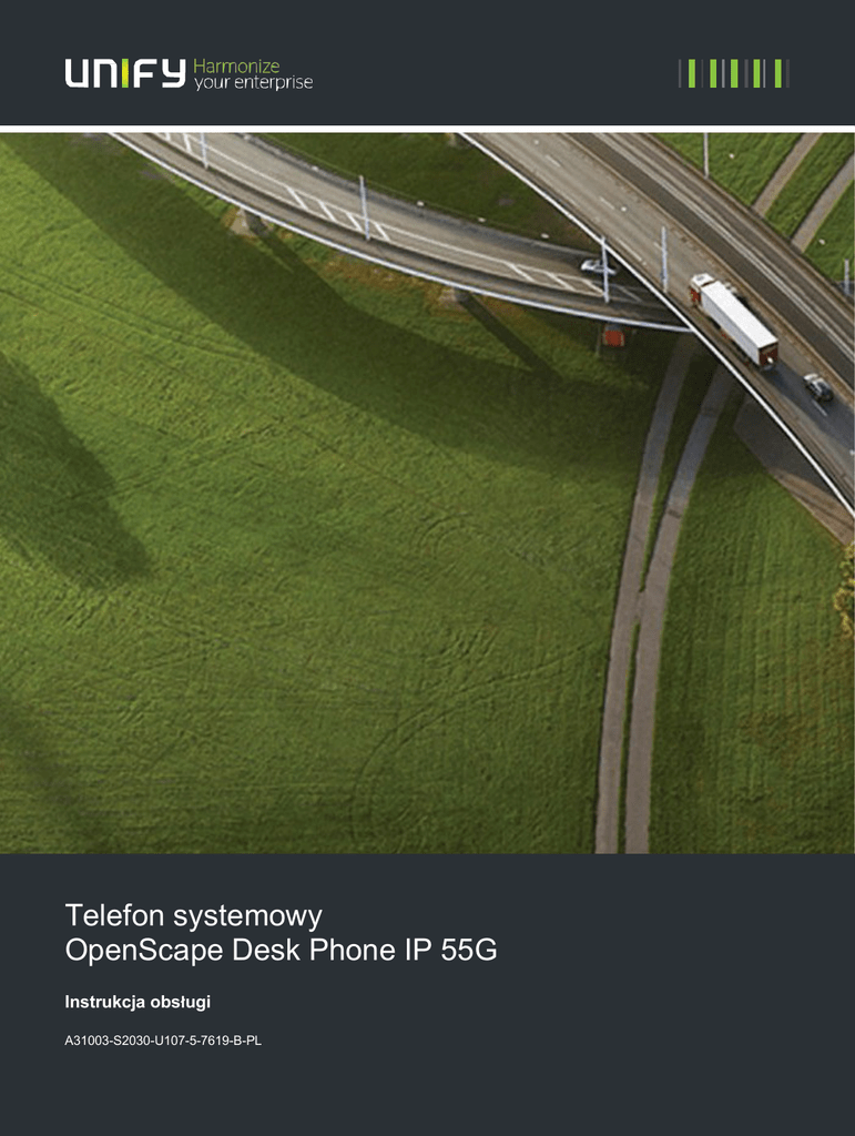 Telefon systemowy OpenScape Desk Phone IP 55G Instrukcja obsługi A31003-S2030-U107-5-7619-B-PL Nasze systemy zapewnienia jakości i ochrony środowiska zostały zaimplementowane zgodnie z wymaganiami norm ISO9001 i ISO14001 i są certyfikowane przez zewnętrzne instytucje. Copyright © Unify GmbH & Co. KG 01/2014 Hofmannstr. 51, 81379 Munich/Germany All rights reserved. Wszelkie prawa zastrzeżone Numer publikacji: A31003-S2030-U107-5-7619-B-PL Informacje przedstawione w tym dokumencie są ogólnym opisem możliwości i nie muszą mieć zastosowania w każdej konkretnej instalacji. Mogą także ulec zmianom wskutek rozwoju systemu. Zakres funkcji gwarantowany w przypadku każdej konretnej instalacji wynika z zapisów odnoszącej się do niej umowy sprzedaży. Dostępność poszczególnych produktów, usług i funkcji może ulec zmianie. Unify, OpenScape, OpenStage i HiPath są zastrzeżonymi znakami towarowymi Unify GmbH & Co. KG. Wszystkie inne użyte nazwy marek, firm, produktów i usług są znakmi towarowymi lub zastrzeżonymi znakami towarowymi ich właścicieli. unify.com Informacje podstawowe 3 Opis elementów telefonu OpenScape IP 55G 9 2 5 8 1 3 7 4 3 1 6 1 Mikrotelefon służy do odbierania i nawiązywania połączeń jak w każdym telefonie. 2 Wyświetlacz graficzny pozwala na intuicyjne korzystanie z funkcji i informacji. 3 Klawisze funkcyjne telefonu służą do korzystania z różnych trybów pracy i funkcji telefonu. Naciśniecie klawisza powoduje wyświetlenie na ekranie menu z kolejnymi funkcjami. Aby przełączać się pomiędzy poszczególnymi zakładkami menu naciśnij klawisz kilka razy aż zostanie wyświetlony oczekiwany zestaw funkcji. 4 Klawisze nawigacyjne pozwalają na wygodne poruszanie się po menu wyświetlanym na ekranie i przechodzenie pomiędzy funkcjami. 5 Klawisze programowalne możesz wykorzystać jako klawisze pamięci pod którymi zapiszesz najczęściej wybierane numery lub funkcje. 6 Klawisze funkcyjne połączenia pozwalają szybko wywołać funkcje najczęściej używane w czasie rozmowy jak przekazanie połączenia czy konferencja. 7 Klawisze audio służą do sterowania dźwiękiem (zmiana głośności, przełączanie słuchawek, wyłączenie mikrofonu). 8 Klawisze kontekstowe mają różne funkcje, które zmieniają się w zależności od tego w jakim stanie znajduje się telefon. Aktualna funkcja każdego klawisza jest pokazywana nad nim na wyświetlaczu. 9 Lampka sygnalizacyjna świeci gdy telefon dzwoni lub gdy jest do odebrania wiadomość w poczcie głosowej. 10 Klawiatura służy do wybierania numerów i wprowadzania tekstu. Informacje podstawowe 4 Rozmieszczenie gniazd i portów Pamięć USB lub kamera USB do rozmów wideo Mikrotelefon Przełącznik sieciowy (sieć LAN) Moduł z dodatkowymi klawiszami Mikrotelefon nagłowny Komputer PC (włączając komputer do gniazda w telefonie oszczędzamy port sieci LAN) Zasilacz (jeśli jest potrzebny). Telefon może być także zasilany z sieci LAN w standardzie PoE Najważniejsze cechy telefonu OpenScape IP 55G OpenScape Desk Phone IP Wyświetlacz Podświetlanie wyświetlacza Klawisze programowalne Funkcja telefonu głośnomówiącego full-duplex Gniazdo i przełącznik mikrotelefonu nagłownego Port USB Złącze do modułów z dodatkowymi klawiszami Przełącznik LAN 10/100/1000 Mb/s 55G Kolorowy TFT 320x240 8 Rekomendujemy użycie kabla C39195-Z7704-A5 przy włączaniu pamięci USB o dużych gabarytach. Port USB nie współpracuje z rozgałęźnikami USB (USB hub) Funkcje telefonu OpenScape IP 55G 5 Klawisze Klawisze funkcyjne połączeń Klawisz Funkcja uzyskiwana po naciśnięciu klawisza Forward Włączenie / wyłączenie przekazywania wywołań. Conference Transfer Hold Rozpoczęcie konferencji. Transfer połączenia (przełączenie do innego abonenta). Zawieszenie połączenia. Klawisze audio Klawisz S p Funkcja uzyskiwana po naciśnięciu klawisza Speaker Włączenie / wyłączenie głośnika (tryb głosnomówiący). Headset Włączenie / wyłączenie słuchawek (mikrotelefonu nagłownego). Vol.+ Zwiększenie głośności. Vol.- Zmniejszenie głośności. Mute Wyłączanie / włączanie mikrofonu. Klawisze funkcyjne telefonu Naciśnij wybrany klawisz aby włączyć żądaną funkcję. Jeśli funkcja ma więcej opcji (kilka zakładek w menu ekranowym) naciskaj klawisz wielokrotnie aby przejść do potrzebnej zakładki. Klawisz Phone Funkcja uzyskiwana po naciśnięciu klawisza Wyświetla podstawowy interfejs telefonu. Dioda LED świeci na czerwono. Directory Wyświetla książki telefoniczne. Dioda LED świeci na czerwono. Call Log Wyświetla listy połączeń (dziennik połączeń) . Dioda LED świeci na czerwono. Message Wyświetla interfejs poczty głosowej. Dioda LED świeci na czerwono. S Services p Wyświetla menu programowania i aplikacji. Dioda LED świeci na czerwono. Wybrana aktualnie funkcja jest sygnalizowana przez ikonę na wyświetlaczu. 6 Funkcje telefonu OpenScape IP 55G Klawisze nawigacji Ta grupa klawiszy służy do poruszania się po menu i wybierania poszczególnych funkcji. Klawisze strzałek służą do przemieszczania się pomiędzy opcjami a klawisz OK do zatwierdzania wybranej funkcji. Naciśnięcie klawisza Realizowana funkcja Przesunięcie w prawo do następnej zakładki. Na listach i w menu: • Powrót o jeden poziom wyżej Przy wybranej pozycji: • Anulowanie wyboru W polach wprowadzania informacji: • Skasowanie jednego znaku na lewo od kursora Na listach i w menu: • Przesunięcie w dół • Przytrzymanie tego klawisza powoduje przejście do ostatniej (najniższej) pozycji na liście Na listach i w menu: • Przesunięcie w górę • Przytrzymanie tego klawisza powoduje przejście do pierwszej (najwyższej) pozycji na liście Przy wybranej pozycji (funkcji, zawartości): • Wykonanie zaznaczonej akcji (funkcji) • Potwierdzenie wyboru Poruszanie się po dzienniku połączeń i książkach telefonicznych Kiedy przeszukujesz książkę telefoniczną m