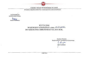 1. Wstęp 1.1 Wytyczne Wojewody Łódzkiego dla marszałków województw, starostów, wójtów, burmistrzów i prezydentów miast do szkolenia obronnego realizowanego w 2014 r., zwane dalej Wytycznymi, wydano na podstawie §10 pkt 3 Rozporządzenia Rady Ministrów z dnia 13 stycznia 2004 r. w sprawie szkolenia obronnego (Dz. U. Nr 16, poz. 150, z późn. zm), zwanego dalej Rozporządzeniem. 1.2 Wytyczne opracowano z uwzględnieniem postanowień następujących dokumentów: a) Wytycznych Ministra Obrony Narodowej dla ministrów i wojewodów do szkolenia obronnego w latach 2013 – 2018; b) Programu Szkolenia Obronnego Województwa Łódzkiego na lata 2013 – 2018. 1.3 Celem Wytycznych jest podsumowanie szkolenia obronnego w 2013 r. realizowanego przez jednostki samorządu terytorialnego, określenie głównych kierunków szkolenia obronnego realizowanego przez marszałka, starostów, wójtów, burmistrzów i prezydentów miast na 2014 r. oraz ustalenie sposobu ich osiągania. 2. Ocena realizacji szkolenia w 2013 r. 2.1 Celem szkolenia obronnego w 2013 roku było przygotowanie kadry kierowniczej i zespołów zadaniowych, wchodzących w skład stanowisk kierowania do działania w wyższych stanach gotowości obronnej państwa, a także sprawdzenie poziomu przygotowania jednostek samorządu terytorialnego do wykonywania zadań obronnych w ramach ćwiczeń terenowych. Ćwiczenia były okazją do praktycznego sprawdzenia (z udziałem służb, inspekcji i straży powiatowych, a także jednostek samorządowych szczebla gminnego) stanów przygotowań powiatów do wykonywania zadań obronnych w warunkach podwyższonych stanów gotowości obronnej państwa. 2.2 Ważnym elementem szkoleniowym było przeprowadzenie dwudniowego szkolenia dla pracowników samorządu terytorialnego, którego celem było usystematyzowanie nabytej wiedzy obronnej z zakresu przygotowań obronnych, realizowanych przez jednostki administracji publicznej w wybranych stanach gotowości obronnej. 2.3 Przeprowadzono szkolenie, mające na celu przygotowanie pracowników służby zdrowia odpowiedzialnych za planowanie i realizację zadań 2 obronnych przez podmioty lecznicze, a także szkolenie przygotowujące pracowników jednostek samorządu terytorialnego szczebla powiatu do realizacji zadań obronnych w zakresie wykonywania kontroli, ochrony informacji niejawnych oraz wykonywania zadań związanych z doręczaniem kart powołania w trybie akcji kurierskiej. Istotną formą szkolenia obronnego dla osób zajmujących kierownicze stanowiska w administracji publicznej były Wyższe Kursy Obronne w Akademii Obrony Narodowej. 2.5 Przebieg realizacji szkolenia obronnego podlegał ocenie w czasie prowadzonych kontroli problemowych przez zespół kontrolny Wojewody Łódzkiego ujętych w „Planie kontroli” w jednostkach organizacyjnych. Za zasadnicze niedociągnięcia w realizacji szkolenia obronnego uznaje się nadal: a) nie ujmowanie w programach wszystkich przedsięwzięć, które powinny wspomagać proces osiągania gotowości do realizacji głównych zadań obronnych powiatu i gminy; b) stanowczo za małą ilość szkoleń realizowaną w formie zajęć praktycznych tj. treningów i gier decyzyjnych; c) zbyt ogólne określenie tematyki szkoleń, niezapewniające prawidłowego przygotowania osób funkcyjnych do realizacji zadań ujętych w planie operacyjnym, w szczególności wynikających z kart realizacji zadań operacyjnych. d) brak objęcia systemem szkolenia obronnego wszystkich jednostek organizacyjnych podległych lub nadzorowanych. 2.6 Przedsięwzięcia szkoleniowe, zgodnie z Rozporządzeniem planowano i realizowano w formie zajęć teoretycznych i praktycznych z położeniem od 2011 r. (tj. po zakończonym sześcioletnim okresie planistycznym) szczególnego nacisku na przedsięwzięcia prowadzone w formie praktycznej. Zgodnie z Wytycznymi Ministra Obrony Narodowej do szkolenia obronnego przyjęto założenie, iż ćwiczenia obronne, w tym gry i treningi, są zasadniczymi formami szkolenia, na których należy skupić główny wysiłek szkoleniowy, przestrzegając jednocześnie zasadę stopniowego dochodzenia do najważniejszych przedsięwzięć szkoleniowych z uwzględnieniem kolejności: zajęcia teoretyczne-gry, treningi-ćwiczenia. 2.7 Realizacja celów szkolenia obronnego przyjęta na 2013 r. była właściwa i ukierunkowana na położenie większego nacisku na szkolenie zapewniające praktyczne przygotowanie kadry kierowniczej i zespołów zadaniowych (grup operacyjnych) do wykonywania zadań zawartych w planach operacyjnych funkcjonowania powiatu i gminy oraz na zgrywanie wybranych elementów systemu obronnego, ze szczególnym 3 uwzględnieniem podsystemu kierowania obronnością w sytuacji podwyższania gotowości obronnej państwa i w czasie wojny. 3. Zasadnicze cele szkoleniowe w 2014 r. 3.1 Głównym celem szkolenia obronnego w 2014 roku jest sprawdzenie w ramach ćwiczenia wojewódzkiego pk. „AKAP-2014” przyjętych rozwiązań w zakresie alarmowego uzupełnienia sił zbrojnych oraz doskonalenie umiejętności kadry kierowniczej i zespołów zadaniowych, wchodzących w skład stanowisk kierowania do działania w wyższych stanach gotowości obronnej państwa. 3.2 Jako cele szczegółowe szkolenia obronnego w 2014 r. przyjmuje się: a) przygotowanie kadry kierowniczej i pracowników bezpośrednio wykonujących zadania obronne jednostek samorządu terytorialnego do wykonywania zadań obronnych na szczeblu powiatu i gminy (miasta) w ramach ćwiczeń powiatowo-gminnych; b) sprawdzenie systemu obiegu informacji w procesie doręczania dokumentów do powołania w relacji WSzW-WKU-Starostwa PowiatoweUrzędy Gminy-Policja na administrowanym terenie; c) doskonalenie umiejętności pracowników szczebla wojewódzkiego, powiatowego i gminnego, w zakresie obsady w Systemie Stałych Dyżurów Wojewody Łódzkiego, w zakresie powierzonych im zadań; d) przygotowanie jednostek organizacyjnych ochrony zdrowia województwa