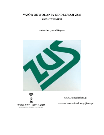 WZÓR ODWOŁANIA OD DECYZJI ZUS Z OMÓWIENIEM autor: Krzysztof Bogusz www.kancelariars.pl www.odwolanieoddecyzjizus.pl Krzysztof Bogusz Wzór - Odwołanie od decyzji ZUS Witaj ! Tak jak obiecywałem w jednym z pierwszych wpisów przygotowałem dla Ciebie wzór odwołania od decyzji ZUS. Mam nadzieję, że okażę się przydatny w sytuacji, gdy Zakład odmówi Ci należnego świadczenia, a jedyną drogą jego uzyskania pozostanie droga sądowa. Oczywiście zdaję sobie sprawę, że lepiej abyś nie musiał z niego korzystać. Niemniej w niektórych jednak przypadkach będzie to niezbędne. Ze wszystkimi tego konsekwencjami, tzn. koniecznością otrzymywania korespondencji sądowej, powinnością stawienia się w sądzie, zgłaszaniem wniosków dowodowych i uczestnictwem w całym postępowaniu sądowym. Owszem, do najłatwiejszych i najprzyjemniejszych zadań to nie należy. Czasem nawet może okazać się nieunikniona pomoc profesjonalnego pełnomocnika (np. radcy prawnego). Postępowanie sądowe jest bowiem bardzo dynamicznym procesem, w którym należy natychmiast reagować. A do tego potrzebna jest gruntowna wiedza prawnicza, obejmująca tak teoretyczne jej podstawy, jak i praktyczne. Pomijając jednak to, musisz wiedzieć, że odwołanie od decyzji ZUS jest pierwszym pismem w sprawie. Wiele od niego zależy i już samo prawidłowe jego sporządzenie może decydować o wygraniu lub przegraniu sprawy. Stąd przygotowany wzór ma na celu pomóc Ci sporządzić owe odwołanie w najlepszy możliwy sposób. Przy tym ma oszczędzić Ci dodatkowej pracy już podczas rozprawy. Dzięki temu nie będziesz musiał powtarzać, czy naprędce konstruować wniosków dowodowych, skoro zawarłeś je już w samym odwołaniu. Ponadto musisz pamiętać że jest to tylko i aż wzór, bowiem z jednej strony dzięki temu z większą swobodą samodzielnie sporządzisz takie pismo, ale z drugiej strony w każdej osobnej sprawie powinieneś je odpowiednio zmodyfikować. To znaczy, że w zależności od przedmiotu sprawy jedne z zaprezentowanych wniosków dowodowych znajdą zastosowanie, a inne nie. Tak samo jak różna będzie treść uzasadnienia. Raz bardziej, a raz mniej obszerna i oparta na innym stanie faktycznym i prawnym. Mimo tego starałem się w uwagach www.odwolanieoddecyzjizus.pl www.kancelariars.pl Krzysztof Bogusz Wzór - Odwołanie od decyzji ZUS zaznaczonych kolorem czerwonym wskazać dosyć szerokie spektrum zastosowania przygotowanego wzoru. W końcu tytułem krótkiego i zwartego uzupełnienia podaję Ci w punktach o czym musisz dodatkowo pamiętać wnosząc odwołanie od decyzji ZUS: 1) odwołanie możesz wnieść na trzy sposoby: a) na piśmie tak jak we wzorze (najczęściej wykorzystywany sposób), b) ustnie do protokołu sporządzonego przez właściwy Oddział ZUS, c) ustnie do protokołu w sądzie właściwym do rozpoznania sprawy albo w sądzie właściwym dla miejsca zamieszkania odwołującego się (wtedy sąd przekazuje protokół organowi, od którego pochodzi zaskarżona decyzja, lub jeżeli jest właściwy do rozpoznania odwołania, to zażąda akt sprawy i nada bieg odwołaniu, przesyłając organowi odpis protokołu), 2) składając odwołanie na piśmie musisz mieć przygotowane dwa podpisane egzemplarze – jeden dla organu rentowego, a drugi dla sądu – które możesz złożyć na dwa sposoby: a) na dzienniku podawczym właściwego Oddziału ZUS (wtedy jednak warto mieć ze sobą trzeci egzemplarz, na którym możesz poprosić o potwierdzenie złożenia odwołania), b) wysłać listem poleconym w polskiej placówce pocztowej operatora wyznaczonego w rozumieniu ustawy z dnia 23 listopada 2012 r. - Prawo pocztowe, 3) odwołanie musisz wnieść w terminie miesiąca od doręczenia odpisu decyzji (odbierając odpis decyzji warto sobie zapisać dzień odebrania, np. na kopercie, którą można spiąć z odpisem decyzji), 4) gdy odwołanie wniesiesz po terminie wymienionym w pkt. 3 spowoduje, że sąd odrzuci odwołanie chyba, że przekroczenie terminu nie będzie nadmierne i nastąpiło z przyczyn niezależnych od odwołującego się (wskazane okoliczności uzasadniające przyjęcie odwołania do rozpoznania pomimo wniesienia go po terminie pozostawione są uznaniu sądu, ale np. okres 6 miesięcy zwłoki w złożeniu odwołania uznaje się za obiektywnie nadmierny), www.odwolanieoddecyzjizus.pl www.kancelariars.pl Krzysztof Bogusz Wzór - Odwołanie od decyzji ZUS 5) wyjątkowo, gdy organ rentowy nie wyda decyzji w terminie dwóch miesięcy, licząc od dnia zgłoszenia roszczenia, odwołanie możesz wnieść w każdym czasie po upływie terminu (taka sytuacja traktowana jest jako decyzja odmowna organu), 6) po wniesieniu odwołania organ rentowy niezwłocznie przekazuje je wraz z aktami sprawy do sądu chyba, że uznaje odwołanie w całości za słuszne, bo wtedy może zmienić lub uchylić zaskarżoną decyzję (w tym wypadku odwołaniu nie nadaje się dalszego biegu), 7) jeżeli w odwołaniu od decyzji organu rentowego wskażesz nowe okoliczności dotyczące niezdolności do pracy lub niezdolności do samodzielnej egzystencji, które powstały po dniu wydania orzeczenia przez lekarza orzecznika ZUS, od którego nie wniosłeś sprzeciwu lub orzeczenia komisji lekarskiej Zakładu Ubezpieczeń Społecznych, organ rentowy nie przekaże odwołania do sądu, lecz skieruję sprawę do lekarza orzecznika do ponownego rozpatrzenia; w takiej sytuacji organ rentowy uchyli poprzednią decyzję, rozpatrzy nowe okoliczności i wyda nową decyzję, od której będziesz mógł odwołać się do sądu; taka procedura ma miejsce także wówczas, gdy nie można ustalić daty powstania wskazanych w odwołaniu nowych okoliczności, 8) UWAGA!!! jeżeli starasz się np. o rentę z tytułu niezdolności do pracy, a nie wniosłeś sprzeciwu od orzeczenia do komisji lekarskiej ZUS i odwołanie oparte jest wyłącznie na zarzutach dotyczących tego orzeczenia, to sąd odwołanie odrzuci; wyjątkowo, 