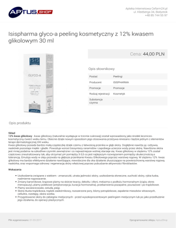 Apteka Internetowa Cefarm24.pl ul. Kleeberga 34, Białystok +48 85 744 55 97 Isispharma glyco-a peeling kosmetyczny z 12% kwasem glikolowym 30 ml Cena: 44,00 PLN Opis słownikowy Postać Peelingi Producent ISISPHARMA Promocje Promocje Rodzaj rejestracji Kosmetyk Substancja czynna - Opis produktu Skład 12% kwas glikolowy - kwas glikolowy (naturalnie występuje w trzcinie cukrowej) został wprowadzony jako środek leczniczokosmetyczny ćwierć wieku temu. Obecnie dzięki nowym sposobom jego stosowania przeżywa renesans i będzie jednym z elementów terapii dermatologicznej XXI wieku. Kwas glikolowy posiada bardzo małą cząsteczkę dzięki czemu z łatwością przenika w głąb skóry. Dogłębnie nawilża ją i odżywia, naskórek pozostaje miękki i gładki. Powoduje wzrost biosyntezy ceramidów i zapobiega ucieczce wody przez skórę. Nawilżona skóra jest mniej podatna na szkodliwe czynniki zewnętrzne i co najważniejsze wolniej starzeje się. Kwas glikolowy w stężeniu 12% został częściowo zneutralizowany tak, aby otrzymać pH pomiędzy 3-3,5 co jest najlepszym rozwiązaniem pomiędzy skutecznością a tolerancją. Emulsja wody w oleju pozwala na głębsze przenikanie Kwasu Glikolowego poprzez warstwę rogową. W stężeniu 12% kwas glikolowy ma bardzo efektywne działanie nawilżające, niewidoczne dla oka działanie złuszczające na powierzchowną warstwę rogową naskórka, oraz wspomaga odnowę i regenerację skóry właściwej poprzez pobudzanie aktywności fibroblastów. Wskazania Uszkodzenia związane z wiekiem - zmarszczki, utrata jędrności skóry, uszkodzenia słoneczne, suchość skóry, rybia łuska, nadmierne rogowacenie. Zmiany barwnikowe, brązowe plamy na skórze twarzy, dekoltu i dłoni, melazma o podłożu hormonalnym (ciąża, okres menopauzy), plamy polekowe (antykoncepcja, kuracja hormonalna), przebarwienia pozapalne, pourazowe i po-trądzikowe. Plamy soczewicowate, ostuda, piegi. Skóra tłusta trądzikowa, trądzik zaskórnikowy, rozszerzone pory, blizny potrądzikowe, zapalenie mieszków włosowych, cellulitis, rozstępy, skóra wiotka. Przygotowanie skóry do zabiegów medycznych - przed wysokoprocentowym peelingiem medycznym lub po jako przedłużenie jego działania, do operacji plastycznych. Plik wygenerowano: 01-03-2017 Oprogramowanie sklepu: AptusShop Apteka Internetowa Cefarm24.pl ul. Kleeberga 34, Białystok +48 85 744 55 97 Działanie redukuje grubość zrogowaciałego naskórka, poprawia wygląd powierzchni skóry, uelastycznia skórę i przyspiesza odnowę komórek, właściwości nawilżające i zmiękczające. Glyco-A poprawia wygląd skóry - świetlistość, koloryt, gładkość - regeneruje skórę starzejącą się, zwiększa jej elastyczność, jędrność i napięcie. Stymuluje syntezę kolagenu, spłyca zmarszczki, usuwa przebarwienia i efekty foto-starzenia się skóry, poprawia stan suchej skóry. Peeling poprawia właściwości biodynamiczne skóry, działa nawilżająco, poprawia mikrokrążenie cery atroficznej źle ukrwionej oraz rozświetla skórę szarą, tzw. "cera palaczy". Wielokrotne stosowanie kwasu glikolowego ma bardzo korzystne działania na skórę właściwą prowadząc do zwiększenia jej grubości o około 25% (skóra z wiekiem staje się cieńsza) bez wywoływania stanu zapalnego. Przy długotrwałym stosowaniu (6 miesięcy i dłużej) preparatów zawierających kwas glikolowy dochodzi do odbudowy włókien sprężystych i poprawy elastyczności skóry. Równolegle obserwuje się zwiększoną produkcję włókien kolagenu i mukopolischarydów, co prowadzi do spłycenia zmarszczek i długofalowej poprawy biologicznych i elastycznych właściwości skóry. Przeciwwskazania ekspozycja skóry na słońce (bardzo słoneczne lato), alergie skórne, aktywna opryszczka, ciąża, karmienie piersią, liczne znamiona melanocytowe, choroby autoimmunologiczne (kolagenozy, pęcherzyce), skóra podrażniona, uszkodzona (nadżerki, otarcia), ciężkie postacie trądziku (liczne krosty, torbiele ropne). Środki ostrożności Przeznaczony do użytku zewnętrznego. Unikać kontaktu ze spojówkami; o ile dojdzie do takiego kontaktu przemyć oczy wodą. Niewykluczone jest wystąpienie uczucia mrowienia lub pojawienie się zaczerwienienia. Objawy te są oznaką działania kremu i na ogół znikają samoistnie po kilku dniach. W czasie ekspozycji na słońce używać kremów z wysokimi filtrami przeciwsłonecznymi. Stosowanie Krem stosujemy przez okres 3 tygodni - wieczorem. Przez pierwsze dwa tygodnie nakładamy go co drugi dzień, stopniowo wydłużając czas aż do pozostawienia na całą noc. W trzecim tygodniu stosujemy codziennie. Następną kurację można powtórzyć po 3 tygodniowej przerwie. Jeżeli w pierwszych minutach po nałożeniu kremu pojawi się uczucie mrowienia, szczypania należy je przeczekać, jest to oznaka działania kwasu. Gdyby jednak uczucie to było zbyt dokuczliwe, krem należy zmyć. Podczas kuracji zalecamy unikanie nasłonecznienia oraz używanie kremów z wysokim filtrem przeciwsłonecznym. Isis-pharma UVEBLOCK SPF 50+. Glyco-A może być stosowany oddzielnie lub jako uzupełnienie innych preparatów. Aby osiągnąć lepsze efekty nakładamy krem na dokładnie oczyszczoną skórę przy pomocy preparatu, który nie narusza jej pH, ale jednocześnie dokładnie usuwa warstwę tłuszczu. Absolutnie należy unikać stosowania mydła, którego zbyt wysokie pH mogłoby zneutralizować efekty działania kwasu. Nałożyć warstwę kremu Glyco-A na miejsca, które będą poddane leczeniu (twarz lub inne partie ciała). Plik wygenerowano: 01-03-2017 Powered by TCPDF (www.tcpdf.org) Oprogramowanie sklepu: AptusShop