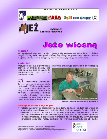 realizują organizacje swój zwierz kampania edukacyjna marzec Jeże wiosną W cieplejszych regionach kraju pojawiają się pierwsze wybudzenia jeży z hibernacji - szczególnie tam, gdzie stopiły się śniegi. W pierwszej kolejności budzą się jeże, które jesienią osiągnęły niewystarczającą wagę do zimowania. kwiecień Wszystkie jeże już się wybudziły i aktywnie poszukują pożywienia. Poruszają się głównie w swojej okolicy, ale jeśli pokarmu jest za mało, to przemieszczają się też na sąsiednie tereny. maj Trwa intensywne żerowanie. Samce wędrują w poszukiwaniu partnerek. Wiele z nich wpada pod koła samochodów na drogach i szosach. Pod koniec miesiąca ciężarne samice wytrwale budują legowiska porodowe znosząc tam zrywane przez siebie trawy, liście i siano. Osłabiony po zimie jeż w gabinecie weterynarza Wymagana ochrona czynna jeży: Æ Podczas wiosennych porządków w ogrodach, parkach i sadach nie wolno od razu spalać pozostawionych jesienią stert liści lub gałęzi. Należy najpierw ostrożnie - i koniecznie rękoma, a nie łopatą, grabiami czy widłami - sprawdzić, czy w stertach nie ma legowiska jeży. Jeśli jest, to nie wolno legowiska ani jeża przenosić, a pozostawić nienaruszone. W przypadku wymuszonego naruszenia legowiska, należy delikatnie je przykryć sianem, liśćmi lub suchą Projekt dofinansowany z Mechanizmu Finansowego Europejskiego Obszaru Gospodarczego 2009-2014 Program PL02 „Ochrona różnorodności biologicznej i ekosystemów” realizują organizacje trawą i gałęziami, gdyż najpewniej jest to przygotowane miejsce do porodu. Nie wolno pod żadnym pozorem jeża brać na ręce. Matkę zaś dokarmiać wystawiając w dzień i wieczorem mokrą i suchą karmę dla kotów oraz płaskie naczynie z wodą do picia. Æ Nie spuszczać luzem psów bez kagańca. Uważać, by psy nie rozdrapywały legowisk jeży, by nie kaleczyły i nie wyciągały jeżyków! Kąpanie brudnego jeża w ciepłej wodzie Æ Pod żadnym pozorem nie wypalać traw ani łąk! Æ Jeśli spotka się jeża chorego, rannego lub osłabionego, należy zabrać go nie- zwłocznie do pudła wyściełanego szmatkami i zgłosić się do najbliższego lekarza weterynarii. Po opatrzeniu postępować zgodnie z wytycznymi weterynarza, zaś jeża przenieść do ogrzewanego pomieszczenia z oknem. Ustawić w nim duży karton tekturowy lub wydzielić miejsce powierzchni przynajmniej 2 m2 a w nim mniejszy karton o wymiarach ok. 30x30x30 cm (domek) zamykany od góry. W bocznej ściance domku wyciąć w narożu otwór wejściowy 10x10 cm, zaś wnętrze wyłożyć ręcznikiem papierowym i kawałkami tego ręcznika porwanego na strzępy długości 4-5 cm w takiej ilości, by jeż mógł się zagrzebać. Jeśli jeż jest osłabiony i wymaga wzmocnienia, karmić go mokrą karmą Royal Canin Convalescence Support podaną na płaskim naczyniu w ilości czubatej łyżki na jeden raz 3 razy na dobę: rano, w południe i wieczorem, ale od wagi powyżej 550 G karmić należy tylko dwa razy: o zmierzchu i przed pójściem człowieka spać. Poprawny sposób trzymania jeża Projekt dofinansowany z Mechanizmu Finansowego Europejskiego Obszaru Gospodarczego 2009-2014 Program PL02 „Ochrona różnorodności biologicznej i ekosystemów” realizują organizacje Do pomieszczenia z jeżem nie wprowadzać psów ani kotów, dzieci ani osób postronnych. Jeżowi zapewnić spokój. Bez potrzeby nie brać na ręce, zaś do ważenia brać tylko w rękawiczkach. Sprzątać kojec nie rzadziej niż co drugi dzień, a do mycia nie stosować detergentów, lecz ciepłą wodę z mydłem. Sprzątanie wykonywać tylko wtedy, gdy jeże śpią w domku - czyli w dzień - najlepiej z rana. Po osiągnięciu stanu zdrowia jeża uznanego przez weterynarza jako zadowalający, zmienić karmę na mokrą przeznaczoną dla małych kotków np. Whiskas Junior w ilości 1 łyżki na jedno karmienie z dodatkiem jednej łyżki karmy suchej Royal Canin Kitten - 3 razy dziennie. Od tego czasu jeża przemieścić do kojca w ogrodzie powierzchni przynajmniej 9 m2, gdzie należy postawić domek z desek z kanałem wejściowym o wymiarach 10x10 cm. Plan budowy domku znajduje się na w poradniku na stronie www.naszejeze.org, zaś do domku należy włożyć sporą garść siana. Zdrowy jeż w kojcu ogrodowym przed uwolnieniem Po wystawieniu karmy każdorazowo należy natychmiast się oddalić (nie stać obok), gdyż jeż musi zachować naturalne dzikie zachowania a człowiek dla niego, to wróg. Nie wyjmować jeża z domku bez potrzeby. Ważenie kontrolne wykonywać raz na tydzień na wadze kuchennej - stale o tej samej porze. Gdy w nocy temperatura się podniesie do przynajmniej 9 oC, domek wraz z jeżem w środku, po pierwszym karmieniu (o zmierzchu), przenieść jak najbliżej miejsca znalezienia jeża, ale w okolicy bezpiecznej. Nie może to być: las, teren podmokły, łąka, pole orne ani otoczenie z hałasem czy zapachami chemicznymi. Domek pozostawić na kilka dni, po czym można go zabrać. Najlepszym miejscem do wypuszczenia jeża na wolność są: obrzeża lasów i parków, stare ogrody, nieużytki, zarośla i zakrzaczenia oraz sąsiedztwo zabudowań wiejskich - jak najdalej od ruchliwych szos, ulic i agresywnych psów. Uwagi: ü Jeże objęte są ochroną ścisłą i zabronione jest przetrzymywanie jeży bez uzasadnionego powodu oraz bez zezwolenia. Dlatego, jeśli ratowałeś osierocone jeże, jak tylko zajdą podane wyżej okoliczności, jeże należy niezwłocznie wypuścić do środowiska naturalnego. Projekt dofinansowany z Mechanizmu Finansowego Europejskiego Obszaru Gospodarczego 2009-2014 Program PL02 „Ochrona różnorodności biologicznej i ekosystemów” realizują organizacje ü Podczas opieki nad jeżem, codziennie uważnie przyjrzyj się jego odchodom. Zdrowy jeż ma odchody w odcieniu brązowym, granatowym, zielonym lub czarnym - zwarte i w jednolitym kolorze. Jeśli w odchodach zauważysz jaśniejsze 