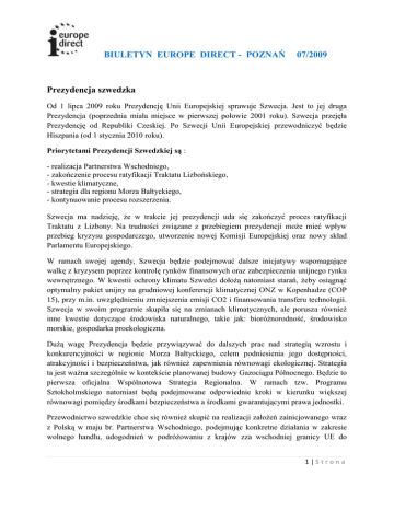 BIULETYN EUROPE DIRECT - POZNAŃ 07/2009 Prezydencja szwedzka Od 1 lipca 2009 roku Prezydencję Unii Europejskiej sprawuje Szwecja. Jest to jej druga Prezydencja (poprzednia miała miejsce w pierwszej połowie 2001 roku). Szwecja przejęła Prezydencję od Republiki Czeskiej. Po Szwecji Unii Europejskiej przewodniczyć będzie Hiszpania (od 1 stycznia 2010 roku). Priorytetami Prezydencji Szwedzkiej są : - realizacja Partnerstwa Wschodniego, - zakończenie procesu ratyfikacji Traktatu Lizbońskiego, - kwestie klimatyczne, - strategia dla regionu Morza Bałtyckiego, - kontynuowanie procesu rozszerzenia. Szwecja ma nadzieję, że w trakcie jej prezydencji uda się zakończyć proces ratyfikacji Traktatu z Lizbony. Na trudności związane z przebiegiem prezydencji może mieć wpływ przebieg kryzysu gospodarczego, utworzenie nowej Komisji Europejskiej oraz nowy skład Parlamentu Europejskiego. W ramach swojej agendy, Szwecja będzie podejmować dalsze inicjatywy wspomagające walkę z kryzysem poprzez kontrolę rynków finansowych oraz zabezpieczenia unijnego rynku wewnętrznego. W kwestii ochrony klimatu Szwedzi dołożą natomiast starań, żeby osiągnąć optymalny pakiet unijny na grudniowej konferencji klimatycznej ONZ w Kopenhadze (COP 15), przy m.in. uwzględnieniu zmniejszenia emisji CO2 i finansowania transferu technologii. Szwecja w swoim programie skupiła się na zmianach klimatycznych, ale porusza również inne kwestie dotyczące środowiska naturalnego, takie jak: bioróżnorodność, środowisko morskie, gospodarka proekologiczna. Dużą wagę Prezydencja będzie przywiązywać do dalszych prac nad strategią wzrostu i konkurencyjności w regionie Morza Bałtyckiego, celem podniesienia jego dostępności, atrakcyjności i bezpieczeństwa, jak również zapewnienia równowagi ekologicznej. Strategia ta jest ważna szczególnie w kontekście planowanej budowy Gazociągu Północnego. Będzie to pierwsza oficjalna Wspólnotowa Strategia Regionalna. W ramach tzw. Programu Sztokholmskiego natomiast będą podejmowane odpowiednie kroki w kierunku większej równowagi pomiędzy środkami bezpieczeństwa a środkami gwarantującymi prawa jednostki. Przewodnictwo szwedzkie chce się również skupić na realizacji założeń zainicjowanego wraz z Polską w maju br. Partnerstwa Wschodniego, podejmując konkretne działania w zakresie wolnego handlu, udogodnień w podróżowaniu z krajów zza wschodniej granicy UE do 1|Strona BIULETYN EUROPE DIRECT - POZNAŃ 07/2009 krajów unijnych i odwrotnie, jak również pod kątem reform społecznych. Do Partnerstwa zostały zaproszone Ukraina, Białoruś, Mołdawia, Armenia, Azerbejdżan i Gruzja. Będą kontynuowane także prace związane z dalszym rozszerzaniem UE, w pierwszej kolejności o Chorwację, Turcję i Macedonię, a w dalszym rzędzie o pozostałe kraje Byłej Republiki Jugosławii. Podczas swojej prezydencji w najbliższym półroczu Szwedzi zamierzają również przybliżyć Unię Europejską i jej polityki obywatelom. Szwedzkie przewodnictwo ma w sposób szczególny cechować przejrzystość działań, gwarancja łatwego dostępu do dokumentów, a także otwartość na debatę publiczną. Do celów informacyjno-komunikacyjnych posłuży specjalna strona internetowa prezydencji Szwecji: www.se2009.eu (chcąc zainteresować swoich mieszkańców sprawami UE, Szwecja jako pierwsza będzie używać domeny eu). Logo Prezydencji Szwedzkiej, to kula ziemska ze stylizowaną literą „S”, która rozszerza się w górnej części globu, skupiając uwagę na leżącej na północy Szwecji. Litera, która jest koloru żółtego symbolizuje także promień światła, który rozświetla ziemię. „Klimat”, „światło”, „transparentność” oraz „dialog” były kluczowymi słowami podczas opracowywania logo. Prezydencja to szansa dla Szwecji, aby mieć wpływ na ważne dla UE sprawy. Główną rolą Prezydencji jest kierowanie pracą Rady Unii Europejskiej, a także zabezpieczenie rozwoju najistotniejszych dla UE kwestii. Szwecja będzie przewodniczyć wszystkim posiedzeniom Rady Unii Europejskiej i jej pracujących komitetów, negocjować kompromisy ze wszystkimi państwami członkowskimi oraz występować w imieniu Unii Europejskiej w negocjacjach z krajami z poza Unii Europejskiej i z międzynarodowymi organizacjami. Będzie reprezentować Radę Unii Europejskiej w kontaktach z innymi instytucjami Unii Europejskiej. Podczas Prezydencji, w Szwecji odbędzie się ponad 100 spotkań, w tym 11 nieformalnych spotkań ministrów. Z przyczyn logistycznych, ekonomicznych i mając na uwadze ochronę środowiska ograniczono liczbę miejsc, w których będą odbywały się wydarzenia – odbędą się one w 7 miejscowościach i w 21 lokalizacjach, a nie jak poprzednio w 44 miejscach. Spotkaniom będą towarzyszyć przeznaczone dla szerokiej publiczności wydarzenia kulturalne, a także konferencje i seminaria. W celu obniżenia kosztów wydarzenia będą następowały bezpośrednio po sobie. Szwedzki rząd planuje wydać na potrzeby prezydencji około 77 milionów euro (z czego połowę kosztów pochłonie organizacja spotkań), Republika Czeska przeznaczyła na ten cel 124, 5 milionów euro, a Francja wydała 190 milionów. Szwecja to kraj, który przywiązuje dużą wagę do kwestii związanych z ochroną środowiska i klimatu. Sprawy związane z ochroną środowiska są także priorytetowymi dla Prezydencji Szwecji. Do ochrony środowiska przywiązuje się dużą rolę również przy organizacji spotkań. Sekretariat, który zajmuje się logistyką posiedzeń wymaga od swoich dostawców, aby 2|Strona BIULETYN EUROPE DIRECT - POZNAŃ 07/2009 zwracali szczególna uwagę na ochronę środowiska. Uczestnicy spotkań będą korzystali z hoteli, które respektują ochronę środowiska. W miarę możliwości będą używane środki transportu o niskiej emisji dwutlenku węgla. Umieszczając spotkania i wydarzenia tylko w kilku miejscach i or