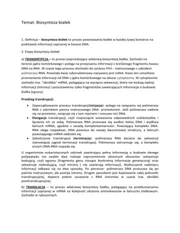 Temat: Biosynteza białek 1. Definicja – biosynteza białek to proces powstawania białek w każdej żywej komórce na podstawie informacji zapisanej w kwasie DNA. 2. Etapy biosyntezy białek: a) TRANSKRYPCJA – to proces poprzedzający właściwą biosyntezę białka. Zachodzi na terenie jądra komórkowego i polega na przepisaniu informacji z kreślonego fragmentu kwasu DNA na RNA. W czasie tego procesu dochodzi do syntezy RNA - matrycowego z udziałem polimerazy RNA. Powstały kwas rybonukleinowy nazywany jest mRNA. Kwas ten umożliwia przeniesienie informacji od DNA z jądra komórkowego na obszar cytoplazmy. W cytoplazmie zachodzi tzw. "obróbka" mRNA, polegająca na wycięciu sekwencji, które nie kodują żadnej informacji (introny) i pozostawieniu tylko fragmentów zawierających informacje o budowie białka (egzony). Przebieg transkrypcji: Zapoczątkowanie procesu transkrypcji(inicjacja)- polega na związaniu się polimerazy RNA z odcinkiem pasma matrycowego DNA- promotorem. Jeśli polimeraza natknie się na promotor, związuje się z tym rejonem i rozsuwa nici DNA. Elongacja transkrypcji, czyli rozpoczęcie wstawiania odpowiednich nukleotydów i łączenia ich ze sobą. Polimeraza RNA przesuwa się wzdłuż helisy DNA i wydłuża łańcuch mRNA, zgodnie z zasadą komplementarności. Powstający kompleks DNARNA ulega rozpadowi, DNA powraca do swojej dwuniciowej struktury, a łańcuch powstającego mRNA oddziela się. Zakończenie transkrypcji (terminacja) -polimeraza RNA dociera do sekwencji stanowiącej sygnał terminacji transkrypcji. Polimeraza zatrzymuje się, a kompleks enzym-DNA-RNA rozpada się. U organizmów eukariotycznych odcinek zawierający pełna informację o budowie danego polipeptydu ma zwykle dwa rodzaje naprzemiennie ułożonych obszarów: sekwencje kodującą, czyli egzony (fragmenty genu niosące konkretną informacje genetyczną) oraz sekwencje niekodującą, czyli introny ( nie zawierają informacji). Wykluczanie nadmiaru informacji odbywa się na dwa sposoby. Po pierwsze- polimeraza DNA przesuwa się po paśmie matrycowym, ale pomija introny. Drugim sposobem jest kopiowanie całej jednostki transkrypcyjnej, dopiero potem usuwanie z RNA intronów w czasie tzw. obróbki posttranskrypcyjnej . b) TRANSLACJA – to proces właściwej biosyntezy białka, polegający na przetłumaczeniu informacji zapisanej w mRNA na kolejność ułożenia aminokwasów w łańcuchu białkowym. Zachodzi w rybosomach. Przebieg translacji Translacja poprzedzona jest aktywacją aminokwasów polegającą na połączeniu się aminokwasu z cząsteczką tRNA i wytworzenie kompleksu aminoacylo tRNA. Cząsteczki tRNA odpowiadają za dostarczenie aminokwasów do rybosomu w odpowiedniej kolejności Zapoczątkowanie translacji – inicjacja polega na połączeniu podjednostek rybosomowych i dołączeniu do nich mRNA. Rybosom rozpoznaje na mRNA tzw, trójkę startową nukleotydów AUG, która koduje aminokwas zwany metioniną. To pierwszy aminokwas w powstającym łańcuchu białkowym Elongacja- wydłużanie łańcucha aminokwasów – rybosom przesuwa się po nici m RNA i odczytuje kolejne trójki nukleotydów. Zgodnie z informacją zapisana na mRNA z cytoplazmy przywędrowują cząsteczki tRNA z określonymi aminkwasami. Aminokwasy łączą się ze sobą za pomocą wiązań peptydowych. Wolne tRNA (po zostawieniu aminokwasu) wracają do cytoplazmy a rybosom przesuwa się o kolejna trójkę nukleotydów. Przyłącza się kolejne tRNA z kolejnym aminokwasem i proces powtarza się cyklicznie. Zakończenie translacji - terminacja odbywa się, gdy w rybosom natrafi na kodony STOP – trójki nonsensowne: AUU, UAG, UGA, niekodujące żadnego aminokwasu. Uwalnia się łańcuch polipeptydowy, tRNA oddziela się od mRNA, a rybosom rozpada się na podjednostki. Etapy biosyntezy białka