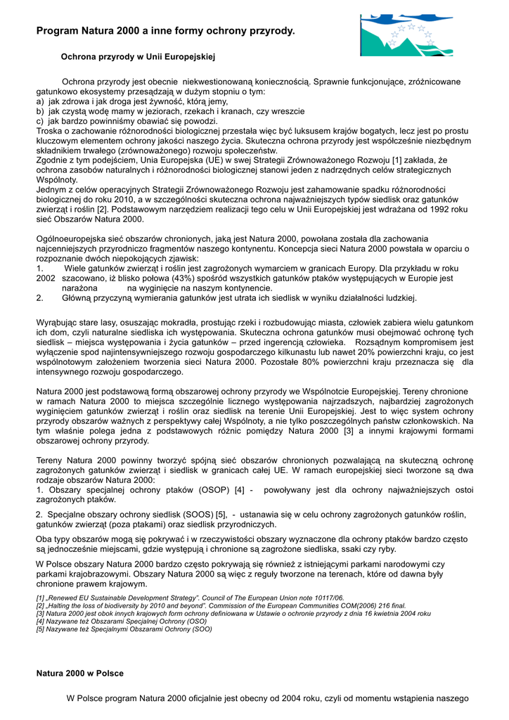 Program Natura 2000 a inne formy ochrony przyrody. Ochrona przyrody w Unii Europejskiej Ochrona przyrody jest obecnie niekwestionowaną koniecznością. Sprawnie funkcjonujące, zróżnicowane gatunkowo ekosystemy przesądzają w dużym stopniu o tym: a) jak zdrowa i jak droga jest żywność, którą jemy, b) jak czystą wodę mamy w jeziorach, rzekach i kranach, czy wreszcie c) jak bardzo powinniśmy obawiać się powodzi. Troska o zachowanie różnorodności biologicznej przestała więc być luksusem krajów bogatych, lecz jest po prostu kluczowym elementem ochrony jakości naszego życia. Skuteczna ochrona przyrody jest współcześnie niezbędnym składnikiem trwałego (zrównoważonego) rozwoju społeczeństw. Zgodnie z tym podejściem, Unia Europejska (UE) w swej Strategii Zrównoważonego Rozwoju [1] zakłada, że ochrona zasobów naturalnych i różnorodności biologicznej stanowi jeden z nadrzędnych celów strategicznych Wspólnoty. Jednym z celów operacyjnych Strategii Zrównoważonego Rozwoju jest zahamowanie spadku różnorodności biologicznej do roku 2010, a w szczególności skuteczna ochrona najważniejszych typów siedlisk oraz gatunków zwierząt i roślin [2]. Podstawowym narzędziem realizacji tego celu w Unii Europejskiej jest wdrażana od 1992 roku sieć Obszarów Natura 2000. Ogólnoeuropejska sieć obszarów chronionych, jaką jest Natura 2000, powołana została dla zachowania najcenniejszych przyrodniczo fragmentów naszego kontynentu. Koncepcja sieci Natura 2000 powstała w oparciu o rozpoznanie dwóch niepokojących zjawisk: 1. Wiele gatunków zwierząt i roślin jest zagrożonych wymarciem w granicach Europy. Dla przykładu w roku 2002 szacowano, iż blisko połowa (43%) spośród wszystkich gatunków ptaków występujących w Europie jest narażona na wyginięcie na naszym kontynencie. 2. Główną przyczyną wymierania gatunków jest utrata ich siedlisk w wyniku działalności ludzkiej. Wyrąbując stare lasy, osuszając mokradła, prostując rzeki i rozbudowując miasta, człowiek zabiera wielu gatunkom ich dom, czyli naturalne siedliska ich występowania. Skuteczna ochrona gatunków musi obejmować ochronę tych siedlisk – miejsca występowania i życia gatunków – przed ingerencją człowieka. Rozsądnym kompromisem jest wyłączenie spod najintensywniejszego rozwoju gospodarczego kilkunastu lub nawet 20% powierzchni kraju, co jest wspólnotowym założeniem tworzenia sieci Natura 2000. Pozostałe 80% powierzchni kraju przeznacza się dla intensywnego rozwoju gospodarczego. Natura 2000 jest podstawową formą obszarowej ochrony przyrody we Wspólnotcie Europejskiej. Tereny chronione w ramach Natura 2000 to miejsca szczególnie licznego występowania najrzadszych, najbardziej zagrożonych wyginięciem gatunków zwierząt i roślin oraz siedlisk na terenie Unii Europejskiej. Jest to więc system ochrony przyrody obszarów ważnych z perspektywy całej Wspólnoty, a nie tylko poszczególnych państw członkowskich. Na tym właśnie polega jedna z podstawowych różnic pomiędzy Natura 2000 [3] a innymi krajowymi formami obszarowej ochrony przyrody. Tereny Natura 2000 powinny tworzyć spójną sieć obszarów chronionych pozwalającą na skuteczną ochronę zagrożonych gatunków zwierząt i siedlisk w granicach całej UE. W ramach europejskiej sieci tworzone są dwa rodzaje obszarów Natura 2000: 1. Obszary specjalnej ochrony ptaków (OSOP) [4] - powoływany jest dla ochrony najważniejszych ostoi zagrożonych ptaków. 2. Specjalne obszary ochrony siedlisk (SOOS) [5], - ustanawia się w celu ochrony zagrożonych gatunków roślin, gatunków zwierząt (poza ptakami) oraz siedlisk przyrodniczych. Oba typy obszarów mogą się pokrywać i w rzeczywistości obszary wyznaczone dla ochrony ptaków bardzo często są jednocześnie miejscami, gdzie występują i chronione są zagrożone siedliska, ssaki czy ryby. W Polsce obszary Natura 2000 bardzo często pokrywają się również z istniejącymi parkami narodowymi czy parkami krajobrazowymi. Obszary Natura 2000 są więc z reguły tworzone na terenach, które od dawna były chronione prawem krajowym. [1] „Renewed EU Sustainable Development Strategy”. Council of The European Union note 10117/06. [2] „Halting the loss of biodiversity by 2010 and beyond”. Commission of the European Communities COM(2006) 216 final. [3] Natura 2000 jest obok innych krajowych form ochrony definiowana w Ustawie o ochronie przyrody z dnia 16 kwietnia 2004 roku [4] Nazywane też Obszarami Specjalnej Ochrony (OSO) [5] Nazywane też Specjalnymi Obszarami Ochrony (SOO) Natura 2000 w Polsce W Polsce program Natura 2000 oficjalnie jest obecny od 2004 roku, czyli od momentu wstąpienia naszego kraju do Unii Europejskiej. Jednak prace przygotowawcze, polegające głównie na przygotowaniu list obszarów spełniających krytera Sieci, rozpoczęły się znacznie wcześniej. W 2004 roku uchwalona została, uwzględniająca prawo wspólnotowe w tym zakresie, Ustawa o ochronie przyrody, która stanowi podstawę dla tworzenia i funkcjonowania sieci Natura 2000 w Polsce. Zgodnie z ustawą minister środowiska wyznacza obszary specjalnej ochrony ptaków, zaś specjalne obszary ochrony siedlisk minister wyznacza po uzgodnieniu z Komisją Europejską. Proces tworzenia sieci obszarów Natura 2000 w Polsce przebiega od początku z pewnymi trudnościami. Autorzy pierwszej koncepcji sieci w Polsce zakładali, że ostoje zajmą kilkanaście procent powierzchni kraju. Niestety ze względów pozamerytorycznych (głównie politycznych) Rząd przekazał Komisji Europejskiej znacznie okrojoną listę obszarów siedliskowych. Również obszarów ptasich zostało wyznaczonych mniej niż planowano. Lista obszarów Natura 2000 była i jest pod naciskiem Komisji Europejskiej poszerzana o nowe obszary. Do chwili obecnej ustanowiono w drodze rozporządzenia: a) 141 obszarów specjalnej ochrony ptaków, oraz b) 364 specjalne obszary ochrony siedlisk. Powyż
