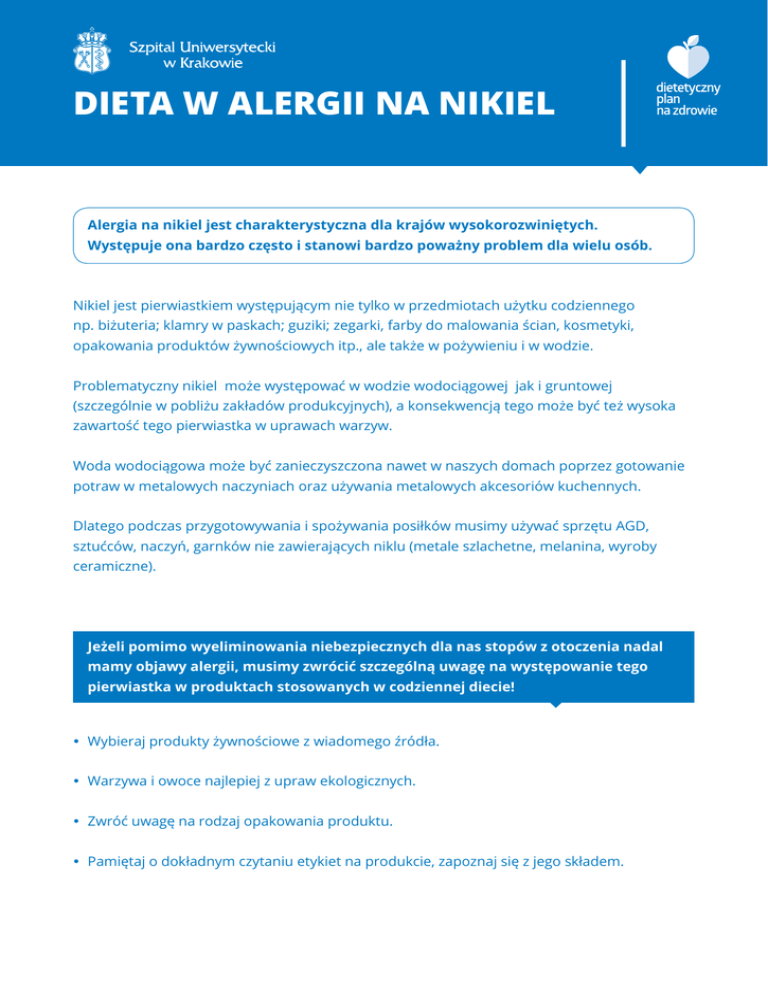 DIETA W ALERGII NA NIKIEL Alergia na nikiel jest charakterystyczna dla krajów wysokorozwiniętych. Występuje ona bardzo często i stanowi bardzo poważny problem dla wielu osób. Nikiel jest pierwiastkiem występującym nie tylko w przedmiotach użytku codziennego np. biżuteria; klamry w paskach; guziki; zegarki, farby do malowania ścian, kosmetyki, opakowania produktów żywnościowych itp., ale także w pożywieniu i w wodzie. Problematyczny nikiel może występować w wodzie wodociągowej jak i gruntowej (szczególnie w pobliżu zakładów produkcyjnych), a konsekwencją tego może być też wysoka zawartość tego pierwiastka w uprawach warzyw. Woda wodociągowa może być zanieczyszczona nawet w naszych domach poprzez gotowanie potraw w metalowych naczyniach oraz używania metalowych akcesoriów kuchennych. Dlatego podczas przygotowywania i spożywania posiłków musimy używać sprzętu AGD, sztućców, naczyń, garnków nie zawierających niklu (metale szlachetne, melanina, wyroby ceramiczne). Jeżeli pomimo wyeliminowania niebezpiecznych dla nas stopów z otoczenia nadal mamy objawy alergii, musimy zwrócić szczególną uwagę na występowanie tego pierwiastka w produktach stosowanych w codziennej diecie! yy Wybieraj produkty żywnościowe z wiadomego źródła. yy Warzywa i owoce najlepiej z upraw ekologicznych. yy Zwróć uwagę na rodzaj opakowania produktu. yy Pamiętaj o dokładnym czytaniu etykiet na produkcie, zapoznaj się z jego składem. DIETA W ALERGII NA NIKIEL TABELA PRODUKTÓW ZAWIERAJĄCYCH NIKIEL Produkty zbożowe produkty z pełnego ziarna, gryka, proso (kasza jaglana), owies* (płatki owsiane) Nabiał ser topiony*, ser twardy (np. ementaler, cheddar, parmezan), ser półtwardy (np. tylżycki, edamski, gouda) Mięso, drób, ryby podroby (mogą być zawarte też w kiełbasach rozdrobnionych, pasztecie) konserwy mięsne owoce morza (krab, małża, ostryga, homar) ryby (śledź*, tuńczyk*, makrela*, sardynka*, szczupak) konserwy rybne Owoce i warzywa gruszka, wiśnia*, brzoskwinia, banan, ananas, suszone śliwki warzywa kapustne (kapusta włoska, czerwona, biała, pekińska), sałata, brokuł, szparagi, pietruszka, marchew, cebula, boćwina, kalarepa, pomidor, papryka, kukurydza*, chrzan, rabarbar nasiona roślin strączkowych (fasola, bób, soczewica, groch), ziarno soi i jej produkty* warzywa i owoce konserwowe* Tłuszcze margaryna* (proces utwardzania) Słodycze, desery, bakalie kakao*, czekolada* i wszystkie produkty z ich zawartością migdały* (marcepan), orzechy*, orzeszki ziemne*, pistacje, ziarno słonecznika oraz wszystkie produkty z ich zawartością Napoje soki owocowe* (szczególnie kwaśne), kawa*, mocna herbata* (zielona, czarna) kakao*, piwo*, wino* (szczególnie czerwone) Inne koncentrat pomidorowy*, ketchup* ocet (winny, stołowy, jabłkowy), sos sojowy*, drożdże *produkty na które należy zwrócić szczególną uwagę Samodzielny Publiczny Zakład Opieki Zdrowotnej KRS. 0000024155 • 31-501 Kraków, ul. Mikołaja Kopernika 36 tel.: 12 424 70 00 • fax 12 424 74 87 www.su.krakow.pl/dietetyczny-plan-na-zdrowie