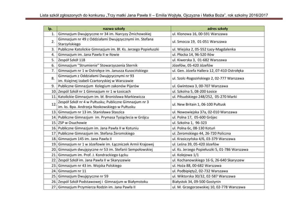 Lista szkół zgłoszonych do konkursu „Trzy matki Jana Pawła II – Emilia Wojtyła, Ojczyzna i Matka Boża”, rok szkolny 2016/2017 lp. nazwa szkoły 1. Gimnazjum Dwujęzyczne nr 34 im. Narcyzy Żmichowskiej Gimnazjum nr 49 z Oddziałami Dwujęzycznymi im. Stefana 2. Starzyńskiego 3. Publiczne Katolickie Gimnazjum im. Bł. Ks. Jerzego Popiełuszki 4. Gimnazjum im. Jana Pawła II w Iłowie 5. Zespół Szkół 118 6. Gimnazjum ''Strumienie'' Stowarzyszenia Sternik 7. Gimnazjum nr 1 w Ostrołęce im. Janusza Kusocińskiego Gimnazjum z Oddziałami Dwujęzycznymi nr 93 8. im. Księżnej Izabeli Czartoryskiej w Warszawie 9. Publiczne Gimnazjum Kolegium zakonów Pijarów 10. Zespól Szkół nr 1 Gimnazjum nr 1 w Łosicach 11. Katolickie Gimnazjum im. bł. Bronisława Markiewicza Zespół Szkół nr 4 w Pułtusku; Publiczne Gimnazjum nr 3 12. im. ks. Bpa. Andrzeja Noskowskiego w Pułtusku 13. Gimnazjum nr 13 im. Stanisława Staszica 14. Publiczne Gimnazjum im. Prymasa Tysiąclecia w Grójcu 15. ZSP w Osuchowie 16. Publiczne Gimnazjum im. Jana Pawła II w Kotuniu 17. Publiczne Gimnazjum im. Stefana Żeromskiego 18. Gimnazjum 145 im. Jana Pawła II 19. Gimnazjum nr 1 w Józefowie im. Łączniczek Armii Krajowej 20. Gimnazjum dwujęzyczne nr 53 im. Stefanii Sempołowskiej 21. Gimnazjum im. Prof. J. Kondrackiego Łącku 22. Zespól Szkół im. Jana Pawła II w Skaryszewie 23. Gimnazjum nr 43 im. Wojska Polskiego 24. Gimnazjum nr 11 25. Gimnazjum Dwujęzyczne nr 59 26. Zespól Szkół Podstawowej i Gimnazjum w Białymstoku 27. Gimnazjum Przymierza Rodzin im. Jana Pawła II adres szkoły ul. Klonowa 16, 00-591 Warszawa ul. Smocza 19, 01-051 Warszawa ul. Wiejska 2, 05-552 Łazy-Magdalenka ul. Płocka 14, 96-520 Iłów ul. Kiwerska 3, 01-682 Warszawa Józefów, 05-420 Józefów ul. Gen. Józefa Hallera 12, 07-410 Ostrołęka ul. Szolc-Rogozińskiego 2, 02-777 Warszawa ul. Gwintowa 3, 00-707 Warszawa ul. Szkolna 5, 08-200 Łosice ul. Piłsudskiego 248/252, 05-270 Marki ul. New Britain 1, 06-100 Pułtusk ul. Nowowiejska 37a, 02-010 Warszawa ul. Polna 17, 05-600 Grójec ul. Szkolna 1, 96-323 ul. Polna 6c, 08-130 Kotuń ul. Żeromskiego 44, 26-720 Policzna ul. Krasiczyńska 4/6, 03-379 Warszawa ul. Leśna 39, 05-420 Józefów ul. Ks. Jerzego Popiełuszki 5, 01-786 Warszawa ul. Kolejowa 1/1 ul. Kochanowskiego 16 G, 26-640 Skaryszew ul. Hoża 88, 00-682 Warszawa ul. Podbipięty2, 02-732 Warszawa ul. Wiktorska 30/32, 02-587 Warszawa Białystok 34, 09-500 Gostynin ul. M. Grzegorzewskiej 10, 02-778 Warszawa Lista szkół zgłoszonych do konkursu „Trzy matki Jana Pawła II – Emilia Wojtyła, Ojczyzna i Matka Boża”, rok szkolny 2016/2017 lp. nazwa szkoły adres szkoły 28. Salezjańskie gimnazjum im. Św. Jana Bosko ul. Kościuszki 27, 05-300 Mińsk Mazowiecki 29. 30. 31. 32. 33. 34. 35. 36. 37. 38. 39. 40. 41. 42. 43. 44. Pruszyn, ul. Dolina Liwca 46, 08-110 Siedlce ul. Sportowa 2a, 06-516 Szydłowo ul. Traktorzystów 16, 02-495 Warszawa Mochowo Parcele 31, 09-214 Mochowo ul. Szkolna 2, 96-516 Szymanów ul. Lecha Zondka 6, 05-825 Grodzisk Mazowiecki ul. Drzymały 1, 02-495 Warszawa ul. Pogorzelskiego 4, 06-500 Mława ul. Ks. H. Słojewskiego 1, 05-552 Łazy ul. Komisji Edukacji Narodowej 1, 06-408 Krasne ul. Mireckiego 28, 08-110 Siedlce Śmiary 68, 08-112 Wiśniew ul. Budowlana 2, 05-300 Mińsk Mazowiecki ul. Traugutta 10, 05-504 Złotokłos Parznice 53, 26-674 Kowala Kąty 74b, 96-500 Sochaczew 45. 46. 47. 48. 49. 50. 51. 52. 53. Publiczne Gimnazjum w Pruszynie Zespól Szkół Gimnazjum Publiczne Społeczne Gimnazjum nr 4 Publiczne Gimnazjum im gen. Edwarda Żółtowskiego w Mochowie Prywatne Gimnazjum Sióstr Niepokalanek Gimnazjum nr 3 im. Leonida Teligi Gimnazjum nr 131 im. Krzysztofa Kamila Baczyńskiego Gimnazjum nr 2 im. dra Józefa Ostaszewskiego Zespół Szkół Publicznych im. Jana Pawła II w Łazach Gimnazjum Publiczne im. Ludwika Krasińskiego w Krasnem Społeczne Gimnazjum Sto w Siedlcach Publiczne Gimnazjum w Śmiarach Gimnazjum Miejskie nr 2 im. Jana Pawła II Zespół Szkół Publicznych w Złotokłosie Publiczne Gimnazjum im. Jana Pawła II w Parznicach Zespół Szkół w Kątach Gimnazjum z Oddziałami Integracyjnymi nr 95 im. Ignacego Jana Paderewskiego w Warszawie Gimnazjum nr 2 im. Jana Pawła II w Łosicach Katolickie Gimnazjum im. bł. ks. Jerzego Popiełuszki Gimnazjum nr 2 im. Jana Pawła II w Piasecznie Prywatne Gimnazjum Sióstr Nazaretanek z Oddziałami Dwujęzycznymi Gimnazjum im. E. Krasińskiego Gimnazjum nr 1 w Konstancinie Jeziornie Publiczne Gimnazjum nr 1 im. Stanisława Marciniaka w Warce Publiczne Gimnazjum im. Jana Pawła II ul. Lokajskiego 3, 02-793 Warszawa ul. Bialska 15, 08-200 Łosice ul. Dewajtis 3, 01-815 Warszawa ul. Aleja Kalin 30 ul. Czerniakowska 137, 00-720 Warszawa ul. Kubickiego 3A, 96-325 Radziejowice ul. Wojewódzka 12, 05-510 Konstancin Jeziorna ul. Warszawska 24, 05-660 Warka Adamów 20, 26-803 Promna Lista szkół zgłoszonych do konkursu „Trzy matki Jana Pawła II – Emilia Wojtyła, Ojczyzna i Matka Boża”, rok szkolny 2016/2017 lp. 54. 55. 56. 57. 58. 59. 60. 61. 62. 63. 64. 65. 66. 67. 68. 69. 70. 71. 72. 73. 74. nazwa szkoły Gimnazjum z Oddziałami Dwujęzycznymi nr 18 im. Ignacego Jana Paderewskiego Gimnazjum nr 20 im. Bohaterów Olszynki Grochowskiej w Warszawie Zespól Szkół nr 66 w Warszawie Gimnazjum Dwujęzyczne nr 33 im. Stefana Batorego w Warszawie Gimnazjum im. Jana Pawła II w Miedznie Publiczne Gimnazjum w Gumowie Gimnazjum nr 2 im. Obrońców Westerplatte Wyszków Publiczne Gimnazjum z Oddziałami Integracyjnymi nr 2 w Kobyłce Gimnazjum z Oddziałami Dwujęzycznymi nr 133 im. Stefana Kard. Wyszyńskiego w Warszawie Gimnazjum nr 125 Gimnazjum nr 92 im. Juliusz Ursyna Niemcewicza Gimnazjum nr 1 im. Powstańców Warszawy w Piasecznie Zespół Szkół w Baniosze Zespół Szkół nr 51 Gimnazjum 77 Gimnazjum z Oddziałami Dwujęzycznymi nr 83 im. Konstancji Markiewicz w Warszawie Gimnazjum nr 54 im. Adama Kazimierza ksi