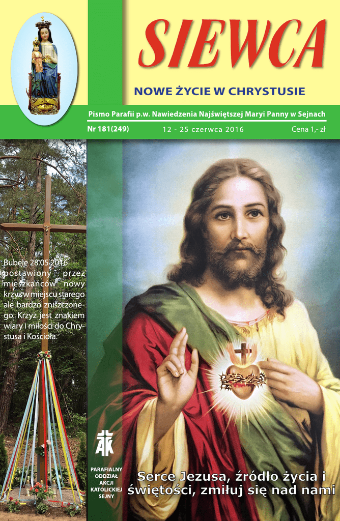 NOWE KO Ś C IŻYCIE Ó Ł NW A SCHRYSTUSIE Z YM D O M E M Pismo Parafii p.w. Nawiedzenia Najświętszej Maryi Panny w Sejnach Nr 92 (160) 16 – 29 września 2012 r. Cena 1,- zł WIERZĘ ... Przyjdźcie do Mnie wszyscy… „Przyjdźcie do Mnie wszyscy, którzy utrudzeni i obciążeni jesteście, a Ja was pokrzepię” (Mt 1,28). Niech przyjdzie sprawiedliwy, aby stał się jeszcze sprawiedliwszy; aby stał się gorący; grzesznik, aby się oczyścił i uświęcił. Ach, ułomności ludzka! Czyż jest człowiek, który by nie zgrzeszył? (…) Synu mój, , jeżeli czujesz się obciążony grzechami lub uchybieniami, pośpiesz do Serca mojego. Znajdziesz w nim wolność i ulgę. Niech cię nie odstrasza wielkość twoich grzechów ani wielkość mojego Majestatu, wszak nie przyszedłem wzywać do pokuty sprawiedliwych, ale grzeszników. Im większym nędzom podlegasz, tym bardziej lituję się nad tobą. Im bardziej jesteś chory, tym bardziej potrzebujesz lekarza. Nie dziwię się twoim błędom, znam bowiem twoją ułomność i serce twoje. Jeśli nie popadłeś w większe grzechy, zawdzięczasz to głównie mojej łasce. Dziwię się natomiast, że kiedy śpieszę cię uzdrowić, ty nie chcesz uzdrowienia, a jeśli już chcesz, zdajesz się wątpić w dobroć moją. Ach synu nie czyń Sercu mojemu tak bolesnej krzywdy. Albowiem Serce moje lubi przebaczać i wcale tym się nie męczy. Patrz, z taką dobrocią przyjmuję grzeszników, że nazwano mnie ich przyjacielem. Jam jest Ojciec dobry, który dzieci zrodzone na krzyżu obejmuje miłością Serca dla nich otwartego, aby o każdej porze miały nie byle jakie schronienie, lecz sam środek moich uczuć. Kiedy one śpią, Serce moje czuwa na straży. (…) Tak wielka jest miłość ku nim, jaką płonie Serce moje, że miłuję i pielęgnuję każdego, jakby on jeden był na świecie. Jeśli odstąpi ode mnie uwięziony przez przez nieprzyjaciela, Serce moje boleje nad tym jak nad śmiercią jedynego syna. Miłością ścigam uciekającego, zapraszam do siebie, nakłaniam obietnicami. A jeśli nie chce posłuchać, mam cierpliwość, stanę pod drzwiami jego serca i często pukam. Jeśli wreszcie postanowi wrócić do mnie, wybiegam mu naprzeciw, przyciskam do piersi, przy czym Serce moje raduje się, że syna, którego opłakiwano jako umarłego, widzi przy sobie żywego i całego. Z radości zwołuję całe niebo, aby razem ze mną się radowało i weseliło. Pierre Jean Aernoudt SJ „Naśladowanie Najświętszego Serca Jezusowego”, przeł. O. Pius Antoni Tubański OFM, wybrał Eugeniusz Miłosierne serce ... Modlitwy są pierwszym krokiem na drodze do owocnego wejścia w przestrzeń słowa Bożego i na drodze do wejścia w fascynującą, pełną inspiracji przygodę ze świętymi. 13 czerwca – św. Antoni z Padwy, pomóż mi znaleźć drogę do Niepokalanego Serca Matki Bożej. Wprowadź mnie na właściwą ścieżkę i daj w Jej Sercu odnaleźć ciepło, troskę i miłość, których tak często mi brakuje (Łk 2, 41-51). 15 czerwca – bł. Jolanto, wyproś mi łaskę godzenia się na to, co ode mnie nie zależy. Spraw, abym nie dochodził swych praw, lecz pokornie zdał się na Bożą sprawiedliwość. Daj mi ducha pokory i wytrwałej modlitwy pośród doświadczeń (Mt 5,38-42). 17 czerwca – św. Bracie Albercie, wyproś mi łaskę pełnienia dobrych uczynków, zaprowadź mnie do tych ludzi, którzy potrzebują mojej pomocy. Ucz mnie, że najbardziej miłym Bogu jest ten uczynek, który jest dokonywany w ukryciu i bez rozgłosu (Mt 6,1-6,16-18). 20 czerwca – bł. Benigno, wyproś mi i moim bliskim łaskę ufności w Bożą Opatrzność, daj mi zawsze bardziej być niż mieć. Chcę być z ludźmi, a nie otaczać się przedmiotami (Mt 6,24-34). (W Sejneńskiej bazylice znajdują się relikwie bł. Benigny) SIEWCA MOC SŁOWA Ewangelia w nauce św. Jana Pawła II Niedziela XI Zwykła – 12 czerwca 2016 J eden z faryzeuszów zaprosił Go do siebie na posiłek. Wszedł Łk 7, 36 – 8, 3 więc do domu faryzeusza i zajął miejsce za stołem. A oto kobieta, która prowadziła w mieście życie grzeszne, dowiedziawszy się, że jest gościem w domu faryzeusza, przyniosła flakonik alabastrowy olejku, i stanąwszy z tyłu u nóg Jego, płacząc, zaczęła łzami oblewać Jego nogi i włosami swej głowy je wycierać. Potem całowała Jego stopy i namaszczała je olejkiem. Widząc to faryzeusz, który Go zaprosił, mówił sam do siebie: «Gdyby On był prorokiem, wiedziałby, co za jedna i jaka jest ta kobieta, która się Go dotyka, że jest grzesznicą». Na to Jezus rzekł do niego: «Szymonie, mam ci coś powiedzieć». On rzekł: «Powiedz, Nauczycielu». «Pewien wierzyciel miał dwóch dłużników. Jeden winien mu był pięćset denarów, a drugi pięćdziesiąt. Gdy nie mieli z czego oddać, darował obydwom. Który więc z nich będzie go bardziej miłował?» Szymon odpowiedział: «Sądzę, że ten, któremu więcej darował». On mu rzekł: «Słusznie osądziłeś». Potem zwrócił się do kobiety i rzekł Szymonowi: «Widzisz tę kobietę? Wszedłem do twego domu, a nie podałeś Mi wody do nóg; ona zaś łzami oblała Mi stopy i swymi włosami je otarła. Nie dałeś Mi pocałunku; a ona, odkąd wszedłem, nie przestaje całować nóg moich. Głowy nie namaściłeś Mi oliwą; ona zaś olejkiem namaściła moje nogi. Dlatego powiadam ci: Odpuszczone są jej liczne grzechy, ponieważ bardzo umiłowała. A ten, komu mało się odpuszcza, mało miłuje». Do niej zaś rzekł: «Twoje grzechy są odpuszczone». Na to współbiesiadnicy zaczęli mówić sami do siebie: «Któż On jest, że nawet grzechy odpuszcza?» On zaś rzekł do kobiety: «Twoja wiara cię ocaliła, idź w pokoju». Refleksja niedzielna: en, który był „we wszystkim do nas podobny oprócz grzechu”, okazał swą bliskość grzesznikom po to, by oddalić od nich grzech. Ten kto miłuje , pragnie dzielić T Nr 181/2016 wszystko z tym, kogo