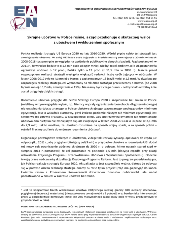 POLSKI KOMITET EUROPEJSKIEJ SIECI PRZECIW UBÓSTWU (EAPN POLSKA) ul. Nowy Świat 49 00-042 Warszawa Tel. (022) 826 52 46, fax (022) 551 54 55 www.eapn.org.pl e-mail: [email protected] TT @EAPNPoland Skrajne ubóstwo w Polsce rośnie, a rząd przekonuje o skutecznej walce z ubóstwem i wykluczeniem społecznym Polska realizuje Strategię UE Europa 2020 na lata 2010-2020. Wśród pięciu celów tej strategii jest zmniejszenie ubóstwa. W całej UE liczba osób żyjących w biedzie ma się zmniejszyć o 20 mln w latach 2008-2018 (przesunięcie ze względu na opóźnienie publikacyjne danych z badań). Rząd postanowił w 2011 r., że w Polsce będzie to o 1,5 mln osób ubogich mniej. Nie był to cel ambitny, o ile UE postanowiła ograniczyć ubóstwo o 17 proc., Polska tylko o 13 proc. (z 11,5 mln w 2008 r.). Jeszcze przed rozpoczęciem realizacji strategii wystąpiła większość redukcji liczby osób żyjących w ubóstwie. W latach 2008-2010 było to już mniej o 9 proc. z zaplanowanych 13 (czyli mniej o 1,3 mln). W dwa lata po rozpoczęciu realizacji strategii, cel wyznaczony na rok 2018 został już przekroczony o 200 tys. (od 2008 łącznie mniej o 1,7 mln, zmniejszenie o 15%). Nie mamy być z czego dumni - cel był mało ambitny i nie został osiągnięty dzięki strategii. Rozumienie ubóstwa przyjęte dla celów Strategii Europa 2020 i skopiowane bez zmian w Polsce (mieliśmy w tym względzie wybór, np. Niemcy wybrały ograniczenie bezrobocia długoterminowego) nie uwzględnia dobrze znanego w Polsce ubóstwa skrajnego szacowanego według granicy minimum egzystencji. Jest to wskaźnik alarmowy, gdyż życie na poziomie niższym niż minimum egzystencji jest szkodliwe dla zdrowia i rozwoju, w szczególności dzieci. Gdy spojrzymy na dynamikę tak rozumianego ubóstwa ono nie tylko nie zmniejszyło się, ale zwiększyło w latach 2008-2013 aż o 34 proc. (z 2,1 mln do 2,9 mln). Jak to możliwe, że ubóstwo rozumiane na sposób unijny spada, a na sposób polski – rośnie? Tracimy zaufanie do unijnego rozumienia ubóstwa1. Organizacje pozarządowe walczące z ubóstwem, widząc taki rozwój sytuacji, apelowały do rządu już od początku 2013 r., aby przyjął ambitniejszy cel (3 mln) w przypadku ubóstwa w rozumieniu UE i dodał też nowy cel: ograniczenie ubóstwa skrajnego do 2020 r. o połowę. Mimo naszych starań rząd w sierpniu 2014 r. postanowił, że cel pozostanie na poziomie 1,5 mln (decyzja zapadła przy okazji uchwalenia Krajowego Programu Przeciwdziałania Ubóstwu i Wykluczeniu Społecznemu). Obecnie trwają prace nad czwartą aktualizacją Krajowego Programu Reform. Jest to program przedstawiający, jak Polska realizuje strategię Europa 2020. Aktualizacja ta jest szczególnie ważna, dlatego że odbywa się w połowie okresu realizacji strategii. Znamy na razie tylko projekt (rząd ma go przyjąć do końca kwietnia razem z Programem Konwergencji dotyczącym finansów publicznych), ale nadal pozostawiono w nim cel w zakresie ubóstwa bez zmian. Jest to konglomerat trzech wskaźników: ubóstwa relatywnego według granicy 60% mediany dochodów, pogłębionej deprywacji materialnej (niezaspokojone co najmniej 4 z 9 potrzeb) oraz bardzo niska intensywność pracy w gospodarstwie domowym (mniej niż 20% maksymalnego czasu pracy osób w wieku produkcyjnym w gospodarstwie w roku). 1 POLSKI KOMITET EUROPEJSKIEJ SIECI PRZECIW UBÓSTWU (EAPN POLSKA) EAPN jest największą europejską siecią krajowych, regionalnych i lokalnych organizacji działających na rzecz walki z ubóstwem. W Polsce obecny od 2007 roku, zrzesza 29 organizacji. EAPN Polska działa przy Wspólnocie Roboczej Związków Organizacji Socjalnych WRZOS. Celem Komitetu jest m.in. monitorowanie i recenzowanie aktywności państwa w sferze walki z ubóstwem i wykluczeniem społecznym oraz współkształtowanie polityki społecznej w tym zakresie, na poziomie ogólnopolskim oraz europejskim. POLSKI KOMITET EUROPEJSKIEJ SIECI PRZECIW UBÓSTWU (EAPN POLSKA) ul. Nowy Świat 49 00-042 Warszawa Tel. (022) 826 52 46, fax (022) 551 54 55 www.eapn.org.pl e-mail: [email protected] TT @EAPNPoland MPiPS w swoich przekazach medialnych podkreśla, że mamy wielkie osiągnięcia w zakresie ograniczania ubóstwa. Czy rzeczywiście tak jest? EAPN Polska ma co do tego duże wątpliwości. Trendy skali ubóstwa w Polsce według wskaźnika UE (zagrożenie ubóstwem lub wykluczenie) i polskiego (ubóstwo skrajne) w ujęciu bezwzględnym (w tys.) i względnym (w proc.) na tle polskiego celu strategii Europa 2020 i postualtów jego zmiany 14000 35 30,5 12000 27,8 27,8 27,2 30 26,7 25,8 9 991 25 8 491 8000 6000 11 491 20 15 10 454 10 409 10 196 10 128 6,6 6,8 4000 5,7 5,6 5,8 Skala w proc. Skala w tys. 10000 9 748 10 7,4 2000 5 2 174 2 134 2 214 2 543 2 621 2 851 1 067 0 0 2008 2009 2010 2011 2012 2013 Zagrożenie ubóstwem lub wykluczenie w tys. Ubóstwo skrajne w tys. Oficjalny cel polski na 2018 Cel postulowany przez PK EAPN (główny) Cel postulowany przez PK EAPN (pomocniczy) Zagrożenie ubóstwem lub wykluczenie w % Ubóstwo skrajne w % Opracowanie: PK EAPN Wyjaśnienie docelowych wartości wskaźników na wykresie: Cel przyjęty przez rząd i nadal podtrzymywany: 11 491 tys. – 1 500 tys. = 9 991 tys. Propozycja modyfikacji celu zgłoszona przez PK EAPN: 11 491 tys. – 3 000 tys. = 8 491 tys. Propozycja celu dodatkowego, ograniczenie ubóstwa skrajnego o połowę: 2 134 tys. * 0,5 = 1 067 tys. POLSKI KOMITET EUROPEJSKIEJ SIECI PRZECIW UBÓSTWU (EAPN POLSKA) EAPN jest największą europejską siecią krajowych, regionalnych i lokalnych organizacji działających na rzecz walki z ubóstwem. W Polsce obecny od 2007 roku, zrzesza 29 organizacji. EAPN Polska działa przy Wspólnocie Roboczej Związków Organizacji Socjalnych WRZOS. Celem Komitetu jest m.in. monitorowanie i recenzowanie aktywności państwa w sferze walki z ubóstwem i wykluczeniem społecznym oraz współkształtowanie polityki społecznej w tym zakresie, na po