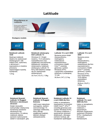 Latitiude Dostępne modele Notebook Latitude 3330 Niedrogi notebook idealny do zastosowań edukacyjnych i dla małych firm, wykonany z aluminium i wyposażony w świetne procesory zapewniające wysoką wydajność. 1,8 kg Notebook Nowość Latitude 12 Rugged Extreme z obrotowym ekranem Dzięki niezwykle wytrzymałej i elastycznej konstrukcji zawiasów obrotowych ten wzmocniony 12-calowy notebook ułatwia sprawne wykonywanie zadań w sytuacjach, gdy Notebook edukacyjny Dell Latitude 13 Windows 8.1 Dzięki dużemu, 13,3-calowemu wyświetlaczowi oraz wyjątkowej uszczelnionej klawiaturze i panelowi dotykowemu notebook edukacyjny Latitude 13 firmy Dell idealnie nadaje się do zastosowań edukacyjnych. 33.7cm (13.3") | 1.9kg Notebook Nowość Latitude 14 Rugged Extreme Jeśli masz najwyższe wymagania, wybierz wzmocnionego 14calowego notebooka, który oferuje wyjątkową trwałość, łatwość obsługi i zabezpieczenia. Latitude 14 z serii 3000 Sprawna praca dzięki niezawodnemu, niedrogiemu notebookowi wyposażonemu w procesory Intel® Core™ czwartej generacji, system Windows 8 Pro i opcjonalny wyświetlacz dotykowy o przekątnej 14 cali. 35,5cm (14") | 2,1kg Notebook Latitude 14 z serii 5000 dla firm Łatwy w zarządzaniu, wyposażony w procesor Intel® Core™ vPro™ czwartej generacji oraz system Windows 8 Pro, 14-calowy notebook z opcjonalnym ekranem dotykowym, oferujący zarówno funkcje, jak iwydajność spełniające Latitude 15 z serii 3000 Sprawna praca dzięki niezawodnemu, niedrogiemu notebookowi dla firm wyposażonemu w procesory Intel® Core™ czwartej generacji, system Windows 8 Pro oraz opcjonalny 15,6-calowy wyświetlacz dotykowy. 39,6cm (15,6") | 2,3kg Notebook Latitude 15 z serii 5000 dla firm Łatwy w zarządzaniu 15,6-calowy notebook z opcjonalnym ekranem dotykowym, systemem Windows 8 Pro i niezbędnymi funkcjami biznesowymi. inni ludzie polegają na Tobie najbardziej. 29,4cm (11,6") | 2,72kg 35,5cm (14") | 3,86kg potrzeby Twojej firmy. 35,5cm (14") | 2kg 39,6cm (15,6") | 2,3kg Cena katalogowa 5115,00 PLN BEZ podatku VAT i kosztów transportu Notebook Latitude E6430 ATG Wyposażony w zaawansowane opcje łączności, solidny 14calowy notebook zgodny z normami wytrzymałościowymi MIL-STD-810G/IP5X. 35,5cm (14") | 2,5kg Notebook biznesowy Latitude E6440 Najbezpieczniejszy 14calowy notebook jest również niezwykle wydajny. Trwały notebook Latitude E6440 zapewnia wysoką wydajność, ochronę i łatwe zarządzanie. 35.5cm (14") | 2.12kg Cena katalogowa 6364,00 PLN BEZ podatku VAT i kosztów transportu Notebook biznesowy Latitude E6540 Ten najbardziej bezpieczny notebook jest również najbardziej wydajnym modelem Latitude. Wytrzymały notebook Latitude™ E6540 zapewnia wysoką wydajność, ochronę i łatwe zarządzanie. 39.6cm (15.6") | 2.36kg Cena katalogowa 6255,00 PLN BEZ podatku VAT i kosztów transportu Latitude 12 z serii 7000 Wydajny Ultrabook™ Latitude w atrakcyjnej obudowie z procesorem Intel® Core™ vPro™ czwartej generacji, systemem Windows 8 Pro i opcjonalnym 12calowym wyświetlaczem dotykowym. 31,8cm (12,5") | 1,36kg Cena katalogowa 8375,00 PLN BEZ podatku VAT i kosztów transportu Latitude 14 z serii 7000 Wydajność serii Latitude w pięknym i smukłym Ultrabooku™ z procesorami Intel® Core™ vPro™ czwartej generacji, systemem Windows 8 Pro i Notebook Latitude XT3 Wszystko pod ręką: wygodny tablet z ekranem dotykowym, wydajny notebook klasy korporacyjnej i duży wyświetlacz. Niezależnie od tego, czy pracujesz przy biurku, czy też jesteś w podróży, komputer Latitude XT3 sprawdza się w każdych warunkach. opcjonalnym 14-calowym ekranem dotykowym. 35,5cm (14") | 1,63kg Cena katalogowa 9131,00 PLN BEZ podatku VAT i kosztów transportu