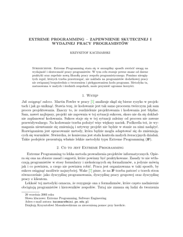 EXTREME PROGRAMMING – ZAPEWNIENIE SKUTECZNEJ I WYDAJNEJ PRACY PROGRAMISTÓW KRZYSZTOF KACZMARSKI Streszczenie. Extreme Programming stara się w szczególny sposób zwrócić uwagę na wydajność i skuteczność pracy programistów. W tym celu stosuje pewne znane od dawne praktyki oraz zupełnie nową filozofię pracy zespołu programistycznego. Pomimo nieugiętych reguł, których trzeba przestrzegać, nie nakłada na programistów dodatkowej pracy nie związanej bezpośrednio z tworzeniem i pielęgnowaniem kodu programu. Metodyka ta, zastosowana w małych i średnich zespołach, może przynieść ogromne korzyści. 1. Wstęp Jak osiągnąć sukces. Martin Fowler w pracy [5] analizuje skąd się bierze ryzyko w projektach i jak go uniknąć. Stawia tezę, że kodowanie jest tak samo procesem twórczym jak sam proces projektowania. Znaczy to, że rozdzielenie projektowania i kodowania jest błędne. Sam, nawet najlepszy, projekt nie zapewnia w tej sytuacji sukcesu, skoro nie da się dokładnie zaplanować kodowania. Sukces staje się w tej sytuacji zależny od procesu nie zawsze przewidywalnego. Na kodowanie trzeba położyć więc większy nacisk. Podkreśla też, że wymagania nieustannie się zmieniają i sztywny projekt nie będzie w stanie za nimi nadążyć. Rozwiązaniem jest opracowanie metody, która będzie mogła adaptować się do zmieniających się warunków. Stwierdza, że konieczna jest stała kontrola małych iteracyjnych działań. Takie podejście prezentują właśnie lekkie metodyki typu Extreme Programming (XP). 2. Co to jest Extreme Programming Extreme Programming to lekka metoda prowadzenia projektów informatycznych. Opiera się ona na zbiorze zasad i sugestii, które powinny być praktykowane. Zasady te nie wtłaczają programistów w stosy formularzy i niekończących się formalizmów, a jedynie mówią jak i co powinien, a czego nie powinien robić. Praca jest organizowana w taki sposób, by sukces osiągnąć możliwie najszybciej. Wake [7] pisze, że na XP trzeba patrzeć z trzech stron równocześnie: jako dyscyplinę programowania, dyscyplinę pracy grupowej oraz dyscyplinę pracy z klientem. Lekkość tej metodyki oznacza, że rezygnuje ona z formalizmów, które często nadmiernie obciążają programistów i kierowników zespołów. Tutaj nie zmusza się ludzi do tworzenia 20 września 2003 roku Słowa kluczowe: Extreme Programming, Software Engineering Adres e-mail autora: [email protected] Dziękuję Krzysztofowi Mossakowskiemu za nieocenioną pomoc przy korekcie. 2 KRZYSZTOF KACZMARSKI ton dokumentów, których nikt nigdy nie przeczyta. Podstawową filozofią jest robienie tylko tego, co jest w danej chwili potrzebne. Jednak lekkość ta jednocześnie niekoniecznie oznacza, że XP łatwo jest używać w praktyce. Jak wykazują nawet nieformalne analizy działań firm, mało która jest w stanie sprostać wszystkim wymaganiom stawianym przez tą metodykę [9]. Jednak utrzymanie dyscypliny pracy procentuje w tym, że osiąga się zadowolenie klienta oraz dużą satysfakcję z wykonanego zadania. Początkowo może wydać się dziwne, że pomimo wyeliminowania formalizmów obecnych w innych metodykach można osiągnąć wysoką jakość. Przecież te formalizmy powstawały przez lata właśnie po to, by ustalić standard jakości. Zgodzi się ze mną jednak większość programistów, że standardy wprowadzane w ciężkich metodykach oznaczają wiele dodatkowej pracy, której sens i wartość jest problematyczna. XP jest zaprojektowane w taki sposób, by wszystkie zasady uzupełniały się wzajemnie. Dzięki temu pomimo braku ściśle ustalonych formuł doprowadza do celu nie tylko w zamierzonym czasie, ale i z produktem najwyższej jakości. Tom DeMarco [4] twierdzi, że Extreme Programming to ruch, który przez akcentowanie talentu, pracy zespołowej, lekkiego procesu i dyscypliny bez dogmatów przyniesie odświeżenie i nową energię do zespołów programistycznych. Opracowane ostatnio ciężkie metodologie typu CMM określa jako bezrozumne. Historia XP. W ’90 latach Chrysler próbował stworzyć system płacowy dla całej firmy. Projekt na skutek błędnego zarządzania i kłopotów technicznych popadł w poważne tarapaty. W roku ’96 szefowie przekazują projekt Kentowi Beckowi, który szybko stwierdza, że to co powstało jest do niczego i radzi rozpocząć od nowa. Chce założyć nowy zespół i organizować pracę w zupełnie inny sposób. Istnieją już wtedy podstawy teoretyczne XP opracowane przy pomocy Warda Cunninghama. Powstaje zespół C3, który staje się polem doświadczalnym dla XP. System zostaje ukończony, jednak po pewnym czasie projekt popada w finansowe tarapaty i zostaje anulowany w ’99 roku. Obecnie teoria związana z metodologią XP dynamicznie się rozwija i jest szeroko testowana na całym świecie. Przez swoje dość rewolucyjne podejście zyskała sobie tyle samo zwolenników, co przeciwników. Trudno powiedzieć jak będzie wyglądała przyszłość XP. Dziś jasne jest jedynie, że odejście od ciężkich metodyk wydaje się (w większości przypadków) nieuniknione. Nazwa. Istotę tej metody najlepiej oddaje jej nazwa. Programowanie jest, wraz z powstałym w jego wyniku kodem, najważniejszą czynnością podczas tworzenia oprogramowania. Kod jest zawsze jednoznacznym i formalnym sposobem opisu systemu. Jeśli kod nie działa jak należy system nie będzie mógł być zaakceptowany. XP dąży więc do poprawy jakości kodu. Sposobem na osiągnięcie tego celu jest ekstremalne potraktowanie pewnych znanych od dawna zasad (o których wiadomo, że są dobre, sprawdzone i skuteczne): weryfikacji kodu, testowania, iteracyjnego tworzenia małych wydań i prostoty. Praktyki te są stosowane w sposób ciągły (programowanie w parach, ciągłe testowanie, nieustanne przeprojektowywanie). Nacisk na te zasady jest tak silny, że są one posunięte niemal ’do granicy wytrzymałości’. Takie właśnie podejście ma z