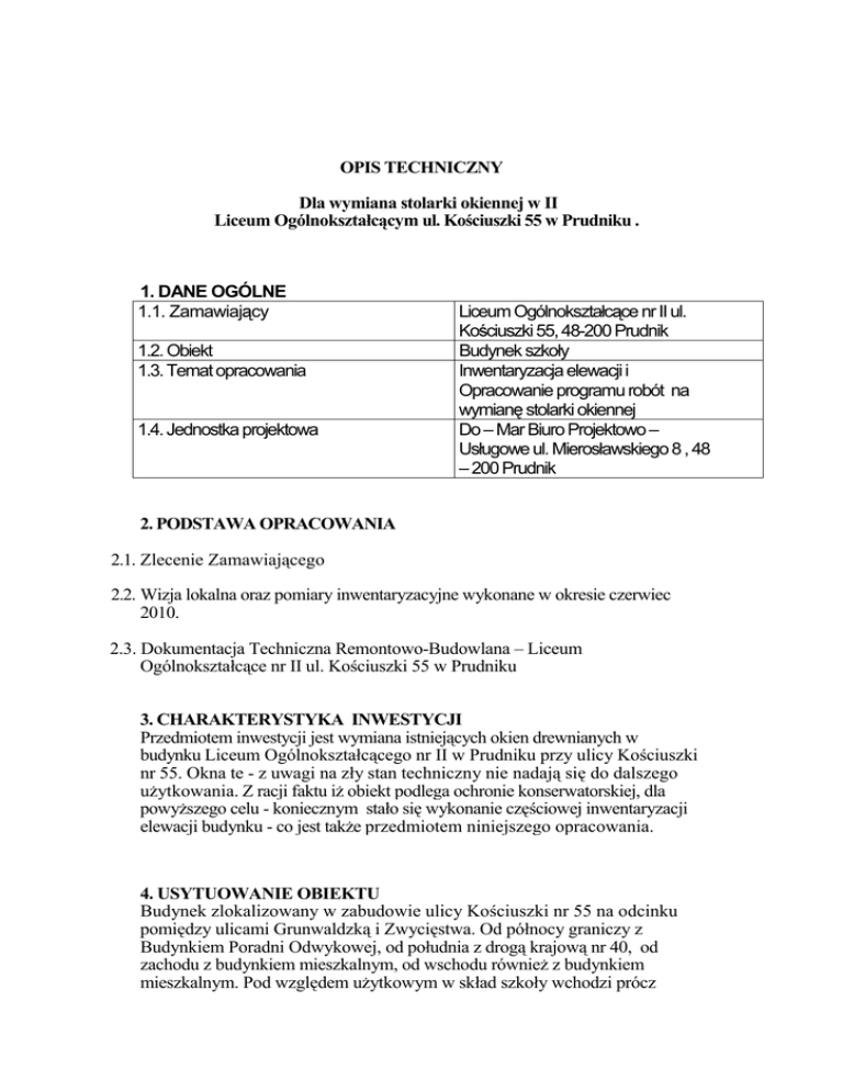 OPIS TECHNICZNY Dla wymiana stolarki okiennej w II Liceum Ogólnokształcącym ul. Kościuszki 55 w Prudniku . 1. DANE OGÓLNE 1.1. Zamawiający 1.2. Obiekt 1.3. Temat opracowania 1.4. Jednostka projektowa Liceum Ogólnokształcące nr II ul. Kościuszki 55, 48-200 Prudnik Budynek szkoły Inwentaryzacja elewacji i Opracowanie programu robót na wymianę stolarki okiennej Do – Mar Biuro Projektowo – Usługowe ul. Mierosławskiego 8 , 48 – 200 Prudnik 2. PODSTAWA OPRACOWANIA 2.1. Zlecenie Zamawiającego 2.2. Wizja lokalna oraz pomiary inwentaryzacyjne wykonane w okresie czerwiec 2010. 2.3. Dokumentacja Techniczna Remontowo-Budowlana – Liceum Ogólnokształcące nr II ul. Kościuszki 55 w Prudniku 3. CHARAKTERYSTYKA INWESTYCJI Przedmiotem inwestycji jest wymiana istniejących okien drewnianych w budynku Liceum Ogólnokształcącego nr II w Prudniku przy ulicy Kościuszki nr 55. Okna te - z uwagi na zły stan techniczny nie nadają się do dalszego użytkowania. Z racji faktu iż obiekt podlega ochronie konserwatorskiej, dla powyższego celu - koniecznym stało się wykonanie częściowej inwentaryzacji elewacji budynku - co jest także przedmiotem niniejszego opracowania. 4. USYTUOWANIE OBIEKTU Budynek zlokalizowany w zabudowie ulicy Kościuszki nr 55 na odcinku pomiędzy ulicami Grunwaldzką i Zwycięstwa. Od północy graniczy z Budynkiem Poradni Odwykowej, od południa z drogą krajową nr 40, od zachodu z budynkiem mieszkalnym, od wschodu również z budynkiem mieszkalnym. Pod względem użytkowym w skład szkoły wchodzi prócz budynku zasadniczego budynek internatu. 5. CHARAKTERYSTYKA STANU ISTNIEJĄCEGO OBIEKTU 5.1. Przekaz historyczny. Budynek zasadniczy przedwojenny w kształcie prostokąta ze skrzydłami, lewe skrzydło wchodzące w skład szkoły, prawe skrzydło jako budynek internatu. Budynek czterokondygnacyjny podpiwniczony kryty dachem wielospadowym o kalenicy równoległej do ulicy. Mury kondygnacji nadziemnych z cegły klinkierowej, cokół (i prawdopodobnie mury piwniczne) z kamienia polnego. Więźba dachowa drewniana, kryta dachówką. Okna drewniane, skrzynkowe o skrzydłach otwieranych do wnętrza. Do budynku zasadniczego w pierwszej połowie XX wieku dobudowano na całej jego głębokości segment łączący budynek szkoły z internatem murowany o elewacji z cegły pełnej otynkowany. Z dachem płaskim krytym papą. 6. PROGRAM WYMIANY STOLARKI OKIENNEJ. Program obejmuje wymianę stolarki okiennej w budynku zasadniczym 6.1. Stan istniejący 6.1.1. Elewacja wschodnia a) budynek zasadniczy - wszystkie okna drewniane skrzynkowe - do wymiany – na okna z PCV. - wg decyzji Urzędu Konserw. Zabytków. 6.1.2. Elewacja zachodnia a) budynek zasadniczy - wszystkie okna drewniane skrzynkowe - do wymiany – na okna z PCV. 6.1.3. Elewacja płn. (szczytowa) - z jedenastu okien drewnianych skrzynkowych , wszystkie do wymiany.. Z uwagi na różnorodność istniejącej stolarki okiennej (14 typów) w odniesieniu do okien drewnianych - wykonano rysunki zestawcze dla poszczególnych elewacji wraz z tabelą zbiorczą, co jest niezbędne dla podjęcia decyzji o wyborze rodzaju i typu okien w odniesieniu do aktualnego stanu budynku. a) b) c) f) 6.2. Roboty budowlane program przewiduje wykonanie nast. Robót budowlanych zgodnie z układem klasyfikacyjnym CPV-45420000-7 „Roboty w zakresie zakładania stolarki budowlanej" wykucie istniejących okien wraz z demontażem istniejących podokienników przygotowanie otworów do osadzenia stolarki (oczyszczenie, uzupełnienie ubytków itp.) osadzenie gotowej stolarki wraz z uszczelnieniem i ewentualnym olistwowaniem, d) dopasowanie i wyregulowanie e) obróbka blacharska podokienników naprawa ewentualnych uszkodzeń powstałych w wyniku prac montażowych wykończenie ościeży i węgarków. g) Montaż podokienników blaszanych od zewnątrz. h) Montaż podokienników PCV wewnętrznych. Podstawę do wykonania przedmiotowych robót stanowi decyzja Opolskiego Woj. Konserwatora Zabytków w Opolu w sprawie wyboru typu i rodzaju stolarki okiennej. • 6.3. Zakres dokumentacyjny programu wymiany okien. Dokumentacja programu wymiany będzie obejmować następujące elementy: Decyzja Opolskiego Woj. Konserwatora Zabytków w Opolu w sprawie określenia typu i rodzaju okien. • Specyfikacja techniczna wykonania i odbiory robót budowlanych. • Dokumentacja zestawieniowa • Przedmiar robót • Kosztorys