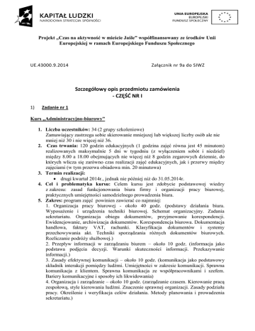 Projekt „Czas na aktywność w mieście Jaśle” współfinansowany ze środków Unii Europejskiej w ramach Europejskiego Funduszu Społecznego UE.43000.9.2014 Załącznik nr 9a do SIWZ Szczegółowy opis przedmiotu zamówienia - CZĘŚĆ NR I 1) Zadanie nr 1 Kurs „Administracyjno-biurowy” 1. Liczba uczestników: 34 (2 grupy szkoleniowe) Zamawiający zastrzega sobie skierowanie mniejszej lub większej liczby osób ale nie mniej niż 30 i nie więcej niż 36. 2. Czas trwania: 120 godzin edukacyjnych (1 godzina zajęć równa jest 45 minutom) realizowanych maksymalnie 5 dni w tygodniu (z wyłączeniem sobót i niedziel) między 8.00 a 18.00 obejmujących nie więcej niż 8 godzin zegarowych dziennie, do których wlicza się zarówno czas realizacji zajęć edukacyjnych, jak i przerwy między zajęciami (w tym przerwa obiadowa min. 20 minutowa) 3. Termin realizacji: drugi kwartał 2014r., jednak nie później niż do 31.05.2014r. 4. Cel i problematyka kursu: Celem kursu jest zdobycie podstawowej wiedzy z zakresu: zasad funkcjonowania biura firmy i organizacji pracy biurowej, praktycznych umiejętności samodzielnego prowadzenia biura. 5. Zakres: program zajęć powinien zawierać co najmniej: 1. Organizacja pracy biurowej - około 40 godz. (podstawy działania biura. Wyposażenie i urządzenia techniki biurowej. Schemat organizacyjny. Zadania sekretariatu. Organizacja obiegu dokumentów, przyjmowanie korespondencji. Ewidencjowanie, archiwizacja dokumentów. Korespondencja biurowa. Dokumentacja handlowa, faktury VAT, rachunki. Klasyfikacja dokumentów i systemy przechowywania akt. Techniki sporządzania różnych dokumentów biurowych. Rozliczanie podróży służbowej.) 2. Przepływ informacji w zarządzaniu biurem – około 10 godz. (informacja jako podstawa podjęcia decyzji. Warunki skuteczności informacji. Przekazywanie informacji.) 3. Zasady efektywnej komunikacji – około 10 godz. (komunikacja jako podstawowy składnik interakcji pomiędzy ludźmi. Umiejętności w zakresie komunikacji. Sprawna komunikacja z klientem. Sprawna komunikacja ze współpracownikami i szefem. Bariery komunikacyjne i sposoby ich likwidowania) 4. Organizacja i zarządzanie – około 10 godz. (zarządzanie czasem. Kierowanie pracą zespołową, style kierowania ludźmi. Znaczenie sprawnej organizacji. Zasady podziału pracy. Określenie i weryfikacja celów działania. Metody planowania i prowadzenia sekretariatu.) Projekt „Czas na aktywność w mieście Jaśle” współfinansowany ze środków Unii Europejskiej w ramach Europejskiego Funduszu Społecznego 5. Kultura zawodu – około 5 godz. (savoir – vivre w usługach firmy. Rozmowy telefoniczne w biurze. Przyjmowanie interesantów.) 6. Zagadnienia prawne – około 5 godz. (prawo pracy: podstawowe zasady prawa pracy, wynagrodzenie za pracę i inne świadczenia, czas pracy, obowiązki pracownika, obowiązki pracodawcy, umowy cywilnoprawne.) 7. Obsługa komputera – około 40 godz. (podstawy obsługi komputera, przetwarzanie tekstów – MS Word, arkusze kalkulacyjne, bazy danych na przykładzie MS Access, internet.) Zadanie nr 2 Kurs „Administracyjny z obsługą komputera i małą księgowością” 1. Liczba uczestników: 13 (2 grupy) Zamawiający zastrzega sobie skierowanie mniejszej lub większej liczby osób ale nie mniej niż 11 i nie więcej niż 15 2. Czas trwania: 180 godzin edukacyjnych, w tym 40 godzin zajęć z zakresu małej księgowości (1 godzina zajęć równa jest 45 minutom) realizowanych maksymalnie 5 dni w tygodniu (z wyłączeniem sobót i niedziel) między 8.00 a 18.00 obejmujących nie więcej niż 8 godzin zegarowych dziennie, do których wlicza się zarówno czas realizacji zajęć edukacyjnych, jak i przerwy między zajęciami. 3. Termin realizacji: drugi kwartał 2014r., jednak nie później niż do 31.05.2014r.- 7 osób pierwszy kwartał 2015r. – 6 osób 4. Cel i problematyka kursu: Celem kursu jest zdobycie podstawowej wiedzy z zakresu: zasad funkcjonowania biura firmy i organizacji pracy biurowej, praktycznych umiejętności samodzielnego prowadzenia biura, oraz prowadzenia małej księgowości 5. Zakres: program zajęć dotyczący części „administracja z obsługą komputera” obejmujący 140 godz. edukacyjnych powinien zawierać: 1) Organizacja pracy biurowej- około 40 godz. (podstawy działania biura. Wyposażenie i urządzenia techniki biurowej. Schemat organizacyjny. Zadania sekretariatu. Organizacja obiegu dokumentów, przyjmowanie korespondencji. Ewidencjowanie, archiwizacja dokumentów. Korespondencja biurowa. Dokumentacja handlowa, faktury VAT, rachunki. Klasyfikacja dokumentów i systemy przechowywania akt. Techniki sporządzania różnych dokumentów biurowych. Rozliczanie podróży służbowej.) 2) Przepływ informacji w zarządzaniu biurem – około 10 godz. (Informacja jako podstawa podjęcia decyzji. Warunki skuteczności informacji. Przekazywanie informacji) 3) Zasady efektywnej komunikacji – około 15 godz. (komunikacja jako podstawowy składnik interakcji pomiędzy ludźmi. Umiejętności w zakresie komunikacji. Sprawna komunikacja z klientem. Sprawna komunikacja ze współpracownikami i szefem. Bariery komunikacyjne i sposoby ich likwidowania) Projekt „Czas na aktywność w mieście Jaśle” współfinansowany ze środków Unii Europejskiej w ramach Europejskiego Funduszu Społecznego 4) Organizacja i zarządzanie – około 10 godz. (zarządzanie czasem. Kierowanie pracą zespołową, style kierowania ludźmi. Znaczenie sprawnej organizacji. Zasady podziału pracy. Określenie i weryfikacja celów działania. Metody planowania i prowadzenia sekretariatu.) 5) Kultura zawodu – około 5 godz. (savoir – vivre w usługach firmy. Rozmowy telefoniczne w biurze. Przyjmowanie interesantów.) 6) Zagadnienia prawne – około 20 godz. (prawo pracy: podstawowe zasady prawa pracy, wynagrodzenie za pracę i inne świadczenia, czas pracy, obowiązki pracownika, obowiązki pracodawcy, umo