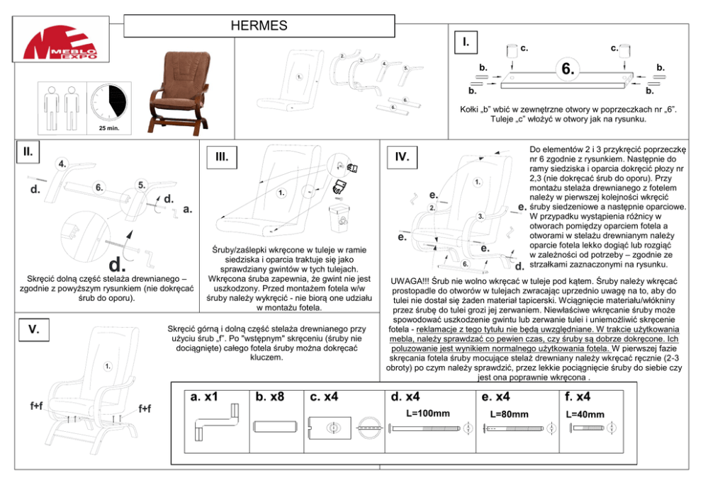 HERMES I. c. c. 2. 3. 4. 6. b. 5. 1. b. b. b. 6. Kołki „b” wbić w zewnętrzne otwory w poprzeczkach nr „6”. Tuleje „c” włożyć w otwory jak na rysunku. 6. 25 min. II. III. 4. d. 1. 5. 6. IV. d. e. 1. a. e. 2. 3. e. Skręcić dolną część stelaża drewnianego – zgodnie z powyższym rysunkiem (nie dokręcać śrub do oporu). Skręcić górną i dolną część stelaża drewnianego przy użyciu śrub „f”. Po "wstępnym" skręceniu (śruby nie dociągnięte) całego fotela śruby można dokręcać kluczem. V. 1. f+f Śruby/zaślepki wkręcone w tuleje w ramie siedziska i oparcia traktuje się jako sprawdziany gwintów w tych tulejach. Wkręcona śruba zapewnia, że gwint nie jest uszkodzony. Przed montażem fotela w/w śruby należy wykręcić - nie biorą one udziału w montażu fotela. f+f e. 6. d. Do elementów 2 i 3 przykręcić poprzeczkę nr 6 zgodnie z rysunkiem. Następnie do ramy siedziska i oparcia dokręcić płozy nr 2,3 (nie dokręcać śrub do oporu). Przy montażu stelaża drewnianego z fotelem należy w pierwszej kolejności wkręcić śruby siedzeniowe a następnie oparciowe. W przypadku wystąpienia różnicy w otworach pomiędzy oparciem fotela a otworami w stelażu drewnianym należy oparcie fotela lekko dogiąć lub rozgiąć w zależności od potrzeby – zgodnie ze strzałkami zaznaczonymi na rysunku. UWAGA!!! Śrub nie wolno wkręcać w tuleje pod kątem. Śruby należy wkręcać prostopadle do otworów w tulejach zwracając uprzednio uwagę na to, aby do tulei nie dostał się żaden materiał tapicerski. Wciągnięcie materiału/włókniny przez śrubę do tulei grozi jej zerwaniem. Niewłaściwe wkręcanie śruby może spowodować uszkodzenie gwintu lub zerwanie tulei i uniemożliwić skręcenie fotela - reklamacje z tego tytułu nie będą uwzględniane. W trakcie użytkowania mebla, należy sprawdzać co pewien czas, czy śruby są dobrze dokręcone. Ich poluzowanie jest wynikiem normalnego użytkowania fotela. W pierwszej fazie skręcania fotela śruby mocujące stelaż drewniany należy wkręcać ręcznie (2-3 obroty) po czym należy sprawdzić, przez lekkie pociągnięcie śruby do siebie czy jest ona poprawnie wkręcona . Niejednakowe ugięcia stelaży fotela można zniwelować w niewielkim stopniu w następujący sposób: - poluzować śruby łączące stelaż z siedziskiem i oparciem, - jedna osoba siada na fotelu i ustawia fotel w odpowiednim położeniu, - druga osoba dokręca w/w śruby. Gwarant dopuszcza trwałe odkształcenie stelaży foteli gięto - klejonych do 6% wartości nominalnej ze względu na sprężystość foteli. Siadając na fotelu, oparcie nie może być dostawione do ściany lub innego elementu stanowiącego opór dla odchylającego się do tyłu fotela. Nacisk na oparcie dostawione do ściany może spowodować wygięcie a nawet złamanie stelaża – reklamacje z tego tytułu nie będą uwzględniane. Obciążanie fotela tylko po jednej stronie może doprowadzić do niejednakowych ugięć stelaży gięto - klejonych. Prześwit pomiędzy oparciem fotela a ścianą powinien wynosić minimum 20cm. Fotel powinien być obciążony symetrycznie- tzn. siedzieć należy na środku siedziska. Maksymalne obciążenie fotela nie może przekroczyć 110kg.