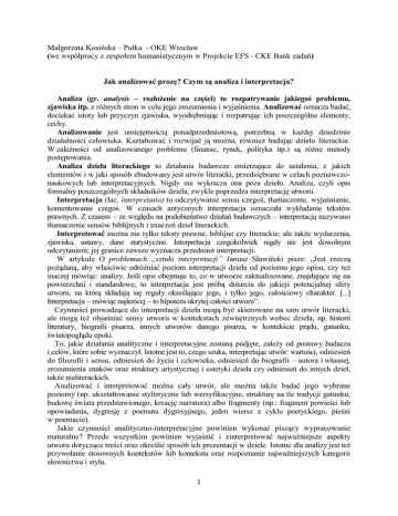 Małgorzata Kosińska – Pułka - OKE Wrocław (we współpracy z zespołem humanistycznym w Projekcie EFS - CKE Bank zadań) Jak analizować prozę? Czym są analiza i interpretacja? Analiza (gr. analysis – rozłożenie na części) to rozpatrywanie jakiegoś problemu, zjawiska itp. z różnych stron w celu jego zrozumienia i wyjaśnienia. Analizować oznacza badać, dociekać istoty lub przyczyn zjawiska, wyodrębniając i rozpatrując ich poszczególne elementy, cechy. Analizowanie jest umiejętnością ponadprzedmiotową, potrzebną w każdej dziedzinie działalności człowieka. Kształtować i rozwijać ją można, również badając dzieło literackie. W zależności od analizowanego problemu (finanse, rynek, polityka itp.) są różne metody postępowania. Analiza dzieła literackiego to działania badawcze zmierzające do ustalenia, z jakich elementów i w jaki sposób zbudowany jest utwór literacki, przedsiębrane w celach poznawczonaukowych lub interpretacyjnych. Nigdy nie wykracza ona poza dzieło. Analiza, czyli opis formalny poszczególnych składników dzieła, zwykle poprzedza interpretację utworu. Interpretacja (łac. interpretatio) to odczytywanie sensu czegoś, tłumaczenie, wyjaśnianie, komentowanie czegoś. W czasach antycznych interpretacja oznaczała wykładanie tekstów prawnych. Z czasem – ze względu na podobieństwo działań badawczych – interpretacją nazywano tłumaczenie sensów biblijnych i znaczeń dzieł literackich. Interpretować można nie tylko teksty prawne, biblijne czy literackie; ale także wydarzenia, zjawiska, ustawy, dane statystyczne. Interpretacja czegokolwiek nigdy nie jest dowolnym odczytaniem; jej granice zawsze wyznacza przedmiot interpretacji. W artykule O problemach „sztuki interpretacji” Janusz Sławiński pisze: „Jest rzeczą pożądaną, aby właściwie odróżniać poziom interpretacji dzieła od poziomu jego opisu, czy też inaczej mówiąc: analizy. Jeśli opis obejmuje to, co w utworze zaktualizowane, znajdujące się na powierzchni i standardowe, to interpretacja jest próbą dotarcia do jakiejś potencjalnej sfery utworu, na którą składają się reguły określające jego, i tylko jego, całościowy charakter. [...] Interpretacja – mówiąc najkrócej – to hipoteza ukrytej całości utworu”. Czynności prowadzące do interpretacji dzieła mogą być skierowane na sam utwór literacki, ale mogą też objaśniać sensy utworu w kontekstach zewnętrznych wobec dzieła, np. historii literatury, biografii pisarza, innych utworów danego pisarza, w kontekście prądu, gatunku, światopoglądu epoki. To, jakie działania analityczne i interpretacyjne zostaną podjęte, zależy od postawy badacza i celów, które sobie wyznaczył. Istotne jest to, czego szuka, interpretując utwór: wartości, odniesień do filozofii i sensu, odniesień do życia i człowieka, odniesień do biografii – autora i własnej, zrozumienia znaków oraz struktury artystycznej i estetyki dzieła czy odniesień do innych dzieł, także nieliterackich. Analizować i interpretować można cały utwór, ale można także badać jego wybrane poziomy (np. ukształtowanie stylistyczne lub wersyfikacyjne, strukturę na tle tradycji gatunku, budowę świata przedstawionego, kreację narratora) albo fragmenty (np.: fragment powieści lub opowiadania, dygresję z poematu dygresyjnego, jeden wiersz z cyklu poetyckiego, pieśni w poemacie). Jakie czynności analityczno-interpretacyjne powinien wykonać piszący wypracowanie maturalne? Przede wszystkim powinien wyjaśnić i zinterpretować najważniejsze aspekty utworu dotyczące treści oraz określić sposób ich prezentacji w dziele. Istotne dla analizy jest też przywołanie stosownych kontekstów lub kontekstu oraz rozpoznanie najważniejszych kategorii słownictwa i stylu. 1 Ponieważ proza koncentruje się przede wszystkim na przedstawieniu powiązanych ze sobą wydarzeń, piszący powinien określić typ tekstu, który stanowi przedmiot jego rozważań, a więc rozpoznać gatunek utworu, tzn. określić, czy ma do czynienia z opowiadaniem, nowelą, powieścią, esejem itp. Podczas analizy tekstu epickiego niezwykle istotne jest rozpoznanie narratora i określenie sytuacji narracyjnej. Narrator to skonstruowana przez autora fikcyjna osoba opowiadająca w dziele epickim, nadawca wypowiedzi, w której rodzi się, kształtuje i rozwija świat przedstawiony utworu, czyli fabuła, bohaterowie, tło zdarzeń. Narrator może wypowiadać się w 3. os. lp. (narracja trzecioosobowa) lub w 1. os. lp. (narracja pierwszoosobowa). Narrator w 3. os., zwany też narratorem abstrakcyjnym, jest najczęściej wszechwiedzący, wykorzystuje pełną wiedzę o świecie przedstawionym, przyjmuje rolę autorytetu moralnego, zazwyczaj stara się nie ujawniać swojej obecności (ukrywa się poza światem przedstawionym), aby stworzyć wrażenie, że przedstawione postacie i wydarzenia obiektywnie tłumaczą się same przez się. Stara się eksponować pewne wydarzenia i postacie, stwarza wrażenie obiektywności i bezstronności. Jednak najczęściej ujawnia się w narracji poprzez komentarze odnarratorskie, czyli opinie i stwierdzenia, których nie można przypisać postaciom, a także poprzez stylistyczne ukształtowanie narracji. Czasem jednak nie jest do końca obiektywny, przedstawia bowiem sytuację z punktu widzenia któregoś z bohaterów. Obok narratora trzecioosobowego w tekstach pojawia się narrator pierwszoosobowy, który należy do świata przedstawionego, a więc jest jednym z bohaterów (postaci) utworu. Narrator pierwszoosobowy zazwyczaj opowiada o wydarzeniach z czasowego dystansu, co pozwala mu np. na krytyczną ocenę swojego postępowania. Narrator pierwszoosobowy to tzw. narrator konkretny, o którym możemy powiedzieć, kim jest, czym się zajmuje itd. Fakt, że narrator należy do świata przedstawionego, czyli jest bohaterem, ma pewne konsekwencje; posiadaną przez niego wiedzę o świecie og