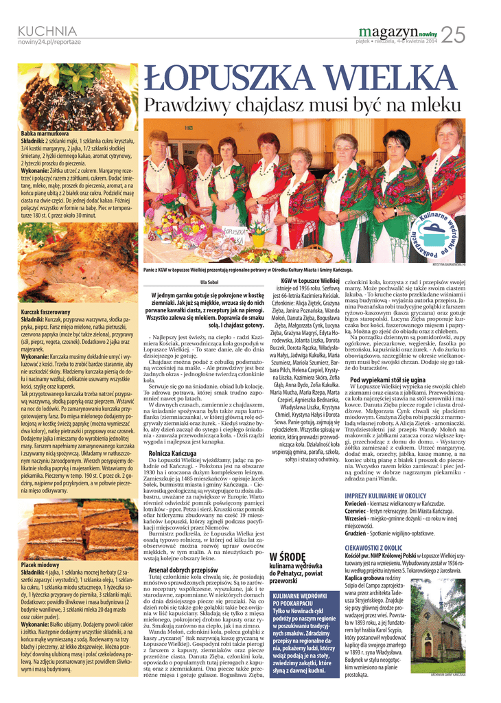 KUCHNIA piątek • niedziela, 4-6 kwietnia 2014 nowiny24.pl/reportaze 25 ŁOPUSZKA WIELKA Prawdziwy chajdasz musi być na mleku Babka marmurkowa Składniki: 2 szklanki mąki, 1 szklanka cukru kryształu, 3/4 kostki margaryny, 2 jajka, 1/2 szklanki słodkiej śmietany, 2 łyżki ciemnego kakao, aromat cytrynowy, 2 łyżeczki proszku do pieczenia. Wykonanie: Żółtka utrzeć z cukrem. Margarynę rozetrzeć i połączyć razem z żółtkami, cukrem. Dodać śmietanę, mleko, mąkę, proszek do pieczenia, aromat, a na końcu pianę ubitą z 2 białek oraz cukru. Podzielić masę ciasta na dwie części. Do jednej dodać kakao. Później połączyć wszystko w formie na babę. Piec w temperaturze 180 st. C przez około 30 minut. KRYSTYNA BARANOWSKA (4) Panie z KGW w Łopuszce Wielkiej prezentują regionalne potrawy w Ośrodku Kultury Miasta i Gminy Kańczuga. Ula Sobol Kurczak faszerowany Składniki: Kurczak, przyprawa warzywna, słodka papryka, pieprz. Farsz mięso mielone, natka pietruszki, czerwona papryka (może być także zielona), przyprawy (sól, pieprz, vegeta, czosnek). Dodatkowo 2 jajka oraz majeranek. Wykonanie: Kurczaka musimy dokładnie umyć i wyluzować z kości. Trzeba to zrobić bardzo starannie, aby nie uszkodzić skóry. Kładziemy kurczaka piersią do dołu i nacinamy wzdłuż, delikatnie usuwamy wszystkie kości, szyjkę oraz kuperek. Tak przygotowanego kurczaka trzeba natrzeć przyprawą warzywną, słodką papryką oraz pieprzem. Wstawić na noc do lodówki. Po zamarynowaniu kurczaka przygotowujemy farsz. Do mięsa mielonego dodajemy pokrojoną w kostkę świeżą paprykę (można wymieszać dwa kolory), natkę pietruszki i przyprawy oraz czosnek. Dodajemy jajka i mieszamy do wyrobienia jednolitej masy. Farszem napełniamy zamarynowanego kurczaka i zszywamy nicią spożywczą. Układamy w natłuszczonym naczyniu żaroodpornym. Wierzch posypujemy delikatnie słodką papryką i majerankiem. Wstawiamy do piekarnika. Pieczemy w temp. 190 st. C przez ok. 2 godziny, najpierw pod przykryciem, a w połowie pieczenia mięso odkrywamy. Placek miodowy Składniki: 4 jajka, 1 szklanka mocnej herbaty (2 saszetki zaparzyć i wystudzić), 1 szklanka oleju, 1 szklanka cukru, 1 szklanka miodu sztucznego, 1 łyżeczka sody, 1 łyżeczka przyprawy do piernika, 3 szklanki mąki. Dodatkowo: powidło śliwkowe i masa budyniowa (2 budynie waniliowe, 3 szklanki mleka 20 dag masła oraz cukier puder). Wykonanie: Białko ubijamy. Dodajemy powoli cukier i żółtka. Następnie dodajemy wszystkie składniki, a na końcu mąkę wymieszaną z sodą. Rozlewamy na trzy blachy i pieczemy, aż lekko zbrązowieje. Można przełożyć dowolną ulubioną masą i polać czekoladową polewą. Na zdjęciu posmarowany jest powidłem śliwkowym i masą budyniową. W jednym garnku gotuje się pokrojone w kostkę ziemniaki. Jak już są miękkie, wrzuca się do nich porwane kawałki ciasta, z receptury jak na pierogi. Wszystko zalewa się mlekiem. Doprawia do smaku solą. I chajdasz gotowy. - Najlepszy jest świeży, na ciepło - radzi Kazimiera Kościak, przewodnicząca koła gospodyń w Łopuszce Wielkiej. - To stare danie, ale do dnia dzisiejszego je gotuję. Chajdasz można podać z cebulką podsmażoną wcześniej na maśle. - Ale prawdziwy jest bez żadnych okras - jednogłośne twierdzą członkinie koła. Serwuje się go na śniadanie, obiad lub kolację. To zdrowa potrawa, której smak trudno zapomnieć nawet po latach. W dawnych czasach, zamiennie z chajdaszem, na śniadanie spożywana była także zupa kartoflanka (ziemniaczanka), w której główną rolę odgrywały ziemniaki oraz żurek. - Kiedyś ważne było, aby dzień zacząć do sytego i ciepłego śniadania - zauważa przewodnicząca koła. - Dziś rządzi wygoda i najlepsza jest kanapka. Rolnicza Kańczuga Do Łopuszki Wielkiej wjeżdżamy, jadąc na południe od Kańczugi. - Położona jest na obszarze 1930 ha i otoczona dużym kompleksem leśnym. Zamieszkuje ją 1485 mieszkańców - opisuje Jacek Sołek, burmistrz miasta i gminy Kańczuga. - Ciekawostką geologiczną są występujące tu złoża alabastru, uważane za największe w Europie. Warto również odwiedzić pomnik poświęcony pamięci lotników - ppor. Petza i sierż. Kruszki oraz pomnik ofiar hitleryzmu zbudowany na cześć 19 mieszkańców Łopuszki, którzy zginęli podczas pacyfikacji miejscowości przez Niemców. Burmistrz podkreśla, że Łopuszka Wielka jest osadą typowo rolniczą, w której od kilku lat zaobserwować można rozwój upraw owoców miękkich, w tym malin. A na nieużytkach powstają kolejne obszary leśne. Arsenał dobrych przepisów Tutaj członkinie koła chwalą się, że posiadają mnóstwo sprawdzonych przepisów. Są to zarówno receptury współczesne, wyszukane, jak i te starodawne, zapomniane. W niektórych domach do dnia dzisiejszego piecze się proziaki. Na co dzień robi się także gołe gołąbki: takie bez owijania w liść kapuściany. Składają się tylko z mięsa mielonego, pokrojonej drobno kapusty oraz ryżu. Smakują zarówno na ciepło, jak i na zimno. Wanda Mołoń, członkini koła, poleca gołąbki z kaszy „ryczanej” (tak nazywają kaszę gryczaną w Łopuszce Wielkiej). Gospodyni robi także pierogi z farszem z kapusty, ziemniaków oraz piecze przeróżne ciasta. Danuta Zięba, członkini koła, opowiada o popularnych tutaj pierogach z kapustą oraz z ziemniakami. Ona piecze także przeróżne mięsa i gotuje gulasze. Bogusława Zięba, KGW w Łopuszce Wielkiej istnieje od 1956 roku. Szefową jest 66-letnia Kazimiera Kościak. Członkinie: Alicja Ziętek, Grażyna Zięba, Janina Poznańska, Wanda Mołoń, Danuta Zięba, Bogusława Zięba, Małgorzata Cynk, Lucyna Zięba, Grażyna Magryś, Edyta Horodewska, Jolanta Liszka, Dorota Buczek, Dorota Rączka, Władysława Hałys, Jadwiga Kukułka, Maria Szumierz, Mariola Szumierz, Barbara Pilch, Helena Czepiel, Krystyna Liszka, Kazimiera Skóra, Zofia Głąb, Anna Dydo, Zofia Kukuł