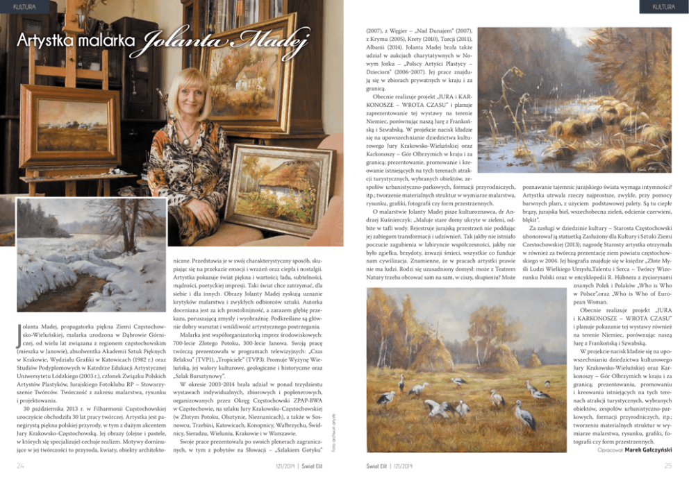 KULTURA J Jolanta Madej olanta Madej, propagatorka piękna Ziemi Częstochowsko-Wieluńskiej, malarka urodzona w Dąbrowie Górniczej, od wielu lat związana z regionem częstochowskim (mieszka w Janowie), absolwentka Akademii Sztuk Pięknych w Krakowie, Wydziału Grafi ki w Katowicach (1982 r.) oraz Studiów Podyplomowych w Katedrze Edukacji Artystycznej Uniwersytetu Łódzkiego (2003 r.), członek Związku Polskich Artystów Plastyków, Jurajskiego Fotoklubu RP – Stowarzyszenie Twórców. Twórczość z zakresu malarstwa, rysunku i projektowania. 30 października 2013 r. w Filharmonii Częstochowskiej uroczyście obchodziła 30 lat pracy twórczej. Artystka jest panegirystą piękna polskiej przyrody, w tym z dużym akcentem Jury Krakowsko-Częstochowską. Jej obrazy (olejne i pastele, w których się specjalizuje) cechuje realizm. Motywy dominujące w jej twórczości to przyroda, kwiaty, obiekty architekto- 24 (2007), z Węgier – „Nad Dunajem” (2007), z Krymu (2005), Krety (2010), Turcji (2011), Albanii (2014). Jolanta Madej brała także udział w aukcjach charytatywnych w Nowym Jorku – „Polscy Artyści Plastycy – Dzieciom” (2006‒2007). Jej prace znajdują się w zbiorach prywatnych w kraju i za granicą. Obecnie realizuje projekt „JURA i KARKONOSZE – WROTA CZASU” i planuje zaprezentowanie tej wystawy na terenie Niemiec, porównując naszą Jurę z Frankońską i Szwabską. W projekcie nacisk kładzie się na upowszechnianie dziedzictwa kulturowego Jury Krakowsko-Wieluńskiej oraz Karkonoszy – Gór Olbrzymich w kraju i za granicą; prezentowanie, promowanie i kreowanie istniejących na tych terenach atrakcji turystycznych, wybranych obiektów, zespołów urbanistyczno-parkowych, formacji przyrodniczych, itp.; tworzenie materialnych struktur w wymiarze malarstwa, rysunku, grafiki, fotografii czy form przestrzennych. O malarstwie Jolanty Madej pisze kulturoznawca, dr Andrzej Kuśnierczyk: „Maluje stare domy ukryte w zieleni, odbite w tafli wody. Rejestruje jurajską przestrzeń nie poddając jej zabiegom transformacji i udziwnień. Tak jakby nie istniało poczucie zagubienia w labiryncie współczesności, jakby nie było zgiełku, brzydoty, inwazji śmieci, wszystkie co funduje nam cywilizacja. Znamienne, że w pracach artystki prawie nie ma ludzi. Rodzi się uzasadniony domysł: może z Teatrem Natury trzeba obcować sam na sam, w ciszy, skupieniu? Może niczne. Przedstawia je w swój charakterystyczny sposób, skupiając się na przekazie emocji i wrażeń oraz ciepła i nostalgii. Artystka pokazuje świat piękna i wartości; ładu, subtelności, mądrości, poetyckiej impresji. Taki świat chce zatrzymać, dla siebie i dla innych. Obrazy Jolanty Madej zyskują uznanie krytyków malarstwa i zwykłych odbiorców sztuki. Autorka doceniana jest za ich prostolinijność, a zarazem głębię przekazu, poruszającą zmysły i wyobraźnię. Podkreślane są głównie dobry warsztat i wnikliwość artystycznego postrzegania. Malarka jest współorganizatorką imprez środowiskowych: 700-lecie Złotego Potoku, 300-lecie Janowa. Swoją pracę twórczą prezentowała w programach telewizyjnych: „Czas Relaksu” (TVP1), „Tropiciele” (TVP3). Promuje Wyżynę Wieluńską, jej walory kulturowe, geologiczne i historyczne oraz „Szlak Bursztynowy”. W okresie 2003‒2014 brała udział w ponad trzydziestu wystawach indywidualnych, zbiorowych i poplenerowych, organizowanych przez Okręg Częstochowski ZPAP-BWA w Częstochowie, na szlaku Jury Krakowsko-Częstochowskiej (w Złotym Potoku, Olsztynie, Nieznanicach), a także w Sosnowcu, Trzebini, Katowicach, Konopnicy, Wałbrzychu, Świdnicy, Sieradzu, Wieluniu, Krakowie i w Warszawie. Swoje prace prezentowała po swoich plenerach zagranicznych, w tym z pobytów na Słowacji – „Szlakiem Gotyku” 121/2014 | Świat Elit Foto: archiwum artystki Artystka malarka KULTURA Świat Elit | 121/2014 poznawanie tajemnic jurajskiego świata wymaga intymności? Artystka utrwala rzeczy najprostsze, zwykłe, przy pomocy barwnych plam, z użyciem podstawowej palety. Są tu ciepłe brązy, jurajska biel, wszechobecna zieleń, odcienie czerwieni, błękit”. Za zasługi w dziedzinie kultury – Starosta Częstochowski uhonorował ją statuetką Zasłużony dla Kultury i Sztuki Ziemi Czestochowskiej (2013); nagrodę Starosty artystka otrzymała w również za twórczą prezentację ziem powiatu częstochowskiego w 2004. Jej biografia znajduje się w księdze „Złote Myśli Ludzi Wielkiego Umysłu,Talentu i Serca – Twórcy Wizerunku Polski oraz w encyklopedii R. Hübnera z życiorysami znanych Polek i Polaków „Who is Who w Polsce”,oraz „Who is Who of European Woman. Obecnie realizuje projekt „JURA i KARKONOSZE – WROTA CZASU” i planuje pokazanie tej wystawy również na terenie Niemiec, porównując naszą Jurę z Frankońską i Szwabską. W projekcie nacisk kładzie się na upowszechnianiu dziedzictwa kulturowego Jury Krakowsko-Wieluńskiej oraz Karkonoszy – Gór Olbrzymich w kraju i za granicą; prezentowaniu, promowaniu i kreowaniu istniejących na tych terenach atrakcji turystycznych, wybranych obiektów, zespołów urbanistyczno-parkowych, formacji przyrodniczych, itp.; tworzeniu materialnych struktur w wymiarze malarstwa, rysunku, grafiki, fotografii czy form przestrzennych. Opracował: Marek Gałczyński 25