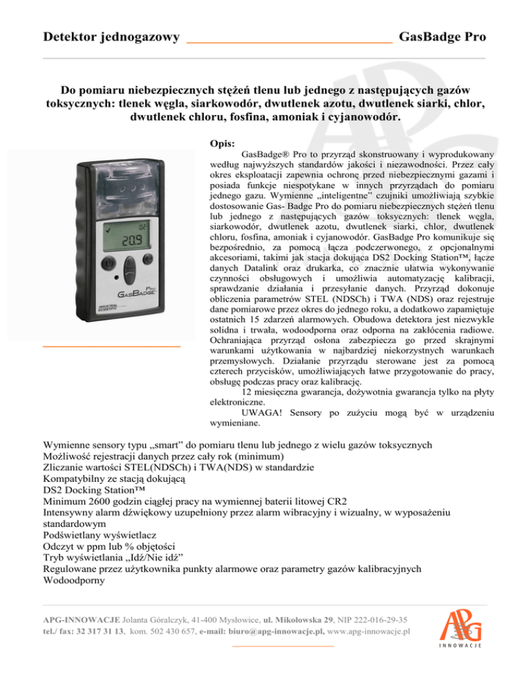 Detektor jednogazowy _________________________________ GasBadge Pro ______________________________________________________________ Do pomiaru niebezpiecznych stężeń tlenu lub jednego z następujących gazów toksycznych: tlenek węgla, siarkowodór, dwutlenek azotu, dwutlenek siarki, chlor, dwutlenek chloru, fosfina, amoniak i cyjanowodór. Opis: ______________________ GasBadge® Pro to przyrząd skonstruowany i wyprodukowany według najwyższych standardów jakości i niezawodności. Przez cały okres eksploatacji zapewnia ochronę przed niebezpiecznymi gazami i posiada funkcje niespotykane w innych przyrządach do pomiaru jednego gazu. Wymienne „inteligentne” czujniki umożliwiają szybkie dostosowanie Gas- Badge Pro do pomiaru niebezpiecznych stężeń tlenu lub jednego z następujących gazów toksycznych: tlenek węgla, siarkowodór, dwutlenek azotu, dwutlenek siarki, chlor, dwutlenek chloru, fosfina, amoniak i cyjanowodór. GasBadge Pro komunikuje się bezpośrednio, za pomocą łącza podczerwonego, z opcjonalnymi akcesoriami, takimi jak stacja dokująca DS2 Docking Station™, łącze danych Datalink oraz drukarka, co znacznie ułatwia wykonywanie czynności obsługowych i umożliwia automatyzację kalibracji, sprawdzanie działania i przesyłanie danych. Przyrząd dokonuje obliczenia parametrów STEL (NDSCh) i TWA (NDS) oraz rejestruje dane pomiarowe przez okres do jednego roku, a dodatkowo zapamiętuje ostatnich 15 zdarzeń alarmowych. Obudowa detektora jest niezwykle solidna i trwała, wodoodporna oraz odporna na zakłócenia radiowe. Ochraniająca przyrząd osłona zabezpiecza go przed skrajnymi warunkami użytkowania w najbardziej niekorzystnych warunkach przemysłowych. Działanie przyrządu sterowane jest za pomocą czterech przycisków, umożliwiających łatwe przygotowanie do pracy, obsługę podczas pracy oraz kalibrację. 12 miesięczna gwarancja, dożywotnia gwarancja tylko na płyty elektroniczne. UWAGA! Sensory po zużyciu mogą być w urządzeniu wymieniane. Wymienne sensory typu „smart” do pomiaru tlenu lub jednego z wielu gazów toksycznych Możliwość rejestracji danych przez cały rok (minimum) Zliczanie wartości STEL(NDSCh) i TWA(NDS) w standardzie Kompatybilny ze stacją dokującą DS2 Docking Station™ Minimum 2600 godzin ciągłej pracy na wymiennej baterii litowej CR2 Intensywny alarm dźwiękowy uzupełniony przez alarm wibracyjny i wizualny, w wyposażeniu standardowym Podświetlany wyświetlacz Odczyt w ppm lub % objętości Tryb wyświetlania „Idź/Nie idź” Regulowane przez użytkownika punkty alarmowe oraz parametry gazów kalibracyjnych Wodoodporny ___________________________________________________________________________________ APG-INNOWACJE Jolanta Góralczyk, 41-400 Mysłowice, ul. Mikołowska 29, NIP 222-016-29-35 tel./ fax: 32 317 31 13, kom. 502 430 657, e-mail: [email protected], www.apg-innowacje.pl ___________________ Detektor jednogazowy _________________________________ GasBadge Pro ______________________________________________________________ Dane techniczne: • OBUDOWA: Solidna, wodoodporna obudowa z poliwęglanu z ochronną nakładką. Odporna na zakłócenia radiowe. • WYMIARY: 94 mm x 50,8 mm x 27,9 mm • WAGA: 85 gramów • SENSORY: CO, H2S, O2, NO2, SO2, NH3, Cl2, ClO2, PH3, HCN • ZAKRESY POMIAROWE: zakres CO: 0-1500 ppm co 1 ppm; zakres H2S: 0-500 ppm co 0,1 ppm; zakres O2: 0-30% objętości co 0,1%; zakres NO2: 0-150 ppm co 0,1 ppm; zakres SO2: 0-150 ppm co 0,1 ppm zakres NH3: 0-100 ppm co 1 ppm zakres Cl2: 0-100 ppm co 0,1 ppm zakres ClO2: 0-1 ppm co 0,01 ppm zakres PH3: 0-10 ppm co 0,01 ppm zakres HCN: 0-30ppm co 0,1ppm • WYŚWIETLACZ: Specjalny wyświetlacz LCD z ikonami graficznymi dla ułatwienia obsługi. Segmentowe wyświetlanie bezpośrednich odczytów gazów. Podświetlenie do pracy w warunkach słabej widoczności. Tryb wyświetlania „Idź/Nie idź”. Odczyt stężeń szczytowych. • ALARMY: Wybierane przez użytkownika alarmy dolne i górne. Bardzo jasne diody LED, głośny alarm dźwiękowy (95 dB) i alarm wibracyjny • BATERIA: Wymienna bateria litowa CR2, 3V • CZAS PRACY: 2600 godzin (minimum) • REJESTRACJA ZDARZEŃ: Stale włączona. Rejestrowanie ostatnich 15 zdarzeń alarmowych, zapamiętywanie następujących danych: czas wystąpienia danego zdarzenia, czas trwania zdarzenia oraz odczyt szczytowy podczas tego zdarzenia. Zawartość rejestratora zdarzeń można przeglądać na komputerze lub drukować bezpośrednio z przyrządu na drukarkę wyposażoną w łącze podczerwone. • REJESTRACJA DANYCH: Jeden rok w odstępach co 1 minutę • ZAKRES TEMPERATUR: –40°C do 60°C, typowy, roboczy • ZAKRES WILGOTNOŚCI: 0-99% wilgotności względnej (bez kondensacji), typowy, roboczy • DOPUSZCZENIA: UL i cUL: Klasa I, Dział 1, Grupy A,B,C,D; T4 Klasa I, Strefa 0, AEx ia IIC T4 CSA: Klasa I, Dział 1, Grupy A,B,C,D; T4, Ex ia IIC T4 (w trakcie uzyskiwania) ATEX: Samoistne bezpieczeństwo: EEx ia I/IIC T4, Grupa i kategoria urządzeń: II 2G/IM, EMC: EN50270 Skuteczność: O2 (EN50104); CO, H2S, (EN45544) (w trakcie uz.) Australia: Ex ia I/IIC T4 (w trakcie uzyskiwania) IEC: Ex ia I/IIC T4 (w trakcie uzyskiwania) Rosja: dopuszczenie GOST-R (w trakcie uzyskiwania) MSHA: Samoistne bezpieczeństwo tylko dla mieszanin metan/ powietrze (w trakcie uzyskiwania) ___________________________________________________________________________________ APG-INNOWACJE Jolanta Góralczyk, 41-400 Mysłowice, ul. Mikołowska 29, NIP 222-016-29-35 tel./ fax: 32 317 31 13, kom. 502 430 657, e-mail: [email protected], www.apg-innowacje.pl ___________________