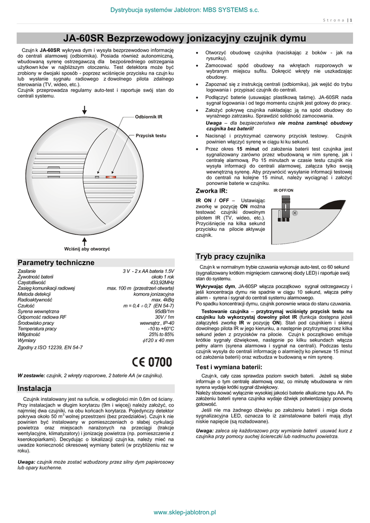Dystrybucja systemów Jablotron: MBS SYSTEMS s.c. S t r o n a |1 JA-60SR Bezprzewodowy jonizacyjny czujnik dymu Czujn k JA-60SR wykrywa dym i wysyła bezprzewodowo informację do centrali alarmowej (odbiornika). Posiada również autonomiczną, wbudowaną syrenę ostrzegawczą dla bezpośredniego ostrzegania użytkown ków w najbliższym otoczeniu. Test detektora może być zrobiony w dwojaki sposób - poprzez wciśnięcie przycisku na czujn ku lub wysłanie sygnału radiowego z dowolnego pilota zdalnego sterowania (TV, wideo, etc.). Czujnik przeprowadza regularny auto-test i raportuje swój stan do centrali systemu. Odbiornik IR Przycisk testu Otworzyć obudowę czujnika (naciskając z boków - jak na rysunku). Zamocować spód obudowy na wkrętach rozporowych w wybranym miejscu sufitu. Dokręcić wkręty nie uszkadzając obudowy. Zapoznać się z instrukcją centrali (odbiornika), jak wejść do trybu logowania i przypisać czujnik do centrali. Podłączyć baterie (usuwając plastikową taśmę). JA-60SR nada sygnał logowania i od tego momentu czujnik jest gotowy do pracy. Założyć pokrywę czujnika nakładając ją na spód obudowy do wyraźnego zatrzasku. Sprawdzić solidność zamocowania. Uwaga – dla bezpieczeństwa nie można zamknąć obudowy czujnika bez baterii! Nacisnąć i przytrzymać czerwony przycisk testowy. Czujnik powinien włączyć syrenę w ciągu ki ku sekund. Przez okres 15 minut od założenia baterii test czujnika jest sygnalizowany zarówno przez wbudowaną w nim syrenę, jak i centralę alarmową. Po 15 minutach w czasie testu czujnik nie wysyła informacji do centrali alarmowej, załącza tylko swoją wewnętrzną syrenę. Aby przywrócić wysyłanie informacji testowej do centrali na kolejne 15 minut, należy wyciągnąć i założyć ponownie baterie w czujniku. Zworka IR: IR OFF/ON IR ON / OFF – Ustawiąjąc zworkę w pozycję ON można testować czujniki dowolnym pilotem IR (TV, wideo, etc.). Przyciśnięcie na kilka sekund przycisku na pilocie aktywuje czujnik. Wciśnij aby otworzyć Tryb pracy czujnika Parametry techniczne Zasilanie Żywotność baterii Częstotliwość Zasięg komunikacji radiowej Metoda detekcji Radioaktywność Czułość Syrena wewnętrzna Odporność radiowa RF Środowisko pracy Temperatura pracy Wilgotność Wymiary Zgodny z ISO 12239, EN 54-7 3 V - 2 x AA bateria 1.5V około 1 rok 433,92MHz max. 100 m (przestrzeń otwarta) komora jonizacyjna max. 4kBq m = 0,4 0,7 (EN 54-7) 95dB/1m 30V / 1m wewnątrz , IP-40 -10 to +60°C 25% to 85% 120 x 40 mm Czujn k w normalnym trybie czuwania wykonuje auto-test, co 60 sekund (sygnalizowany krótkim mignięciem czerwonej diody LED) i raportuje swój stan do systemu. Wykrywając dym, JA-60SP włącza początkowo sygnał ostrzegawczy i jeśli koncentracja dymu nie spadnie w ciągu 10 sekund, włącza pełny alarm - syrena i sygnał do centrali systemu alarmowego. Po spadku koncentracji dymu, czujnik ponownie wraca do stanu czuwania. Testowanie czujnika – przytrzymaj wciśnięty przycisk testu na czujniku lub wykorzystaj dowolny pilot IR (funkcja dostępna jeżeli załączyłeś zworkę IR w pozycję ON). Stań pod czujnikiem i skieruj dowolnego pilota IR w jego kierunku, a następnie przytrzymaj przez kilka sekund jeden z przycisków na pilocie. Czujn k początkowo emituje krótkie sygnały dźwiękowe, następnie po kilku sekundach włącza pełny alarm (syrena alarmowa i sygnał na centrali). Podczas testu czujnik wysyła do centrali informację o alarmie(ty ko pierwsze 15 minut od założenia baterii) oraz wzbudza w budowaną w nim syrenę. Test i wymiana baterii: W zestawie: czujnik, 2 wkręty rozporowe, 2 baterie AA (w czujniku). Instalacja Czujnik instalowany jest na suficie, w odległości min 0,6m od ściany. Przy instalacjach w długim korytarzu (9m i więcej) należy założyć, co najmniej dwa czujniki, na obu końcach korytarza. Pojedynczy detektor pokrywa około 50 m3 wolnej przestrzeni (bez przedziałów). Czujn k nie powinien być instalowany w pomieszczeniach o słabej cyrkulacji powietrza oraz miejscach narażonych na przeciągi (trakcje wentylacyjne, klimatyzatory) i jonizację powietrza (np. pomieszczenie z kserokopiarkami). Decydując o lokalizacji czujn ka, należy mieć na uwadze konieczność okresowej wymiany baterii (w przybliżeniu raz w roku). Czujn k, cały czas sprawdza poziom swoich baterii. Jeżeli są słabe informuje o tym centralę alarmową oraz, co minutę wbudowana w nim syrena wydaje krótki sygnał dźwiękowy. Należy stosować wyłącznie wysokiej jakości baterie alkaliczne typu AA. Po założeniu baterii syrena czujnika wydaje dźwięk potwierdzający ponowną gotowość. Jeśli nie ma żadnego dźwięku po założeniu baterii i miga dioda sygnalizacyjna LED, oznacza to iż zainstalowane baterii mają zbyt niskie napięcie (są rozładowane). Uwaga: zaleca się każdorazowo przy wymianie baterii usuwać kurz z czujnika przy pomocy suchej ściereczki lub nadmuchu powietrza. Uwaga: czujnik może zostać wzbudzony przez silny dym papierosowy lub opary kuchenne. www.sklep-jablotron.pl