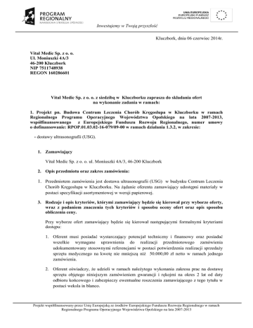 Inwestujemy w Twoją przyszłość Kluczbork, dnia 06 czerwiec 2014r. Vital Medic Sp. z o. o. Ul. Moniuszki 4A/3 46-200 Kluczbork NIP 7511748938 REGON 160286601 Vital Medic Sp. z o. o. z siedzibą w Kluczborku zaprasza do składania ofert na wykonanie zadania w ramach: 1. Projekt pn. Budowa Centrum Leczenia Chorób Kręgosłupa w Kluczborku w ramach Regionalnego Programu Operacyjnego Województwa Opolskiego na lata 2007-2013, współfinansowanego z Europejskiego Funduszu Rozwoju Regionalnego, numer umowy o dofinansowanie: RPOP.01.03.02-16-079/09-00 w ramach działania 1.3.2, w zakresie: - dostawy ultrasonografii (USG). 1. Zamawiający Vital Medic Sp. z o. o. ul. Moniuszki 4A/3, 46-200 Kluczbork 2. Opis przedmiotu oraz zakres zamówienia: 1. Przedmiotem zamówienia jest dostawa ultrasonografii (USG) w budynku Centrum Leczenia Chorób Kręgosłupa w Kluczborku. Na żądanie oferenta zamawiający udostępni materiały w postaci specyfikacji asortymentowej w wersji papierowej. 3. Rodzaje i opis kryteriów, którymi zamawiający będzie się kierował przy wyborze oferty, wraz z podaniem znaczenia tych kryteriów i sposobu oceny ofert oraz opis sposobu obliczenia ceny. Przy wyborze ofert zamawiający będzie się kierował następującymi formalnymi kryteriami dostępu: 1. Oferent musi posiadać wystarczający potencjał techniczny i finansowy oraz posiadać wszelkie wymagane uprawnienia do realizacji przedmiotowego zamówienia udokumentowany stosownymi referencjami w postaci potwierdzenia realizacji sprzedaży sprzętu medycznego na kwotę nie mniejszą niż 50.000,00 zł netto w ramach jednego zamówienia. 2. Oferent oświadczy, że udzieli w ramach należytego wykonania zakresu prac na dostawę sprzętu objętego niniejszym zamówieniem gwarancji i rękojmi na okres 2 lat od daty odbioru końcowego i zabezpieczy ewentualne roszczenia zamawiającego z tego tytułu w postaci weksla in blanco. Projekt współfinansowany przez Unię Europejską ze środków Europejskiego Funduszu Rozwoju Regionalnego w ramach Regionalnego Programu Operacyjnego Województwa Opolskiego na lata 2007-2013 Inwestujemy w Twoją przyszłość 3. Oferent oświadczy, że akceptuje sposób rozliczenia z zamawiającym należnych mu kwot z tytułu realizacji zamówienia i opatrzone terminem zapłaty nie krótszym niż 60 dni. 4. Oferent oświadczy, że jego oferta opiera się na jego własnej ocenie wymagań technicznych, a swoją ofertę oparł o stan faktyczny zawarty w udostępnionych na żądanie oferenta specyfikacji asortymentowej. Spełnienie powyższych formalnych kryteriów dostępu dopuszcza ofertę do oceny merytorycznej w której jedynym kryterium będzie cena netto za dostawę sprzętu objętego przedmiotowym zamówieniem. 1. Kryterium merytoryczne : cena netto - waga 100% Sposób oceny ofert: Zamawiający wybierze najtańszą ofertę spośród ofert zawierających całkowitą cenę netto. 4. Termin realizacji zamówienia 1. Dostawa urządzenia do dnia 30.06.2014r. 5. Miejsce, sposób i termin składania ofert Oferty powinny zostać doręczone do biura zamawiającego: Vital Medic Sp. z o.o. 46-200 Kluczbork, ul. Moniuszki 4A/3. Ponadto powinny być przesłane drogą mailową w wersji elektronicznej na adres mailowy: [email protected] Oferty należy złożyć w terminie do dnia 13.06.2014r. do godz. 15:00. 6. Opis warunków udziału w postępowaniu: Oferta musi zawierać minimum takie informacje jak: - dane oferenta, - dane zamawiającego, do którego skierowana jest oferta, - całkowitą cenę netto i brutto, - oświadczenia i referencje wymagane kryteriami formalnymi, - datę realizacji zamówienia, - datę ważności oferty nie krótszą niż 30 dni od daty sporządzenia oferty, - datę sporządzenia oferty, - podpis i pieczęć oferenta, - KRS lub wypis z rejestru ewidencji gospodarczej oferenta. Projekt współfinansowany przez Unię Europejską ze środków Europejskiego Funduszu Rozwoju Regionalnego w ramach Regionalnego Programu Operacyjnego Województwa Opolskiego na lata 2007-2013 Inwestujemy w Twoją przyszłość 7. Rozstrzygniecie postępowania i zlecenie realizacji zamówienia Postępowanie ofertowe zostanie rozstrzygnięte w dniu 16.06.2014r. do godz. 16.00. Po tym dniu na stronie internetowej zamawiającego www.vitalmedic.pl pojawi się informacja o wyborze najkorzystniejszej oferty. W przypadku pytań prosimy o kontakt na telefon 77 447 14 87. Zgodnie z art. 70¹ §3 KC, zamawiający zastrzega sobie prawo zmiany treści i warunków niniejszego ogłoszenia, także prawo odwołania niniejszego postępowania. Zarząd – Vital Medic Sp. z o.o. Projekt współfinansowany przez Unię Europejską ze środków Europejskiego Funduszu Rozwoju Regionalnego w ramach Regionalnego Programu Operacyjnego Województwa Opolskiego na lata 2007-2013