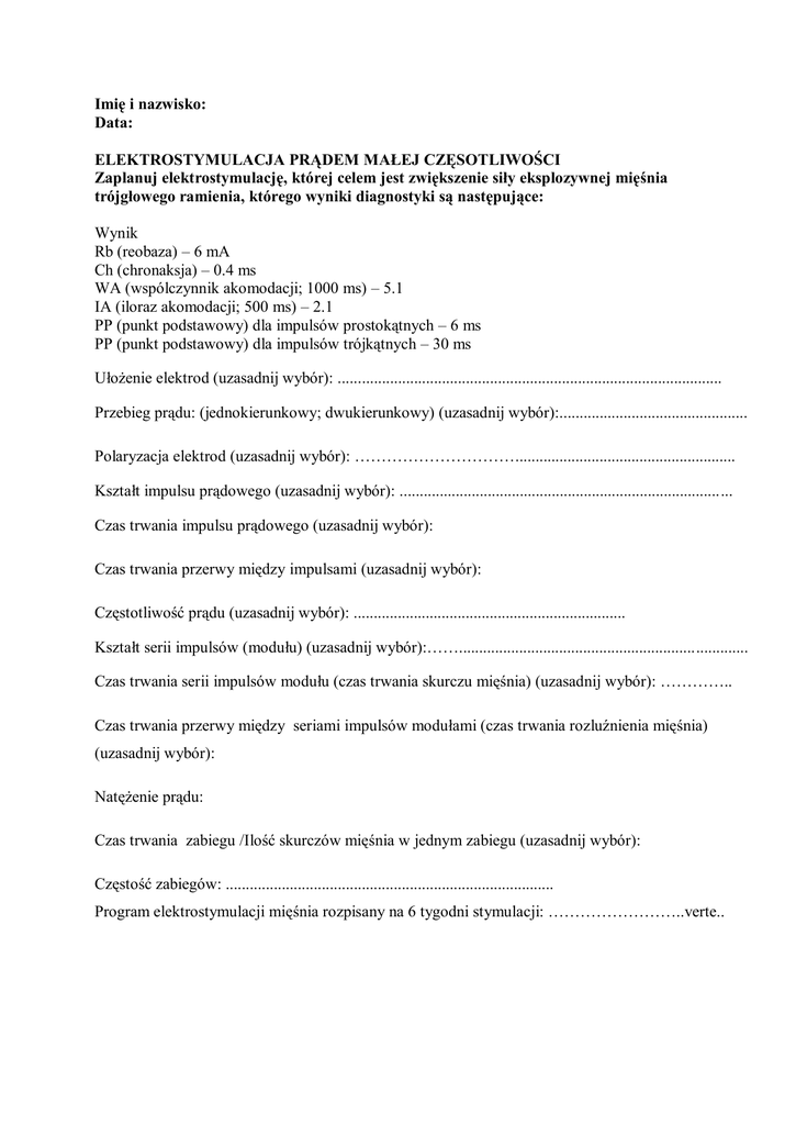 Imię i nazwisko: Data: ELEKTROSTYMULACJA PRĄDEM MAŁEJ CZĘSOTLIWOŚCI Zaplanuj elektrostymulację, której celem jest zwiększenie siły eksplozywnej mięśnia trójgłowego ramienia, którego wyniki diagnostyki są następujące: Wynik Rb (reobaza) – 6 mA Ch (chronaksja) – 0.4 ms WA (wspólczynnik akomodacji; 1000 ms) – 5.1 IA (iloraz akomodacji; 500 ms) – 2.1 PP (punkt podstawowy) dla impulsów prostokątnych – 6 ms PP (punkt podstawowy) dla impulsów trójkątnych – 30 ms Ułożenie elektrod (uzasadnij wybór): ................................................................................................ Przebieg prądu: (jednokierunkowy; dwukierunkowy) (uzasadnij wybór):............................................... Polaryzacja elektrod (uzasadnij wybór): …………………………....................................................... Kształt impulsu prądowego (uzasadnij wybór): ................................................................................... Czas trwania impulsu prądowego (uzasadnij wybór): Czas trwania przerwy między impulsami (uzasadnij wybór): Częstotliwość prądu (uzasadnij wybór): .................................................................... Kształt serii impulsów (modułu) (uzasadnij wybór):……........................................................................ Czas trwania serii impulsów modułu (czas trwania skurczu mięśnia) (uzasadnij wybór): ………….. Czas trwania przerwy między seriami impulsów modułami (czas trwania rozluźnienia mięśnia) (uzasadnij wybór): Natężenie prądu: Czas trwania zabiegu /Ilość skurczów mięśnia w jednym zabiegu (uzasadnij wybór): Częstość zabiegów: .................................................................................. Program elektrostymulacji mięśnia rozpisany na 6 tygodni stymulacji: ……………………..verte.. Imię i nazwisko: Data: ELEKTROSTYMULACJA PRĄDEM MAŁEJ CZĘSOTLIWOŚCI Zaplanuj elektrostymulację mięśnia dwugłowego uda (będącego w zaniku prostym), której celem jest zwiększenie wytrzymałości wysiłkowej mięśnia. Jego wyniki diagnostyki są następujące: Wynik Rb (reobaza) – 6 mA Ch (chronaksja) – 0.4 ms WA (wspólczynnik akomodacji; 1000 ms) – 5.2 IA (iloraz akomodacji; 500 ms) – 2.3 PP (punkt podstawowy) dla impulsów prostokątnych – 12 ms PP (punkt podstawowy) dla impulsów trójkątnych – 30 ms Ułożenie elektrod (uzasadnij wybór): ................................................................................................ Przebieg prądu: (jednokierunkowy; dwukierunkowy) (uzasadnij wybór):............................................... Polaryzacja elektrod (uzasadnij wybór): …………………………....................................................... Kształt impulsu prądowego (uzasadnij wybór): ................................................................................... Czas trwania impulsu prądowego (uzasadnij wybór): Czas trwania przerwy między impulsami (uzasadnij wybór): Częstotliwość prądu (uzasadnij wybór): .................................................................... Kształt serii impulsów (modułu) (uzasadnij wybór):……........................................................................ Czas trwania serii impulsów modułu (czas trwania skurczu mięśnia) (uzasadnij wybór): ………….. Czas trwania przerwy między seriami impulsów modułami (czas trwania rozluźnienia mięśnia) (uzasadnij wybór): Natężenie prądu: Czas trwania zabiegu /Ilość skurczów mięśnia w jednym zabiegu (uzasadnij wybór): Częstość zabiegów: .................................................................................. Program elektrostymulacji mięśnia rozpisany na 6 tygodni stymulacji: ……………………..verte..