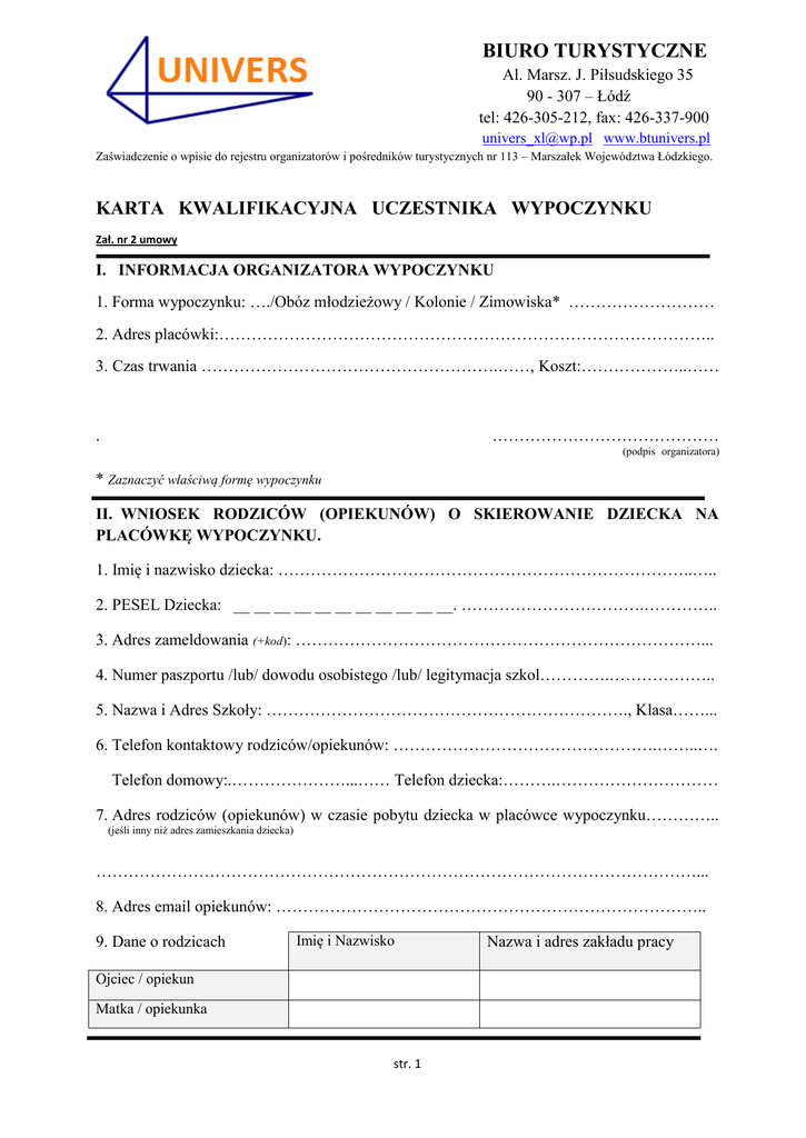 BIURO TURYSTYCZNE Al. Marsz. J. Piłsudskiego 35 90 - 307 – Łódź tel: 426-305-212, fax: 426-337-900 [email protected] www.btunivers.pl Zaświadczenie o wpisie do rejestru organizatorów i pośredników turystycznych nr 113 – Marszałek Województwa Łódzkiego. KARTA KWALIFIKACYJNA UCZESTNIKA WYPOCZYNKU Zał. nr 2 umowy I. INFORMACJA ORGANIZATORA WYPOCZYNKU 1. Forma wypoczynku: …./Obóz młodzieżowy / Kolonie / Zimowiska* ……………………… 2. Adres placówki:……………………………………………………………………………….. 3. Czas trwania ……………………………………………….……, Koszt:………………..…… …………………………………… . (podpis organizatora) * Zaznaczyć właściwą formę wypoczynku II. WNIOSEK RODZICÓW (OPIEKUNÓW) O SKIEROWANIE DZIECKA NA PLACÓWKĘ WYPOCZYNKU. 1. Imię i nazwisko dziecka: …………………………………………………………………..….. 2. PESEL Dziecka: __ __ __ __ __ __ __ __ __ __ __. …………………………….………….. 3. Adres zameldowania (+kod): …………………………………………………………………... 4. Numer paszportu /lub/ dowodu osobistego /lub/ legitymacja szkol………….……………….. 5. Nazwa i Adres Szkoły: …………………………………………………………., Klasa……... 6. Telefon kontaktowy rodziców/opiekunów: ………………………………………….……..…. Telefon domowy:.…………………...…… Telefon dziecka:……….………………………… 7. Adres rodziców (opiekunów) w czasie pobytu dziecka w placówce wypoczynku………….. (jeśli inny niż adres zamieszkania dziecka) …………………………………………………………………………………………………... 8. Adres email opiekunów: …………………………………………………………………….. 9. Dane o rodzicach Imię i Nazwisko Ojciec / opiekun Matka / opiekunka str. 1 Nazwa i adres zakładu pracy III. INFORMACJE O STANIE ZDROWIA DZIECKA (wypełnia rodzic/opiekun) 1. Przebyte choroby (podać w którym roku życia dziecka): odra…………., ospa wietrzna…………..., różyczka………….., świnka……….…, szkarlatyna……..….., żółtaczka zakaźna…………..., choroby nerek…….…, astma…..….., choroby reumatyczne……….., padaczka………….…., inne choroby (jakie?)………………………………………………………………………………, 2. Czy u dziecka występowały w okresie ostatnich 12 miesięcy lub występują obecnie: drgawki, utraty przytomności, omdlenia, częste bóle głowy, moczenie nocne, wymioty, anginy? ……………………………………………………………………………………………………, 3. Czy dziecko jest uczulone? Tak/Nie*, jeśli Tak proszę podać na co. …………………….... ……………………………………………………………………………………………………, 4. Czy dziecko nosi okulary, aparat ortopedyczny,………………………………………………, 5. Czy dziecko przyjmuje stale leki? Tak/Nie*. Jeśli tak to jakie i w jakich dawkach. ………., ……………………………………………………………………………………………………, 6. Dziecko jazdę autokarem znosi? Dobrze/Źle * 7. Inne uwagi o Dziecku: ………………………………………………………………………..., ……………………………………………………………………………………………………, …………………………………………………………………………………………………... . W razie zagrożenia życia dziecka zgadzam się na jego leczenie szpitalne, zabiegi diagnostyczne, operacje. Stwierdzam, że podałem/am wszystkie znane mi informacje o dziecku, które mogą pomóc w zapewnieniu mu właściwej opieki w czasie pobytu na placówce wypoczynku. Za zatajanie informacji o stanie zdrowia Biuro Turystyczne „UNIVERS” nie ponosi odpowiedzialności. …………………… ………………………...... (podpis rodziców/opiekunów) (data) * Podkreślić właściwą odpowiedź. IV. INFORMACJA O SZCZEPIENIACH (wypełnia pielęgniarka). 1. Szczepienia ochronne (podać rok): tężec……………………, Błonnica……………………., dur……………….., inne ……………………………………………………...…………………, 2. Stan skóry dziecka ………………………………..stan włosów…………………….……….., 3. Inne uwagi: …………………………………………………………………………..………. . ………………….. ………………………...... (podpis pielęgniarki) (data) str. 2 V. OPINIA SZKOŁY NA TEMAT UCZESTNIKA WYPOCZYNKU (wypełnia wychowawca) (W przypadku braku możliwości uzyskania opinii wychowawcy klasy – wypełnia rodzic lub opiekun) ……………………………………………………………………………………………………. ……………………………………………………………………………………………………. ……………………………………………………………………………………………………. ………………….. ………………………...... (data) (podpis wychowawcy lub rodzica/opiekuna ) VI. POTWIERDZENIE POBYTU DZIECKA W PLACÓWCE WYPOCZYNKU Dziecko przebywało na (forma i adres placówki wypoczynku)………………………………… ……………………………………………………………………………………………………. od dnia ……………………………………… do dnia ………………………………20……....r. ………………….. ….……………