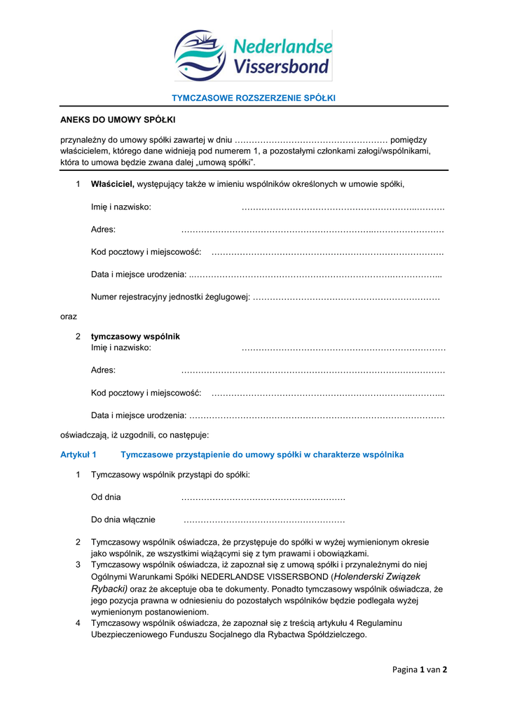 TYMCZASOWE ROZSZERZENIE SPÓŁKI ANEKS DO UMOWY SPÓŁKI przynależny do umowy spółki zawartej w dniu ……………………………………………… pomiędzy właścicielem, którego dane widnieją pod numerem 1, a pozostałymi członkami załogi/wspólnikami, która to umowa będzie zwana dalej „umową spółki”. 1 Właściciel, występujący także w imieniu wspólników określonych w umowie spółki, Imię i nazwisko: ……………………………………………………..………. …………………………………………………………..……………………. Adres: Kod pocztowy i miejscowość: ………………………………………………………………………. Data i miejsce urodzenia: ..…………………………………………………………….……………... Numer rejestracyjny jednostki żeglugowej: ………………………………………………………… oraz 2 tymczasowy wspólnik Imię i nazwisko: ……………………………………………………………… ………………………………………………………………………………… Adres: Kod pocztowy i miejscowość: ……………………………………………………………..………... Data i miejsce urodzenia: ……………………………………………………………………………… oświadczają, iż uzgodnili, co następuje: Artykuł 1 1 2 3 4 Tymczasowe przystąpienie do umowy spółki w charakterze wspólnika Tymczasowy wspólnik przystąpi do spółki: Od dnia …………………………………………………. Do dnia włącznie ………………………………………………… Tymczasowy wspólnik oświadcza, że przystępuje do spółki w wyżej wymienionym okresie jako wspólnik, ze wszystkimi wiążącymi się z tym prawami i obowiązkami. Tymczasowy wspólnik oświadcza, iż zapoznał się z umową spółki i przynależnymi do niej Ogólnymi Warunkami Spółki NEDERLANDSE VISSERSBOND (Holenderski Związek Rybacki) oraz że akceptuje oba te dokumenty. Ponadto tymczasowy wspólnik oświadcza, że jego pozycja prawna w odniesieniu do pozostałych wspólników będzie podlegała wyżej wymienionym postanowieniom. Tymczasowy wspólnik oświadcza, że zapoznał się z treścią artykułu 4 Regulaminu Ubezpieczeniowego Funduszu Socjalnego dla Rybactwa Spółdzielczego. Pagina 1 van 2 Artykuł 2 Okres przystąpienia do spółki W odniesieniu do tymczasowego wspólnika obowiązuje postanowienie, że stosunek w ramach spółki pomiędzy wspólnikami a tymczasowym wspólnikiem ma określony okres obowiązywania i że tymczasowy wspólnik wystąpi z tego stosunku w pierwszym porcie, do którego przybije jednostka rybacka po upływie następującego dnia: ………………………………………………………………… Artykuł 3 Udział w zysku netto 1. Tymczasowemu wspólnikowi w okresie, w którym przystępuje on do spółki, przysługuje prawo do następującego udziału procentowego w zysku netto: …………………………………………………………………..% 2. Udziały pozostałych wspólników zostaną proporcjonalnie pomniejszone o ten udział. Postanowienia zawarte w umowie spółki oraz przynależnych do niej Ogólnych Warunkach Spółki SFM w odniesieniu do podziału zysku netto obowiązują w pozostałym zakresie również w odniesieniu do tymczasowego wspólnika. Artykuł 4 1 2 Przesłanie kopii aneksu do umowy spółki Strony przesyłają odpis niniejszego podpisanego aneksu do umowy spółki e-mailem lub faksem do Funduszu Socjalnego dla Rybactwa Spółdzielczego celem zgłoszenia tymczasowego wspólnika do ubezpieczenia. Strony przesyłają odpis niniejszego podpisanego aneksu do umowy spółki e-mailem lub faksem do jednego lub większej liczby (bliższych) członków rodziny, znajomych i/lub doradców. Podpisano w ………………………………………………………………… w dniu …………………………. Właściciel Tymczasowy wspólnik Pagina 2 van 2