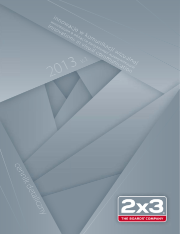 inn ин inn но ow ва ov ци ati ac ив on je об w ла s in 3 1 20 ko с ти mu v i s визуа n i k a u a льн c j i l c ых w o m ком i z u m u мун a l n 1 . n i c икац e j v a t i ий on nik cen zny alic det Spis treści StarBoard 3 Office 7 Education Boards 23 ecoBoards 27 AV Solutions 31 Marketing Display 41 StarBoard 3 1 20 v.1 Ostin StarBoard Flipcharty Flipchart Starboard Flipchart StarBoard to nowoczesny i elegancki design oraz perfekcyjna jakość wykonania. Powierzchnia suchościeralna lakierowana o właściwościach magnetycznych. Konstrukcja aluminiowa w kolorze srebrnym z czarnymi matowymi wykończeniami. Możliwość zawieszenia bloku w formacie A1 i EURO. Wbudowana w dolny profil tablicy półka z możliwością zamykania. Tablica mocowana na trójnożnym stojaku z możliwością regulacji wysokości do 185 cm. Dodatkowe ramiona boczne na arkusze papieru. Gwarancja: 2 lata na produkt, 10 lat na powierzchnię. Wymiary tablicy [cm] (szer. × wys.) Nr art. 2x3 71,5×108 cm (pow. całkowita) TFS04 71,5×108 cm (pow. całkowita) TFS01 Rozmiar [cm] (szer. × wys.) Nr art. 2x3 90×60 TSS96 166,00 120×90 TSS129 246,00 150×100 TSS1510 323,00 180×120 TSS1218 423,00 200×100 TSS1020 432,00 240×120 TSS1224 642,00 90×60 TSS96P3 253,00 120×90 TSS129P3 420,00 150×100 TSS1510P3 565,00 180×120 TSS1218P3 771,00 200×100 TSS1020P3 754,00 240×120 TSS1224P3 1008,00 Cena detaliczna netto PLN 450,00 Dostępny wkrótce. Flipchart Starboard mobilny Flipchart mobilny StarBoard to nowoczesny i elegancki design oraz perfekcyjna jakość wykonania. Powierzchnia suchościeralna lakierowana o właściwościach magnetycznych. Konstrukcja aluminiowa w kolorze srebrnym z czarnymi matowymi wykończeniami. Możliwość zawieszenia bloku w formacie A1 i EURO. Wbudowana w dolny profil tablicy półka z możliwością zamykania. Nowatorski mechanizm jezdny wbudowany w bazę oraz gumowa stopka gwarantująca stabilność. Dodatkowe ramiona boczne na arkusze papieru. Gwarancja: 2 lata na produkt, 10 lat na powierzchnię. 760,00 Dostępny wkrótce. Tablice suchościeralno-magnetyczne Cena detaliczna netto PLN Powierzchnia lakierowana Powierzchnia suchościeralna lakierowana o właściwościach magnetycznych. Rama aluminiowa w kolorze srebrnym z czarnymi matowymi wykończeniami. Dwie półki wbudowane w profil dolny tablicy. Tył tablicy wzmocniony blachą ocynkowaną. Mocowanie do ściany za pomocą zawieszek mocowanych do tylnej części profilu ramkowego oraz profilu bazy półki (istnieje możliwość montażu tablicy na bazie jedynie profilu ramkowego). W komplecie: elementy montażowe. Gwarancja: 2 lata na produkt, 10 lat na powierzchnię. Dostępne wkrótce. Powierzchnia ceramiczna Powierzchnia suchościeralna ceramiczna o właściwościach magnetycznych. Rama aluminiowa w kolorze srebrnym z czarnymi matowymi wykończeniami. Dwie półki wbudowane w profil dolny tablicy. Tył tablicy wzmocniony blachą ocynkowaną. Mocowanie do ściany za pomocą zawieszek mocowanych do tylnej części profilu ramkowego oraz profilu bazy półki (istnieje możliwość montażu tablicy na bazie jedynie profilu ramkowego). W komplecie: elementy montażowe. Gwarancja: 2 lata na produkt, dożywotnia na powierzchnię! Dostępne wkrótce. 4 www.2x3.pl cennik detaliczny 2013 StarBoard Planery Rozmiar [cm] (szer. × wys.) Nr art. 2x3 Cena detaliczna netto PLN 90×60 miesięczny TPS004** 235,00 120×90 miesięczny TPS007** 468,00 90×60 roczny TPS005*** 235,00 120×90 roczny TPS008*** 468,00 90×60 tygodniowy TPS003* 392,00 90×60 miesięczny TPS001** 392,00 90×60 roczny TPS002*** 392,00 Rozmiar [cm] (szer. × wys.) Nr art. 2x3 Cena detaliczna netto PLN 90×60 korkowa TCSSC96 143,00 120×90 korkowa TCSSC129 198,00 90×60 tekstylna TCSST96 143,00 120×90 tekstylna TCSST129 198,00 Rozmiar [cm] (szer. × wys.) Nr art. 2x3 Cena detaliczna netto PLN 90×60 TCS96 129,00 120×90 TCS129 173,00 150×100 TCS1510 221,00 180×120 TCS1218 276,00 200×100 TCS1020 296,00 Rozmiar [cm] (szer. × wys.) Nr art. 2x3 90×60 TTS96 131,00 120×90 TTS129 177,00 150×100 TTS1510 227,00 180×120 TTS1218 276,00 Powierzchnia lakierowana Nadruk planera wykonany na powierzchni suchościeralno-magnetycznej lakierowanej. Do planowania miesięcznego lub rocznego. Rama aluminiowa w kolorze srebrnym z czarnymi matowymi wykończeniami. Dwie półki wbudowane w profil dolny tablicy. Tył tablicy wzmocniony blachą ocynkowaną. Mocowanie do ściany za pomocą zawieszek mocowanych do tylnej części profilu ramkowego oraz profilu bazy półki (istnieje możliwość montażu tablicy na bazie jedynie profilu ramkowego). W komplecie: elementy montażowe. Gwarancja: 2 lata na produkt, 10 lat na powierzchnię. Dostępne wkrótce. Powierzchnia ceramiczna Nadruk planera wykonany na powierzchni suchościeralno-magnetycznej ceramicznej. Do planowania tygodniowego, miesięcznego lub rocznego. Rama aluminiowa w kolorze srebrnym z czarnymi matowymi wykończeniami. Dwie półki wbudowane w profil dolny tablicy. Tył tablicy wzmocniony blachą ocynkowaną. Mocowanie do ściany za pomocą zawieszek mocowanych do tylnej części profilu ramkowego oraz profilu bazy półki (istnieje możliwość montażu tablicy na bazie jedynie profilu ramkowego). W komplecie: elementy montażowe. Gwarancja: 2 lata na produkt, dożywotnia na powierzchnię! Dostępne wkrótce. Tablice Combi Powierzchnia suchościeralno-magnetyczna lakierowana, połączona za pomocą profilu aluminiowego z powierzchnią korkową lub tekstylną (w kolorze niebieskim lub popielatym). Rama aluminiowa w kolorze srebrnym z czarnymi matowymi wykończeniami. Dwie półki wbudowane w profil dolny tablicy. Tył tablicy wzmocniony blachą ocynkowaną. Mocowanie do ściany za pomocą zawieszek mocowanych do tylnej części profilu ramkowego oraz profilu bazy półki (istnieje możliwość montażu tablicy na bazie jedynie profilu ramkowego). W komplecie: elementy montażowe. Gwarancja: 2 lata na pr