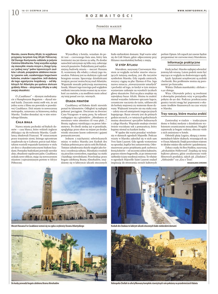 10 W W W.NOW YGORNIK.PL 16 –31 S I E R P N I A 2016 R O Z M A I T O Ś C I Podróże marzeń Oko na Maroko Maroko, zwane Bramą Afryki, to wyjątkowo przyjazny turystom kraj Afryki Północnej. Od Starego Kontynentu oddziela je jedynie Cieśnina Gibraltarska. Tutaj wszystko wydaje się niezwykłe: miasta niczym z „Księgi tysiąca i jednej nocy” pełne tajemniczych zaułków i uliczek, przepięknie zdobione meczety i gwarne suki, oszałamiające bogactwem kolorów, smaków i zapachów. Jeśli dodamy do tego egzotyczne krajobrazy – od błękitnych fal Atlantyku po spalone słońcem grzbiety Atlasu – otrzymamy Afrykę w całej swojej okazałości. O „Casablance” – słynnym melodramacie z Humphreyem Bogartem – słyszał niemal każdy. Znacznie mniej osób wie, że ani jedna scena z filmu nie powstała w prawdziwej Casablance. Dziś miasto to nowoczesna metropolia, uznawana za biznesową stolicę Maroka. Trudno doszukać się w nim orientalnego klimatu. C ała biała O sada piratów Casablancę od Rabatu dzieli niewiele ponad 80 kilometrów. Odległość tę najlepiej pokonać pociągiem. Docieram na dworzec Casa-Voyageurs w samą porę, by usłyszeć rozlegające się z głośników: „Mesdames et messieurs votre attention s'il vous plaît…”. Resztę zagłusza wjeżdżająca na peron lokomotywa. Po chwili siedzę już w przedziale, spoglądając przez okno na mijane po drodze wioski otoczone lasem cedrowym i gajami pomarańczowymi. Jednym z najchętniej odwiedzanych miejsc w stolicy Maroka jest Kasbah des Oudaias położona przy ujściu rzeki Bu Rakrak. Tutejsze zabudowania służyły niegdyś jako forteca i rezydencja sułtana. Mieszkańcy trudnili się pirackim rzemiosłem, napadając na statki i handlując niewolnikami. Przechodząc przez bogato zdobioną Bramę Almohadów, znajdziemy się w labiryncie uliczek otoczonych biało-niebieskimi domami. Stąd warto udać się do Café Maure, gdzie odpoczniemy przy filiżance marokańskiej herbaty z miętą. perfum Opium. Ich zapach już zawsze będzie przypominać mi czerwone mury Marrakeszu. Informacje praktyczne U stóp A tlasu Marrakesz, nazywany Czerwonym Miastem ze względu na kolor murów otaczających tutejszą medynę, jest dla turystów symbolem Maroka. Gdy zapada zmierzch, wszyscy ciągną na plac Djemaa el-Fna. Jego nazwa oznacza „stowarzyszenie umarłych” i pochodzi od tego, że kiedyś w tym miejscu wystawiano zatknięte na wysokich tyczkach głowy skazańców. Dziś na placu znajduje się największy bazar Afryki. Można tu znaleźć niemal wszystko: kolorowe spiczaste kapcie, ceramiczne naczynia do tażin, szklaneczki do herbaty miętowej czy misternie tkane dywany. Większość towarów nie ma stałej ceny – zależy ona od umiejętności negocjacyjnych kupującego. Bazar otwarty jest do późnych godzin nocnych, a w tutejszych garkuchniach można skosztować specjałów kulinarnych z całego Maroka. Wspaniale smakuje również świeżo wyciskany sok z pomarańczy, który kupimy niemal na każdym kroku. W upalne dni warto poszukać wytchnienia w słynnych ogrodach Majorelle. Podczas wizyty w Maroku zakochał się w nich sam Yves Saint Laurent. Gdy ogrody wystawiono na sprzedaż, kupił je bez zastanowienia. Odrestaurowany przez projektanta park zachwyca feerią kolorów – od soczystej zieleni kaktusów, poprzez różowe bugenwille, aż po intensywnie niebieskie ściany rezydencji mistrza. To właśnie w ogrodach Majorelle Saint Laurent znalazł inspirację do stworzenia swoich kultowych Kiedy jechać: Maroko najlepiej odwiedzić jesienią lub wiosną. Latem podróż może być męcząca ze względu na doskwierające upały. Język: Językami urzędowymi są arabski i berberski. Bez problemów można się porozumieć po francusku. Waluta: Dirham marokański; 1 dirham = 0,40 złotego. Wiza: Obywatele polscy są zwolnieni z obowiązku posiadania wizy w przypadku pobytu do 90 dni. Podczas przekraczania granicy turyści mogą być poproszeni o okazanie środków finansowych na czas wizyty w Maroku. Trzy rzeczy, które musisz zrobić Zamieszkaj w riadzie – tradycyjnym domu w feskiej medynie z dziedzińcem wyłożonym ceramicznymi mozaikami. Niegdyś zajmowały je bogate rodziny, obecnie wiele z nich zmieniono w hotele. Odwiedź plażę Legzira, słynącą z monumentalnych łuków skalnych, wrzynających się w Ocean Atlantycki. Dzięki porywistym wiatrom to idealne miejsce dla surferów i paralotniarzy. Zobacz osadę Ait Ben Haddou, nazywaną „afrykańskim Hollywood”. Znajdują się tutaj bajkowe plenery, gdzie zrealizowano wiele filmowych produkcji, takich jak „Gladiator”, „Aleksander” czy „Gra o Tron”. MAGDALENA CHROMIK MAGDALENA CHROMIK Nazwa miasta pochodzi od białych domów – casa blanca, które widzieli żeglarze zbliżający się do wybrzeży Maroka. Casablancę zbudowali Francuzi. W zniszczonym przez trzęsienie ziemi, którego epicentrum znajdowało się w Lizbonie, porcie nad Atlantykiem wznieśli wspaniałe kamienice w stylu art deco z charakterystycznymi białymi fasadami. Pomiędzy budynkami powstały szerokie aleje, obsadzone szpalerami palm. Casablanca zyskała nowe oblicze, stając się nowoczesnym miastem i najważniejszym portem w Afryce Północnej. Wyszedłszy z hotelu, wsiadam do petit taxi – czerwonego fiata uno, który lata świetności ma już dawno za sobą. Po drodze samochód zatrzymuje się kilka razy, zabierając nowych pasażerów. Podjeżdżamy pod najsłynniejszą budowlę miasta – meczet Hassana II, wzniesiony dla władcy z okazji jego 60. urodzin. Położony jest na skalistym cyplu nad brzegiem oceanu. Spacerując dziedzińcami świątyni, poczuć można bryzę znad Atlantyku. Wspaniałe mozaiki pokrywają marmurową fasadę. Minaret tego trzeciego pod względem wielkości meczetu świata wznosi się na wysokość 210 metrów, a na modlitwie może zebrać się tutaj ponad 100 tys. wiernych. Meczet Hassana II w Casablance wznosi się na cyplu u wy