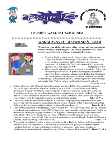 1 NUMER GAZETKI SZKOLNEJ ************************************************************ WAKACYJNYCH WSPOMNIEŃ CZAR Wakacje to czas, kiedy zwiedzamy różne ciekawe miejsca, poznajemy historię i kulturę innych krajów. Oto urocze zakątki świata, które urzekły naszych uczniów podczas wakacyjnych wojaży. Byłam w Turcji w miejscowości Alanya, która położona jest u wybrzeży Morza Śródziemnego. Widziałam Kizir Kule – wieżę z czerwonej cegły, jaskinię lądową Damla, a także jaskinie podwodne. Jak jedziecie do Turcji, nie zapomnijcie o kremie do opalania, bo są tam upały do C. Małgosia D. VI A Większą część wakacji w byłam w Anglii, w Londynie. Był to czas intensywnego zwiedzania. W pałacu Buckingham podziwiałam niezwykłe dzieła malarskie, a także pokoje królewskie. Widziałam też suknię ślubną księżnej Kate Middelton. Odbyłam wycieczkę do Stonehenge, historycznych głazów, a także wyprawę do malowniczego miasteczka Bath. To były jedne z moich najpiękniejszych wakacji. Marta M. VI A Byłam w Paryżu, stolicy Francji. Symbolem miasta jest wieża Eiffla. Aby podziwiać panoramę Paryża, dwa poziomy wieży zdobyłam, wchodząc po schodach, a na trzeci wjechałam windą. Zwiedziłam Katedrę Notre Dame, spacerowałam po wzgórzu Montmartre oraz podziwiałam Łuk Triumfalny wzniesiony za życia Napoleona. Główną atrakcją mojej wycieczki był Park Rozrywki Asterix – kraina francuskich bohaterów komiksów: Asterixa i Obelixa oraz Disneyland – bajkowy świat zabawy. Była to wspaniała wyprawa, spełnienie moich marzeń. Julia Sz. V A Tegoroczne wakacje spędziłam w Bułgarii i w Hiszpanii. Najprzyjemniej wspominam wieczorne spacery nad Morzem Czarnym oraz dzikie delfiny pływające tuż przy łódce w Zatoce Gibraltarskiej. Były to bardzo przyjemne wakacje, szkoda, że tak szybko się skończyły. Basia B. VI A 3 dni sierpnia spędziłam w Budapeszcie, stolicy Węgier. Był to wyjazd w nagrodę za zajęcie I miejsca w konkursie matematycznym „KANGUR”. Pierwsze co mnie uderzyło, to język węgierski. Trudno się porozumieć, bo nie jest to język słowiański. Na Węgrzech obowiązują forinty. Miasto przedziela rzeka Dunaj. Obie części Budapesztu się różnią. W Budzie widziałam zamek królewski, stare kamienice i urocze, stare uliczki. Peszt to głównie nowoczesne budowle i hotele. Zwiedziłam Wzgórze Gellerta , Basztę Rybacką i cudowne kościoły. Ania I. V A W tym roku na wakacjach byłem w słonecznym Sozopolu, w Bułgarii. Bułgaria to kraj wspaniałych widoków, więc jest co podziwiać. Chodziliśmy po starym mieście, poznając wszystkie zabytki i atrakcje. Podobały się nam charakterystyczne domy o kamienno – drewnianej zabudowie. Opalaliśmy się na pięknej plaży i kąpaliśmy się w Morzu Czarnym. Było wspaniale! Kamil N. VI A Każdy uczeń ma swoje miejsce w szkolnej hierarchii, która, przypomina układ szczebli w drabinie. Odpowiedz na kilka pytań, a dowiesz się, na jakim Ty jesteś szczeblu. 1. Jaki przedmiot w szkole przeraża cię najbardziej? a) matma b) polski c) wszystkie tak samo 2. Czy chętnie chodzisz do szkoły? a) nienawidzę szkoły b) zależy od dnia c) szkoła jest OK! Lubię do niej chodzić. 3. Masz kolegów poza szkołą? a) pewnie b) kilku c) raczej mam ze szkoły . Czy świadectwo z czerwonym paskiem jest w zasięgu Twoich możliwości? a) to żart? – pewnie, że nie! b) rodzice łudzą się, że tak c) jest 5. Czy masz ochotę zapaść się pod ziemię z powodu szkoły? a) chciałbym, żeby ona znikła b) czasem, jak każdy c) chyba nie ................. POLICZ, KTÓRYCH ODPOWIEDZI MASZ NAJWIĘCEJ: C – Jesteś wysoko w szkolnej hierarchii. Nie masz problemów ze szkołą, a szkoła nie ma z tobą. Dobrze się ustawiłeś / ustawiłaś. Tak trzymać! B – Różnie z tobą bywa. Raz twoje akcje są wyżej, a raz niżej. Nie masz ustalonej pozycji. Popracuj nad sobą. A – Znajdujesz się na jednym z dolnych szczebli. Szkoła nie należy do twoich przyjemności. Żeby zdać do następnej klasy, przed tobą dużo pracy. Tak więc powodzenia! **************************************************************************************** PREZYDENCJA POLSKI W UNII EUROPEJSKIEJ W naszym kraju jest wiele uroczych zakątków, które powinni zwiedzić turyści z Europy. Oto propozycja ucznia klasy IV A Patryka Budy: „TRÓJKĄT TRZECH CESARZY” – to miejsce, gdzie w latach 1846 – 1915 zbiegały się granice trzech europejskich mocarstw: Austrii, Prus i Rosji. Granica przebiegała przez Białą Przemszę, Czarną Przemszę i Przemszę. Obecnie są to tereny dwóch miast: Mysłowic i Sosnowca. Do czasu zakończenia I wojny światowej miejsce to było znane w całej Europie. Po rzece pływały statki wycieczkowe, można było podziwiać widoki z wieży znajdującej się w Mysłowicach. Po II wojnie światowej miejsce popadło w zapomnienie. Dopiero 2 maja 2 roku po wejściu Polski do U E na terenie „Trójkąta” spotkali się prezydenci Jaworzna , Sosnowca i Mysłowic – na pamiątkę tego wydarzenia postawiono tablicę. W przyszłości ma powstać platforma widokowa, a dookoła całego terenu ścieżki rowerowe. Wybudowane też będzie centrum historyczne. **************************************************************************************** 14 października obchodzimy Dzień Edukacji Narodowej. Tego dnia pamiętamy o naszych pedagogach i wychowawcach. Czego życzą nauczycielom z okazji ich święta uczniowie naszej szkoły? Z okazji Dnia Nauczyciela chciałbym podarować wszystkim Paniom bukiet róż i bombonierkę. Filip W. IV A W podziękowaniu za trudną pracę i wskazywanie właściwej drogi życzę nauczycielom dużo wytrwałości, sukcesów zawodowych oraz uśmiechu na każdy dzień. Wiktoria R. IVA Wszystkiego najlepszego! Chciałbym, aby nauczyciele pamiętali, że są przede wszystkim wychowawcami. Piotr R. VI B Życzę wszystkim nauczycielom dalszej owocnej pracy oraz samy