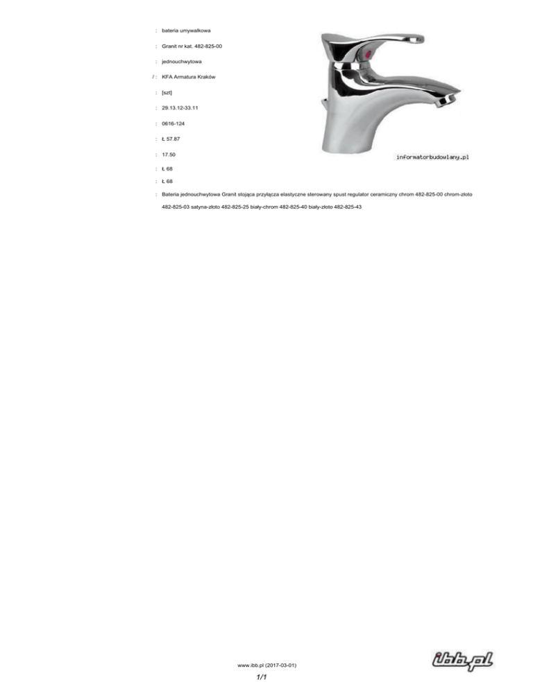 : bateria umywalkowa : Granit nr kat. 482-825-00 : jednouchwytowa / : KFA Armatura Kraków : [szt] : 29.13.12-33.11 : 0616-124 : Ł 57.87 : 17.50 : Ł 68 : Ł 68 : Bateria jednouchwytowa Granit stojąca przyłącza elastyczne sterowany spust regulator ceramiczny chrom 482-825-00 chrom-złoto 482-825-03 satyna-złoto 482-825-25 biały-chrom 482-825-40 biały-złoto 482-825-43 www.ibb.pl (2017-03-01) 1/1