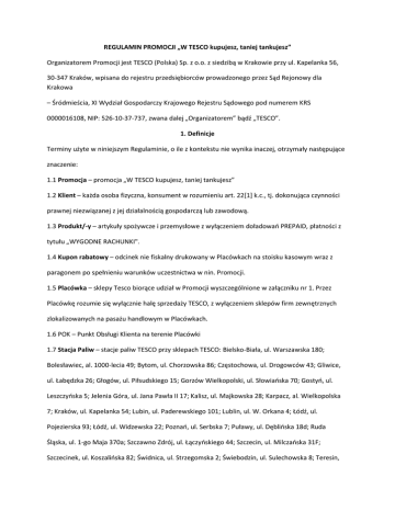 REGULAMIN PROMOCJI „W TESCO kupujesz, taniej tankujesz” Organizatorem Promocji jest TESCO (Polska) Sp. z o.o. z siedzibą w Krakowie przy ul. Kapelanka 56, 30-347 Kraków, wpisana do rejestru przedsiębiorców prowadzonego przez Sąd Rejonowy dla Krakowa – Śródmieścia, XI Wydział Gospodarczy Krajowego Rejestru Sądowego pod numerem KRS 0000016108, NIP: 526-10-37-737, zwana dalej „Organizatorem” bądź „TESCO”. 1. Definicje Terminy użyte w niniejszym Regulaminie, o ile z kontekstu nie wynika inaczej, otrzymały następujące znaczenie: 1.1 Promocja – promocja „W TESCO kupujesz, taniej tankujesz” 1.2 Klient – każda osoba fizyczna, konsument w rozumieniu art. 22[1] k.c., tj. dokonująca czynności prawnej niezwiązanej z jej działalnością gospodarczą lub zawodową. 1.3 Produkt/-y – artykuły spożywcze i przemysłowe z wyłączeniem doładowań PREPAID, płatności z tytułu „WYGODNE RACHUNKI". 1.4 Kupon rabatowy – odcinek nie fiskalny drukowany w Placówkach na stoisku kasowym wraz z paragonem po spełnieniu warunków uczestnictwa w nin. Promocji. 1.5 Placówka – sklepy Tesco biorące udział w Promocji wyszczególnione w załączniku nr 1. Przez Placówkę rozumie się wyłącznie halę sprzedaży TESCO, z wyłączeniem sklepów firm zewnętrznych zlokalizowanych na pasażu handlowym w Placówkach. 1.6 POK – Punkt Obsługi Klienta na terenie Placówki 1.7 Stacja Paliw – stacje paliw TESCO przy sklepach TESCO: Bielsko-Biała, ul. Warszawska 180; Bolesławiec, al. 1000-lecia 49; Bytom, ul. Chorzowska 86; Częstochowa, ul. Drogowców 43; Gliwice, ul. Łabędzka 26; Głogów, ul. Piłsudskiego 15; Gorzów Wielkopolski, ul. Słowiańska 70; Gostyń, ul. Leszczyńska 5; Jelenia Góra, ul. Jana Pawła II 17; Kalisz, ul. Majkowska 28; Karpacz, al. Wielkopolska 7; Kraków, ul. Kapelanka 54; Lubin, ul. Paderewskiego 101; Lublin, ul. W. Orkana 4; Łódź, ul. Pojezierska 93; Łódź, ul. Widzewska 22; Poznań, ul. Serbska 7; Puławy, ul. Dęblińska 18d; Ruda Śląska, ul. 1-go Maja 370a; Szczawno Zdrój, ul. Łączyńskiego 44; Szczecin, ul. Milczańska 31F; Szczecinek, ul. Koszalińska 82; Świdnica, ul. Strzegomska 2; Świebodzin, ul. Sulechowska 8; Teresin, Teresin - Gaj 11; Tychy, ul. Towarowa 2; Warszawa, ul. Górczewska 212/226; Warszawa, ul. Stalowa 60/64; Wrocław, ul. Długa 37/47; Zielona Góra, ul. Energetyków 2A 1.8 Paliwo – paliwo napędowe do pojazdów mechanicznych sprzedawane na Stacji paliw: etylina Pb95, etylina Pb98, Olej Napędowy, Gaz Płynny LPG. Za paliwo nie uznaje się gazu sprzedawanego w butlach. 1.9 Rabat za zakupy w TESCO („Rabat/-y”) – upust o wartości 0,05 zł przyznawany do każdego pełnego zakupionego litra/decymetra sześciennego (LPG) paliwa, po spełnieniu warunku dokonania w Placówce zakupu/-ów odpowiednio w Hipermarketach na kwotę minimum 100 zł brutto, a w Supermarketach na kwotę minimum 50 zł brutto i zeskanowaniu karty ClubCard zarejestrowanego/ych na jednym paragonie fiskalnym. Rabat można łączyć z rabatem, o którym mowa w pkt 1.10, na warunkach określonych w niniejszym Regulaminie. 1.10 Rabat z kartą Visa Clubcard/MasterCard Clubcard („Rabat/-y”) - Upust o wartości 0,05 zł brutto przyznawany do każdego zakupionego litra/decymetra sześciennego (LPG) paliwa przy każdej płatności pełnej sumy rachunku za paliwo na Stacji Paliw, dokonanej kartą Visa Clubcard/MasterCard Clubcard. Rabat można łączyć z rabatem, o którym mowa w pkt 1.9, na warunkach określonych w niniejszym Regulaminie. 1.11 Regulamin – niniejszy Regulamin. 2. Zasady Promocji 2.1. Promocja ma na celu wsparcie sprzedaży Paliwa na Stacji Paliw poprzez udzielanie Rabatu na zakup Paliwa na Stacji Paliw. UWAGA: Akcją nie jest objęty serwis internetowy TESCO E-Zakupy 2.2. Promocja trwa od 10.04.2014 r. do odwołania Promocji, w tym okresie będą wydawane Kupony rabatowe w Placówkach oraz będą realizowane na Stacjach Paliw. 2.3. Rabaty przyznawane do każdego pełnego zakupionego litra/decymetra sześciennego Paliwa (LPG)na Stacjach Paliw. 2.4. Rabat za zakupy w Placówkach Tesco jest przyznawany po spełnieniu warunku dokonania zakupu Produktów odpowiednio w Hipermarketach na kwotę minimum 100 zł brutto, a w Supermarketach na kwotę minimum 50 zł brutto z użyciem karty ClubCard, udokumentowanego na jednym paragonie fiskalnym. 2.5. Osoby, które na Stacji Paliw zapłacą za Paliwo kartą kredytową Visa Clubcard/MasterCard Clubcard niezależnie od Rabatu za zakupy w Tesco uzyskają dodatkowo Rabat z kartą Visa Clubcard/MasterCard Clubcard - zgodnie z punktem 3.4 lit. b) niniejszego Regulaminu. 2.6. Tankowanie może odbywać się tylko do jednego zbiornika paliwowego pojazdu. Pojemność zbiornika jest limitem górnym otrzymywanego rabatu. Rabat nie będzie udzielony w przypadku tankowania do kanistra lub przy jednoczesnym tankowaniu do zbiornika paliwowego pojazdu i kanistra. 2.7. Klient realizuje Kupon rabatowy w kasie Stacji Paliw podczas płatności za zakupione Paliwo. 2.8. Aby zrealizować Kupon rabatowy Klient zobowiązany jest na początku transakcji okazać kasjerowi Stacji Paliw paragon, stanowiący dowód dokonania w Placówkach zakupów na kwotę, co najmniej 100lub 50 zł, brutto w dniach trwania Promocji. Kasjer odbiera paragon, odcina część niefiskalną z Kuponem rabatowym i zachowuje w kasie; pozostała część paragonu jest zwracana Klientowi. 2.9. W sytuacji, gdy Klient za zakupy w Placówce otrzymuje fakturę VAT, Kupon rabatowy z paragonu zostaje odcięty i przyczepiony do faktury VAT. Klient korzystający z Promocji na początku transakcji przekazuje kasjerowi Stacji Paliw fakturę VAT z dołączonym Kuponem rabatowym. Kasjer ma obowiązek odczepić kupon od faktury. 2.10. Aby otrzymać Rabat z kartą Visa Clubcard/MasterCard Clubcard Klient zobowiązany jest zapłacić za Paliwo zakupione na Stacji Paliw (pełna wartość tankowania) kartą Visa Clubcard/MasterCard Clubcard. Rabat